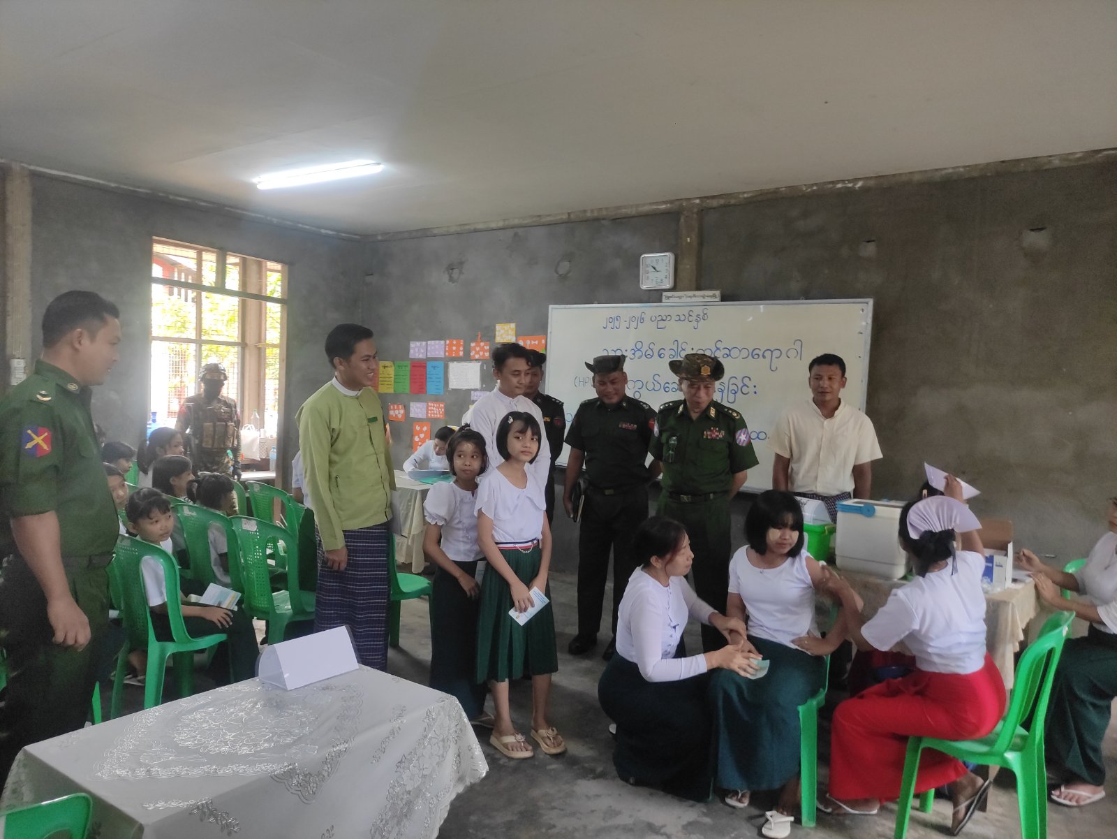ထို့နောက်အသက် ၉ နှစ်ပြည့်ပြီး ၁၀ နှစ်မကျော်သော ကျောင်းသူ Grade-3 မှ ၁၄ ဦးနှင့် Grade-4 မှ ၅၅ဦးတို့အား သားအိမ်ခေါင်းကင်ဆာရောဂါကာကွယ်ဆေး (HPV)ထိုးနှံပေးခြင်းနှင့် အသက် ၅ နှစ်ပြည့်ပြီး ၇ နှစ်မကျော်သော KG ကျောင်းသား၊ ကျောင်းသူ၄၆ဦးတို့အား ဆုံဆို့မေးခိုင်ရောဂါကာကွယ်ဆေး (DT)ထိုးနှံပေးနေမှုကိုရေးမြို့နယ်၊ တပ်နယ်မှူးဗိုလ်မှူးကြီး ကောင်းဇော်မြင့်၊ (ခေတ္တ)ခရိုင်စီမံခန့်ခွဲရေးနှင့်အုပ်ချုပ်ရေးကော်မတီဥက္ကဋ္ဌ ဒုတိယဗိုလ်မှူးကြီး အောင်ဇင်လတ်နှင့်အဖွဲ့ဝင်များ၊ မြို့နယ်စီမံခန့်ခွဲရေးနှင့်အုပ်ချုပ်ရေးကော်မတီဥက္ကဋ္ဌ မြို့နယ်အုပ်ချုပ်ရေးမှူး ဦးကျော်မျိုးနိုင်နှင့်အဖွဲ့ဝင်များ၊ ဌာနဆိုင်ရာတာဝန်ရှိသူများက လိုက်လံကြည့်ရှုပြီး အားပေးစကားပြောကြားခဲ့သည်။