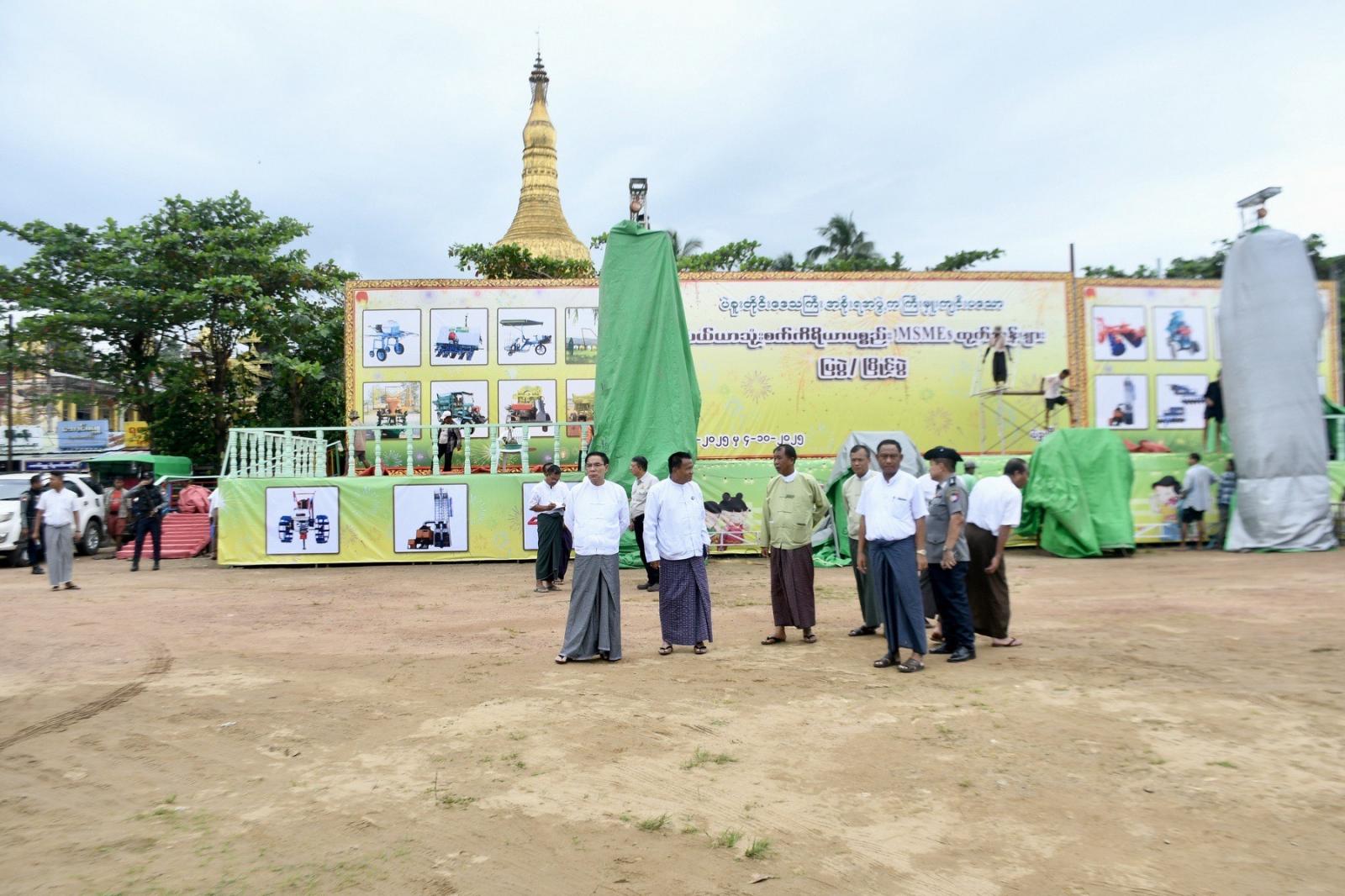 ဆက်လက်၍ တိုင်းဒေသကြီး ဝန်ကြီးချုပ် ဦးမျိုးဆွေဝင်းသည် ပဲခူးတိုင်းဒေသကြီးအစိုးရအဖွဲ့မှ ဦးဆောင်၍ အောက်တိုဘာလ(၂)ရက်နေ့တွင် ပဲခူးမြို့၊ ရှေးဟောင်းသမိုင်းဝင်ရွှေမော်ဓော စေတီတော်မြတ်ကြီး ယာဉ်ရပ်နားဝန်း၌ MSMEs လယ်ယာသုံးစက်ကိရိယာ ပစ္စည်းထုတ်ကုန် များ ပြပွဲ/ပြိုင်ပွဲ ကျင်းပပြုလုပ်မည့် နေရာသို့ရောက်ရှိခဲ့ပြီး ဆိုင်ခန်းများနှင့် ခင်းကျင်း ပြသထားသည့် လယ်ယာသုံးစက်ပစ္စည်းများအား လှည့်လည်ကြည့်ရှုစစ်ဆေးခဲ့ပြီး လိုအပ်သည်များ လမ်းညွှန်မှာကြားခဲ့သည်။