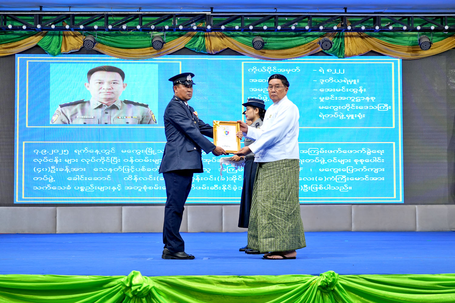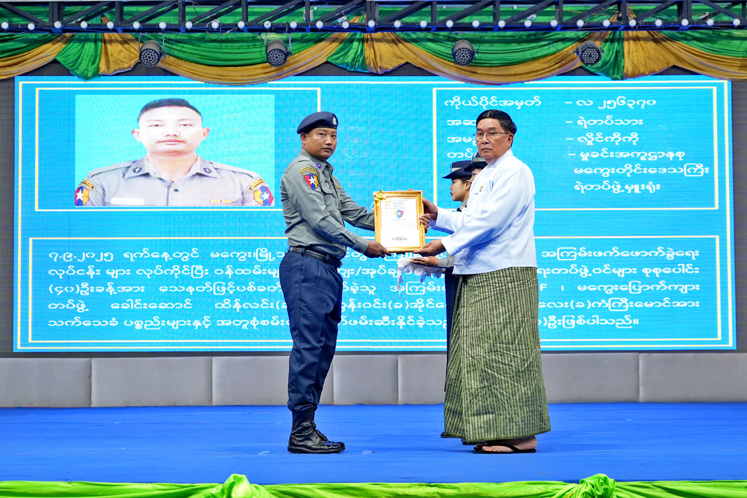 ဆက်လက်ပြီး မကွေးတိုင်းဒေသကြီးရဲတပ်ဖွဲ့နယ်မြေအတွင်း ထူးခြားမှုခင်းများ ဖော်ထုတ်နိုင်ခဲ့သည့် ရဲတပ်ဖွဲ့ဝင်များ လုံခြုံရေးနှင့် တရားဥပဒေစိုးမိုးရေးအတွက် အကြမ်းဖက်ချေမှုန်းရေး ဆောင်ရွက်စဉ် သောင်းကျန်းသူနှင့် အကြမ်းဖက် PDF အဖွဲ့များထံမှရန်သူ့အလောင်း၊ လက်နက်/ခဲယမ်း၊ မိုင်းနှင့် ဆက်စပ်ပစ္စည်းများ သိမ်းဆည်းရမိအောင် စွမ်းစွမ်းတမံဆောင်ရွက်နိုင်ခဲ့သည့် ရဲတပ်ဖွဲ့ဝင်များအား တိုင်းဒေသကြီးဝန်ကြီးချုပ် ဦးတင့်လွင်၊ တပ်မတော်အရာရှိကြီးများ၊ တရားသူကြီးချုပ်ဒေါ်မိမိမော်၊ အဖွဲ့ဝင်ဝန်ကြီးများနှင့် တိုင်းဒေသကြီးရဲတပ်ဖွဲ့မှူး၊ ရဲမှူးကြီး ကျော်စိုးဝင်းတို့က ဂုဏ်ထူးဆောင် တံဆိပ်များနှင့် ဂုဏ်ပြုဆုငွေများ ချီးမြှင့်ပေးအပ်ခဲ့သည်။