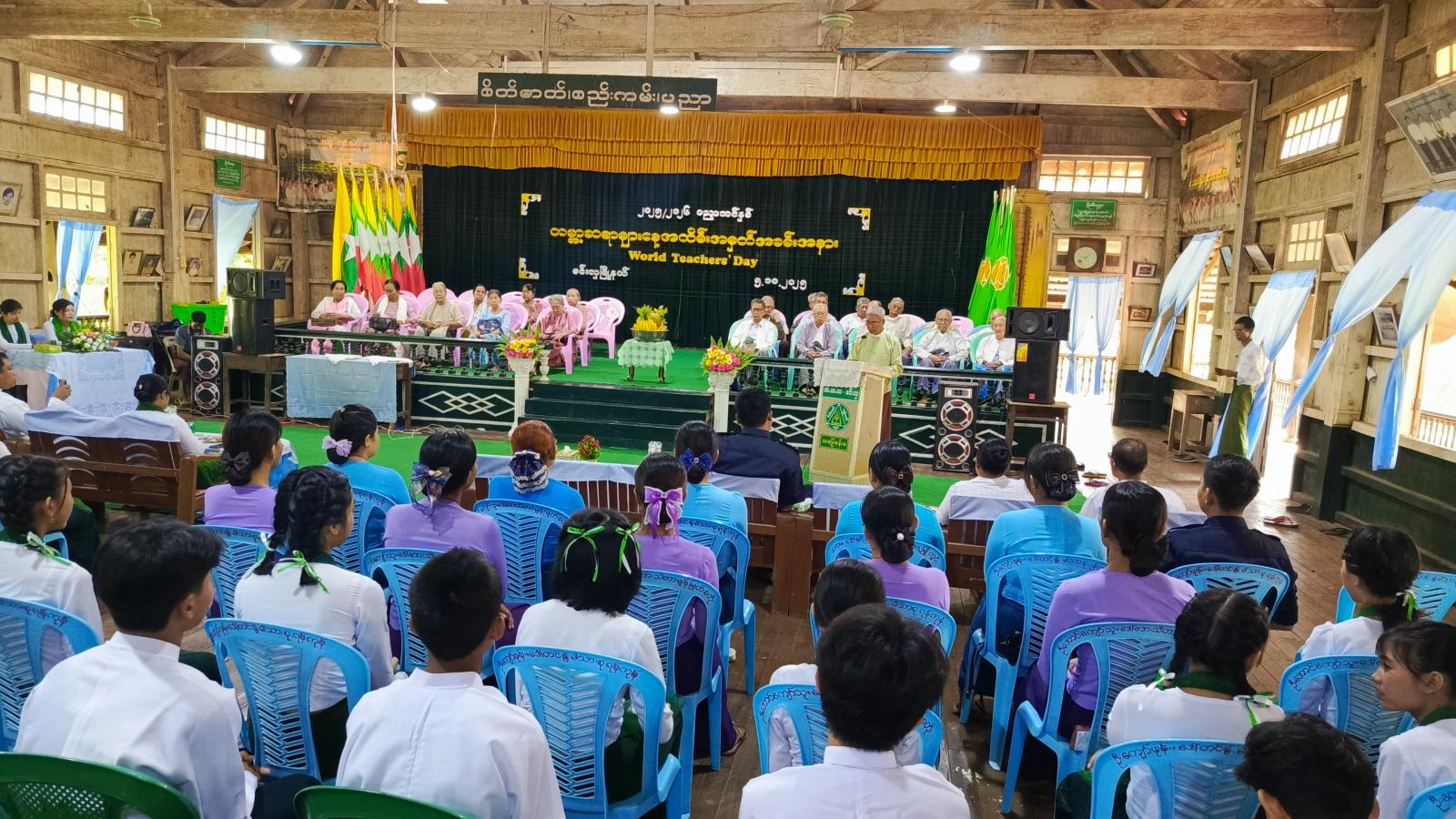 ကမ္ဘာ့ဆရာများနေ့အခမ်းအနားကို မြတ်ဆရာသီချင်းဖြင့် သီဆိုဖွင့်လှစ်ပေးခဲ့ပြီး ပြည်ထောင်စုသမ္မတမြန်မာနိုင်ငံတော်ယာယီသမ္မတ နိုင်ငံတော်လုံခြုံရေးနှင့် အေးချမ်းသာယာရေး ကော်မရှင်ဥက္ကဋ္ဌ ဗိုလ်ချုပ်မှူးကြီး သတိုးမဟာသရေစည်သူ သတိုးသီရိသုဓမ္မ မင်းအောင်လှိုင်ထံမှ ကမ္ဘာ့ဆရာများနေ့ အထိမ်းအမှတ်အခမ်းအနားသို့ပေးပို့သည့် သဝဏ်လွှာကို မြို့နယ်စီမံခန့်ခွဲရေးနှင့် အုပ်ချုပ်ရေးကော်မတီအဖွဲ့ဝင် ဦးလှဌေးက ဖတ်ကြားသည်။