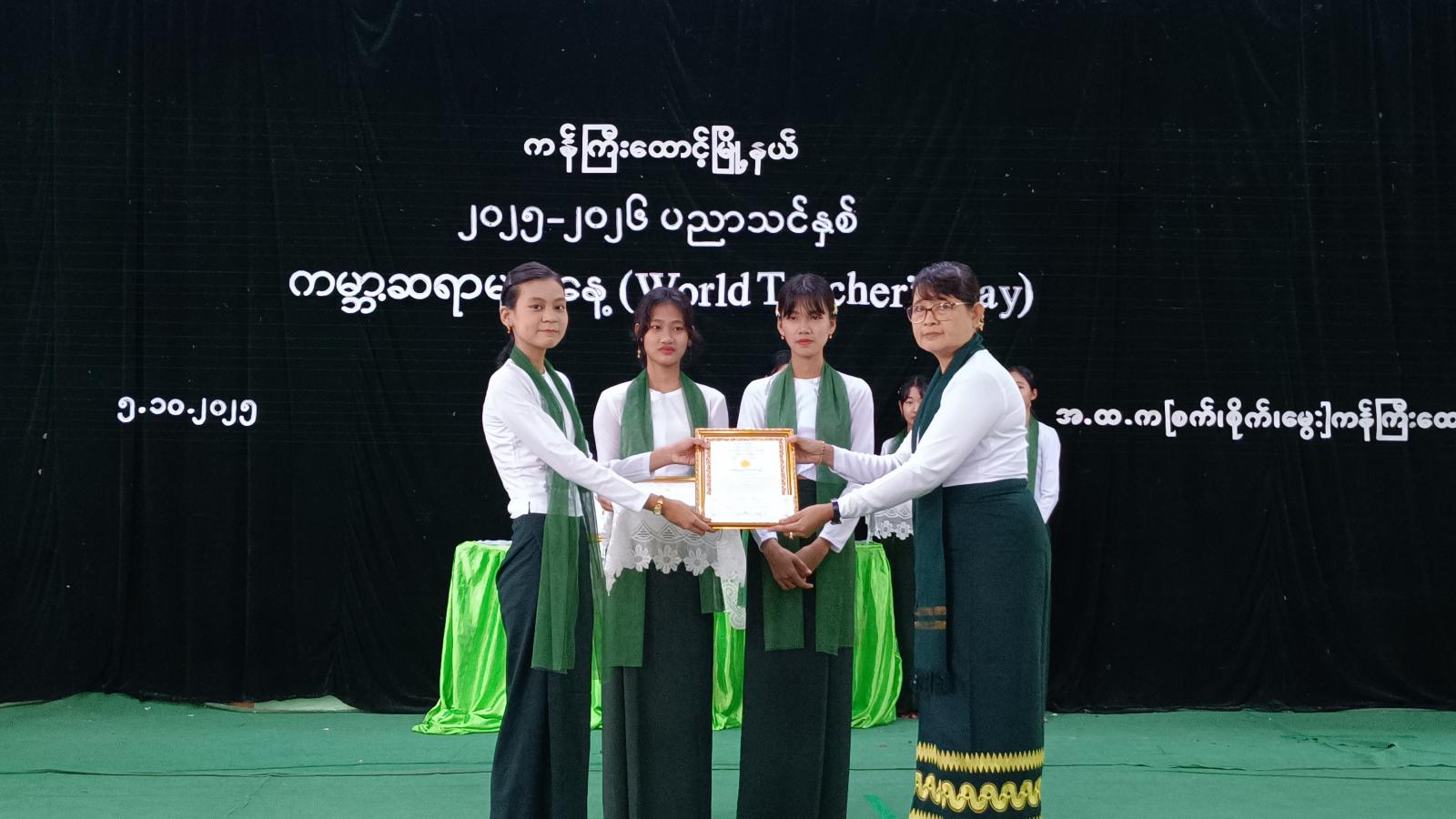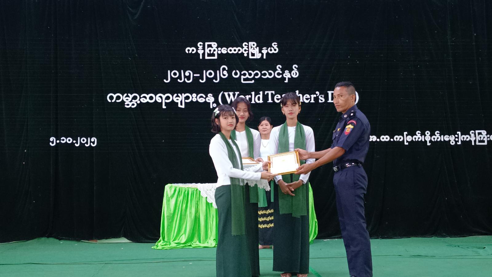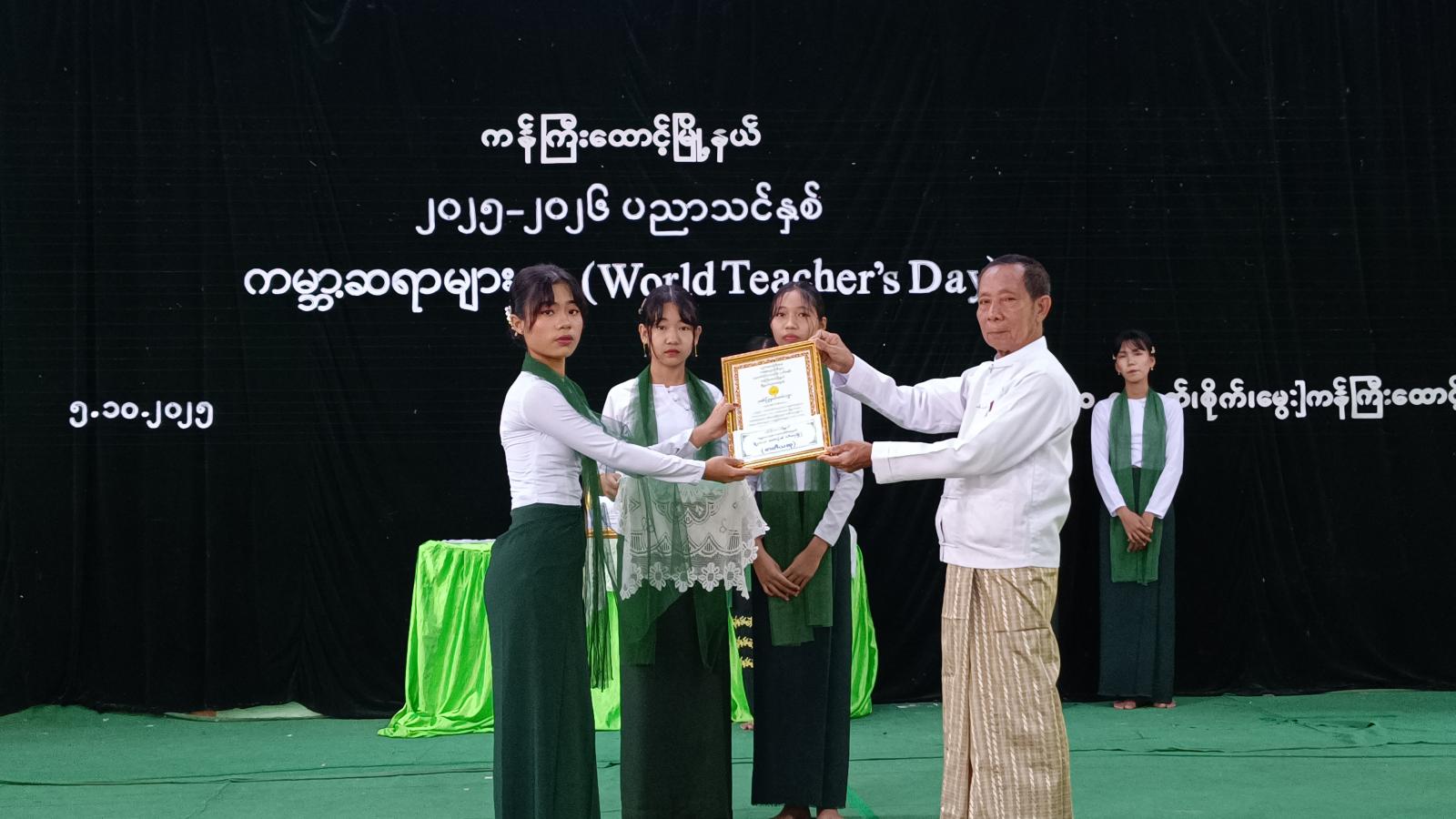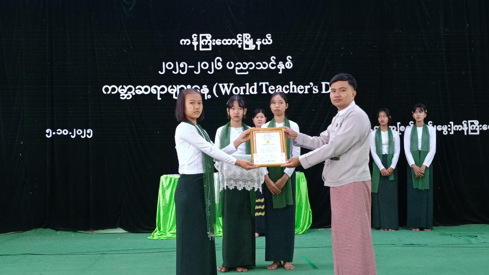 အခမ်းအနားတွင် အခြေခံပညာနှင့် စက်မှု၊ စိုက်ပျိုး၊ မွေးမြူရေးအထက်တန်းကျောင်းရှိ ကျောင်းသား၊ ကျောင်းသူများက “မြန်မာ့ကျောင်း”သီချင်းဖြင့် အခမ်းအနားအား ဖွင့်လှစ်ပေး ခဲ့ကြပြီး ပြည်ထောင်စုသမ္မတမြန်မာနိုင်ငံတော် ယာယီသမ္မတနိုင်ငံတော်လုံခြုံရေးနှင့် အေးချမ်းသာယာရေးကော်မရှင်ဥက္ကဋ္ဌ ဗိုလ်ချုပ်မှူးကြီး သတိုးမဟာသရေစည်သူသတိုးသီရိသုဓမ္မ မင်းအောင်လှိုင်ထံမှ ကမ္ဘာ့ဆရာများနေ့ အထိမ်းအမှတ်အခမ်းအနားသို့ပေးပို့သည့် သဝဏ်လွှာအား မြို့နယ်စီမံခန့်ခွဲရေးနှင့်အုပ်ချုပ်ကော်မတီအဖွဲ့ဝင် ဦးလှမြင့်က ဖတ်ကြားသည်။ ထို့နောက် “ကမ္ဘာ့ဆရာများနေ့” အထိမ်းအမှတ် အထက်တန်းဆင့်၊ အလယ်တန်းဆင့် စာစီစာကုံးနှင့်ကဗျာပြိုင်ပွဲတွင် ဆုရရှိကြသူများအား တာဝန်ရှိသူများကဆုများ ပေးအပ်ချီးမြှင့်ခဲ့ကြပြီး အခြေခံပညာနှင့် စက်မှု၊ စိုက်ပျိုး၊ မွေးမြူရေးအထက်တန်းကျောင်းရှိ ကျောင်းသားလေးက “မြတ်ဆရာ”သီချင်းအားသီဆိုပူဇော်သည်။