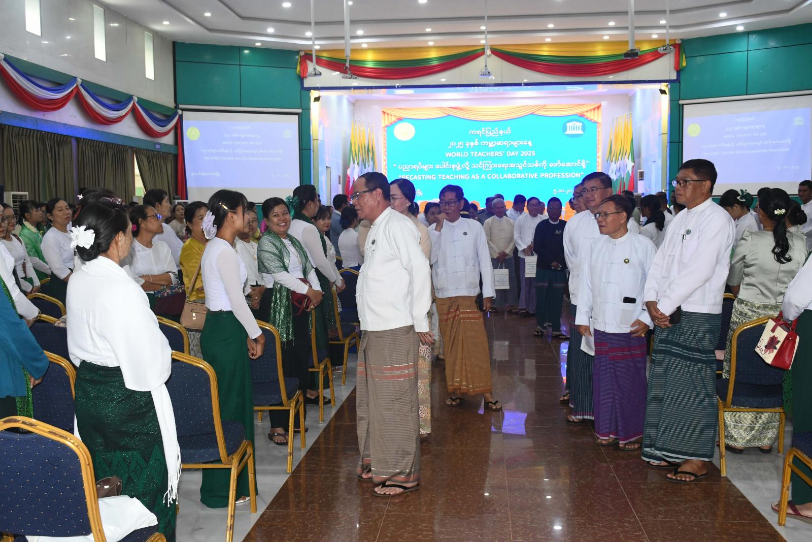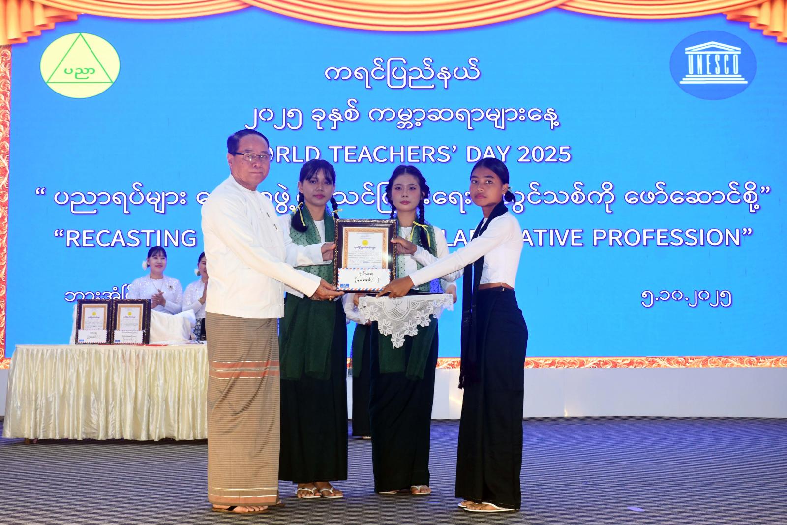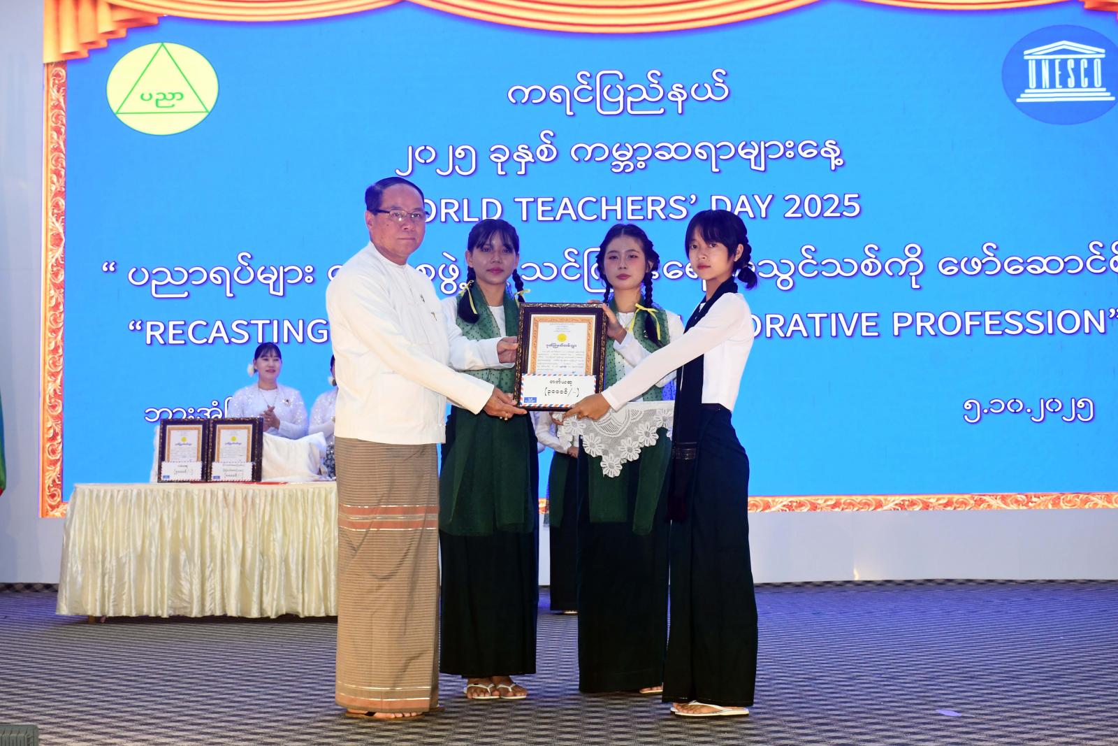 ယင်းနောက် ပြည်နယ်ဝန်ကြီးချုပ်၊ ပြည်နယ်အမျိုးသမီးရေးရာအဖွဲ့နှင့် မိခင်နှင့်ကလေး စောင့်ရှောက်မှုကြီးကြပ်ရေးကော်မတီနာယက၊ ပြည်နယ်တရားလွှတ်တော်တရားသူကြီးချုပ်၊ ပြည်နယ်အစိုးရအဖွဲ့ဝင်များက အငြိမ်းစားဆရာကြီး၊ ဆရာမကြီးများအား ဂါရဝလက်ဆောင်များပေးအပ်ကာ ကမ္ဘာ့ဆရာများနေ့အထိမ်းအမှတ် အထက်တန်းအဆင့်နှင့်အလယ်တန်းအဆင့် စာစီစာကုံးပြိုင်ပွဲ၊ ကဗျာပြိုင်ပွဲများတွင် ဆုရရှိကြသူများအား ဂုဏ်ပြုဆုများ ပေးအပ်ချီးမြှင့်ကြသည်။