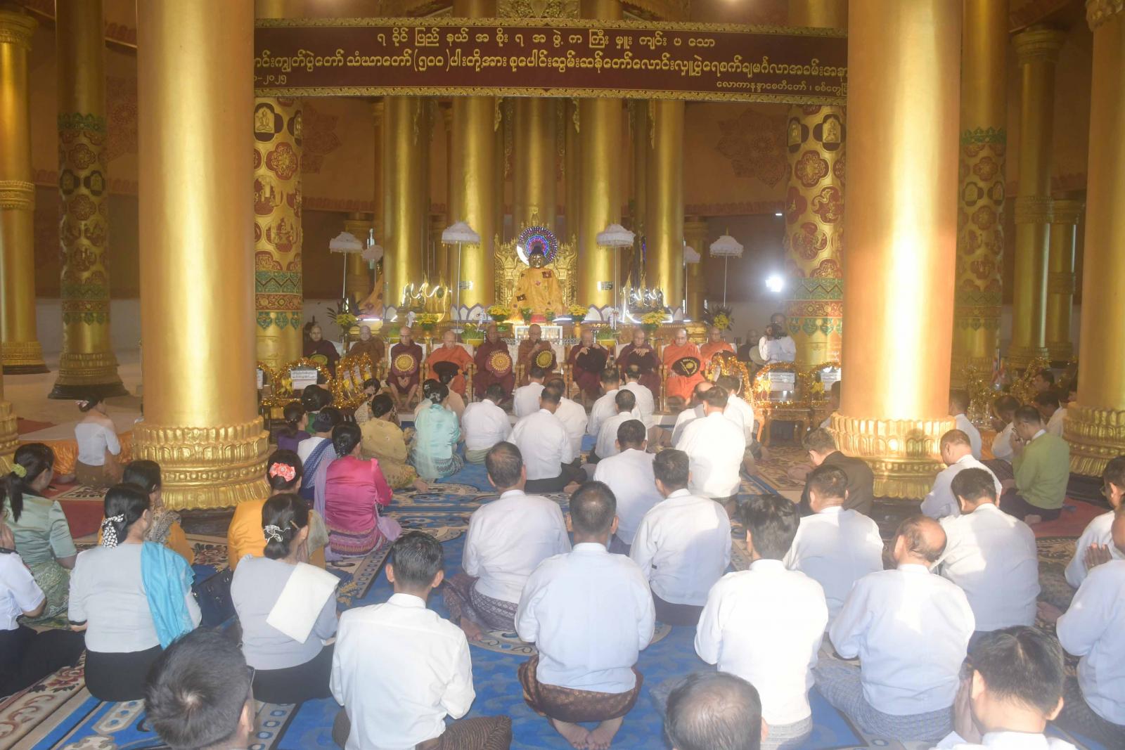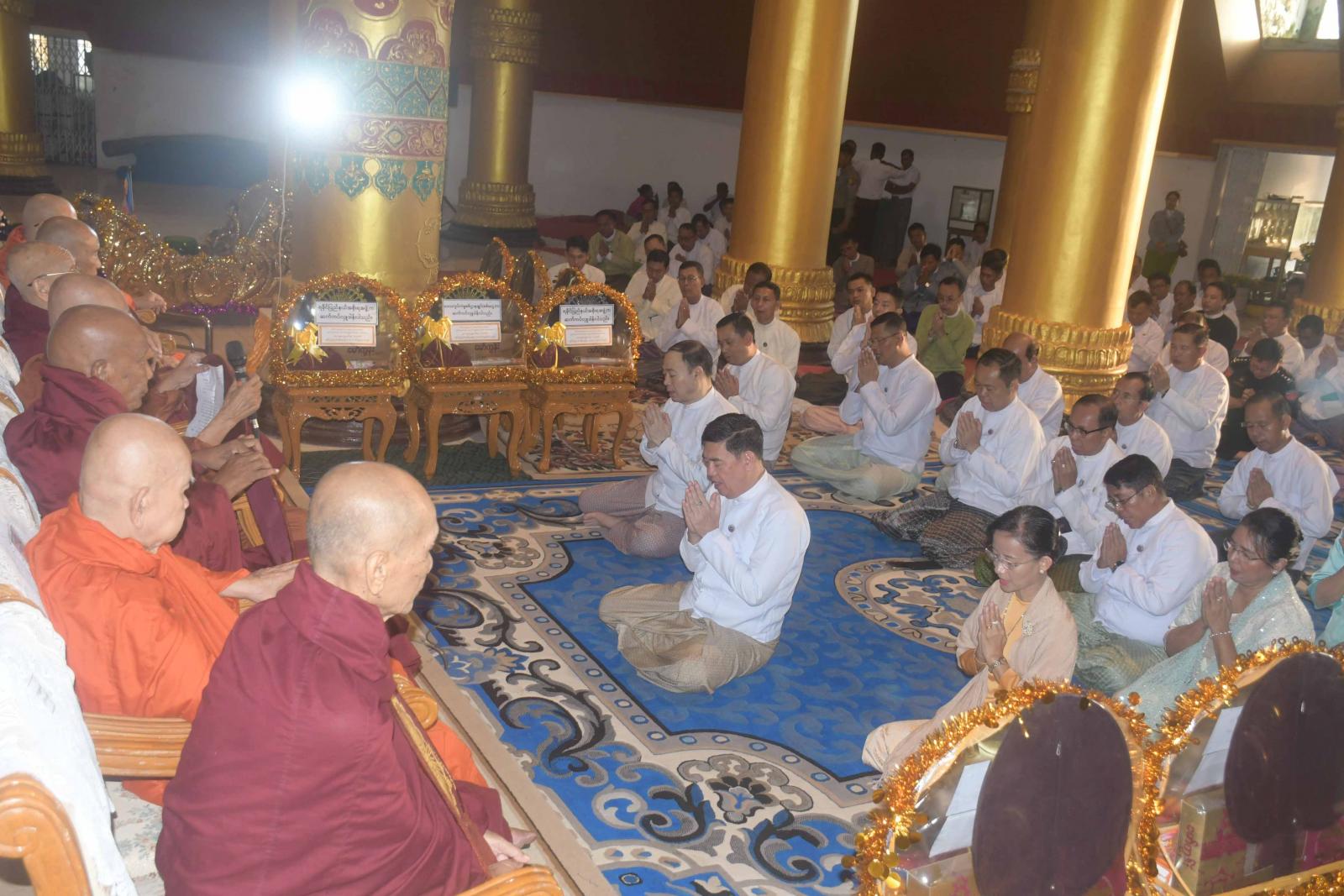 ဆက်လက်၍ အဘိဓဇမဟာရဋ္ဌဂုရု ဘဒ္ဒန္တနန္ဒသိရီ မဟာထေရ်မြတ်ထံမှ ပြည်နယ်ဝန်ကြီးချုပ် အမှူးပြုသော ဧည့်ပရိတ်သတ်များက ငါးပါးသီလခံယူ ဆောက်တည်ကြပြီး သံဃာတော်အရှင် သူမြတ်တို့က ပရိတ်တရားတော်များကို ရွတ်ပွားချီးမြှင့်တော်မူကြသည်။ ယင်းနောက် ပြည်နယ် ဝန်ကြီးချုပ်နှင့်ဇနီး၊ တိုင်းမှူး၊ ပြည်နယ်အစိုးရအဖွဲ့ဝင်များနှင့် တာဝန်ရှိသူများက သံဃာတော် အရှင်သူမြတ်များအား လှူဖွယ်ဝတ္ထုများဆက်ကပ်လှူဒါန်းကြသည်။