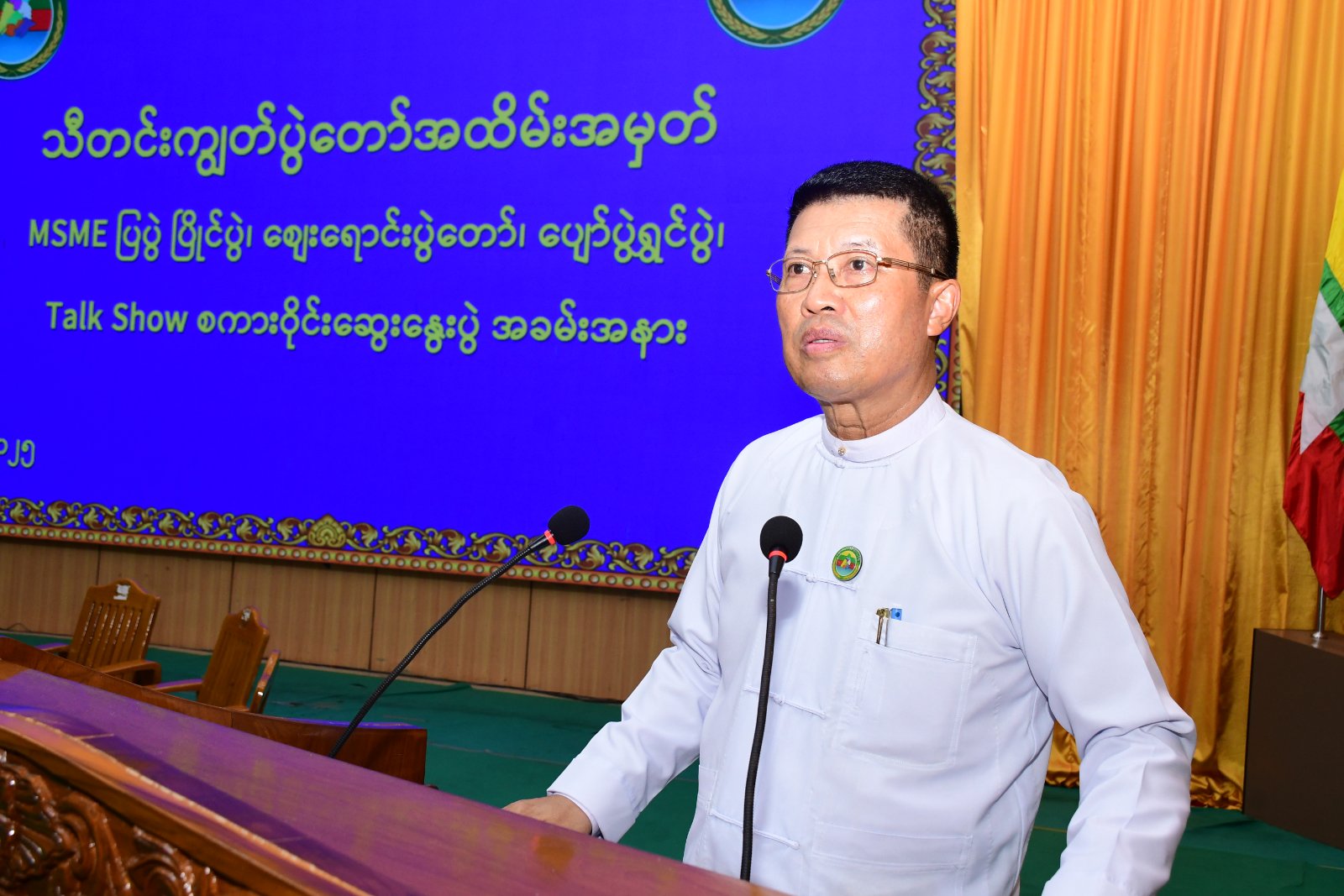တိုင်းဒေသကြီးဝန်ကြီးချုပ်က “တိုင်းဒေသကြီးသည် စိုက်ပျိုးရေးနှင့်မွေးမြူရေးကို အခြေခံသည့် တိုင်းဒေသကြီးဖြစ်သည့်အလျောက် MSME ထုတ်ကုန်များခင်းကျင်းပြသရာတွင် စားသောက် ကုန်များ၊ လူသုံးကုန်ပစ္စည်းများ၊ လက်မှုပစ္စည်းများ၊ လယ်ယာသုံးပစ္စည်းများအပါဝင် အမယ်မျိုးစုံ ခင်းကျင်းပြသထားပါကြောင်း၊ တိုင်းဒေသကြီးအနေဖြင့် One Region One Product (OROP) ထုတ်ကုန်များစွာဖော်ထုတ်ထားပါကြောင်း၊ ထုတ်လုပ်မှု သုတေသန၊ ဈေးကွက်သုတေသနတို့ကို တက္ကသိုလ်ကောလိပ်များနှင့် ပူးပေါင်းဆောင်ရွက်လျက်ရှိပါကြောင်း၊ တိုင်းဒေသကြီးသည် စိုက်ပျိုး မွေးမြူရေးကုန်ကြမ်းများထွက်ရှိသည့် တိုင်းဒေသကြီးဖြစ်ပြီး MSME လုပ်ငန်းများတွင် အသုံးပြုလျက်ရှိပါကြောင်း၊ ခရီးသွားရာသီစတင်တော့မည်ဖြစ်သဖြင့် မိမိတို့၏ဒေသထုတ်ကုန် များနှင့်ဆွဲဆောင်ရန်လည်းလိုအပ်ပါကြောင်း၊ စားသောက်ကုန်ပစ္စည်းများထုတ်လုပ်ရာတွင် ထုတ်ပိုးမှု စနစ် သေသပ်ကောင်းမွန်စေရေး၊ ကုန်ပစ္စည်း အမှတ်တံဆိပ်နှင့် expire date များပါဝင်စေရန် ၊ Talk Show စကားဝိုင်းဆွေးနွေးပွဲသို့ တက်ရောက်လာသည့် လုပ်ငန်းရှင်များကလည်း စိတ်ပါဝင်စားစွာ နားထောင်၍ ပြန်လည်ဆွေးနွေးပေးကြစေလိုကြောင်း၊ MSME လုပ်ငန်းများ ပိုမိုဖွံ့ဖြိုး တိုးတက်ရေးအတွက် အားလုံးကဝိုင်းဝန်း ပူးပေါင်းဆောင်ရွက်သွားကြစေလိုကြောင်း” အမှာစကား ပြောကြားသည်။