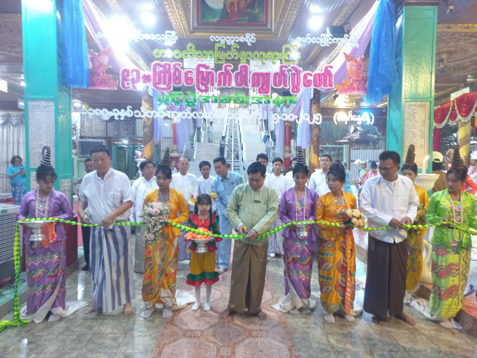 ရှေးဦးစွာ နမောတဿသုံးကြိမ်ရွတ်ဆို၍ မြို့နယ်စီမံခန့်ခွဲရေးနှင့်အုပ်ချုပ်ရေးကော်မတီ အဖွဲ့ဝင် ဦးစောဝဏ္ဏနှင့် မြို့မိမြို့ဖ ဒေါက်တာလှဟန်တို့က သာသနာ့အလံအား အလံတိုင် ထိပ်သို့လွှင့်တင်ကာဆက်လက်၍ မြို့နယ်စီမံခန့်ခွဲရေးနှင့် အုပ်ချုပ်ရေးကော်မတီ အတွင်းရေးမှူး ရဲမှူးမိုးစိန်၊ အဖွဲ့ဝင် ဦးတင်လှိုင်နှင့် မြို့နယ်စည်ပင်သာယာရေးအဖွဲ့ အမှုဆောင်အရာရှိ ဒုတိယညွှန်ကြားရေးမှူး ဦးဝင်းအောင်သူတို့မှ ဝါကျွတ်ပွဲတော်ဖွင့်ပွဲ အထိမ်းအမှတ် သာသနာ့အလံအား မိုးပျံပူဖောင်းများဖြင့် အထက်ကောင်းကင်ယံသို့ လွှင့်တင်ခဲ့ကြသည်။