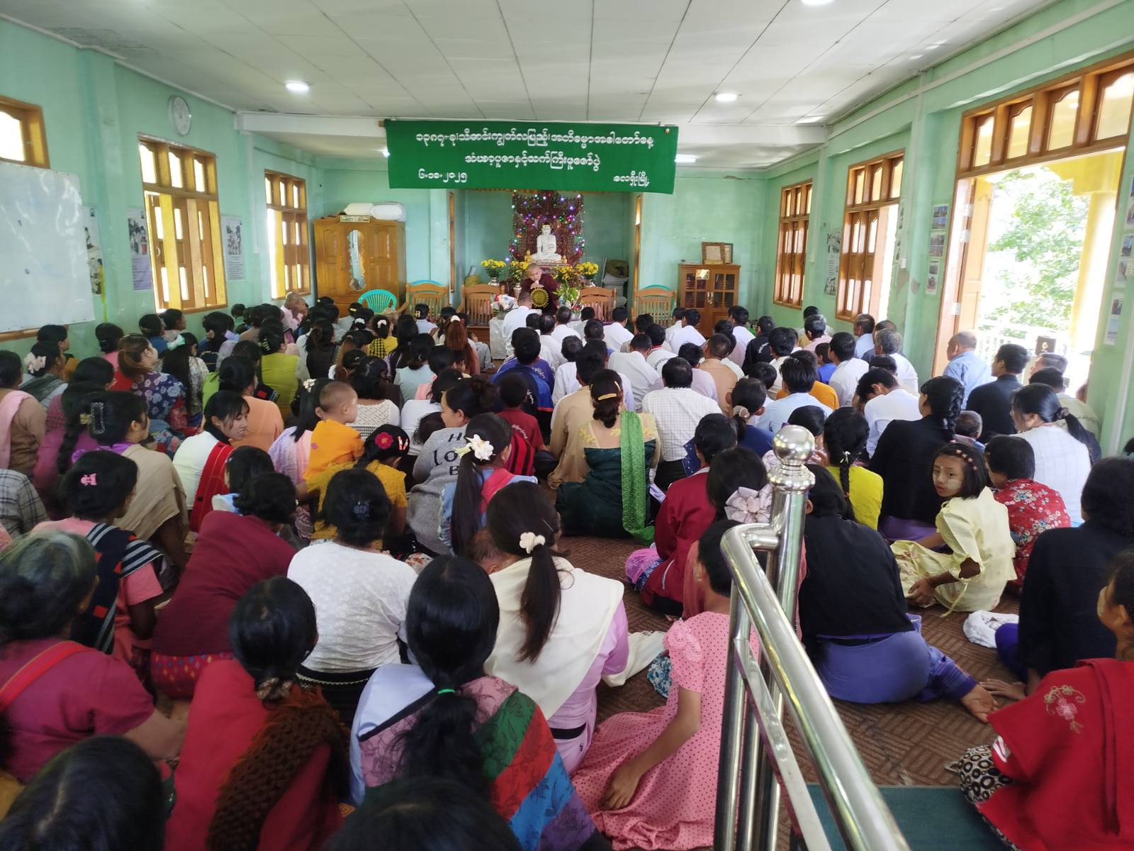 အခမ်းအနားပထမပိုင်းအဖြစ် သံဃာ့ပူဇာပွဲကိုပြုလုပ်ရာ ရှေးဦးစွာအခမ်းအနားသို့ကြွရောက်လာကြသောလေရှီးမြို့ ဗဟိုသာသနာပြုခေါင်းဆောင်ဆရာတော် အမှူးပြုသောပင့်သံဃာ (၆) ပါးနှင့်သီလရှင်များ၊ မြို့နယ်အဆင့်ဌာနဆိုင်ရာအကြီးအကဲများနှင့်ဝန်ထမ်းများနှင့် ဘာသာဝင်များက နမောတဿ(၃)ကြိမ် ရွက်ဆိုဘုရားကန်တော့၍ အခမ်းအနားဖွင့်လှစ်ခဲ့ပြီး လေရှီးမြို့၊ ထေရဝါဒဗုဒ္ဓသာသနာပြု(ဗဟို)ခေါင်းဆောင်ဆရာတော် အဂ္ဂမဟာသဒ္ဓမ္မဇောတိကဓဇ ဘဒ္ဒန္တသုဒဿနအရှင်သူမြတ်ထံမှ (၈)ပါးသီလခံယူဆောက်တည်ခဲ့ကြသည်။ ထို့နောက် သံဃာတော်အရှင်သူမြတ်တို့ ရွက်ဖတ်သရဇ္ဇျာယ်အပ်သော မေတ္တာသုတ်ပရိတ်တရားတော်များနာယူကြည်ညိုပြီး သံဃာ့ပူဇာ ဝတ္ထုငွေ (၄၇၇၇၀၀၀)ကျပ်နှင့်လှူဖွယ်ပစ္စည်းများ ဆက်ကပ်လှူဒါန်းခဲ့ကြသည်။ ဆက်လက်၍ လေရှီးမြို့၊ ထေရဝါဒဗုဒ္ဓသာသနာပြု(ဗဟို)လက်ထောက်ဆရာတော် သာသနာ့တက္ကသီလ ဓမ္မာစရိယ ဘဒ္ဒန္တအဂ္ဂဓဇ အရှင်သူမြတ်ဟောကြားအပ်သော "လူသားနှင့်ကောင်းခြင်းလေးဖြာ" အနုမောဒနာတရားနာယူ၍ လှူဒါန်းမှုအစုစုတို့အတွက်ရေစက်သွန်းချအမျှပေးဝေခဲ့ကြသည်။