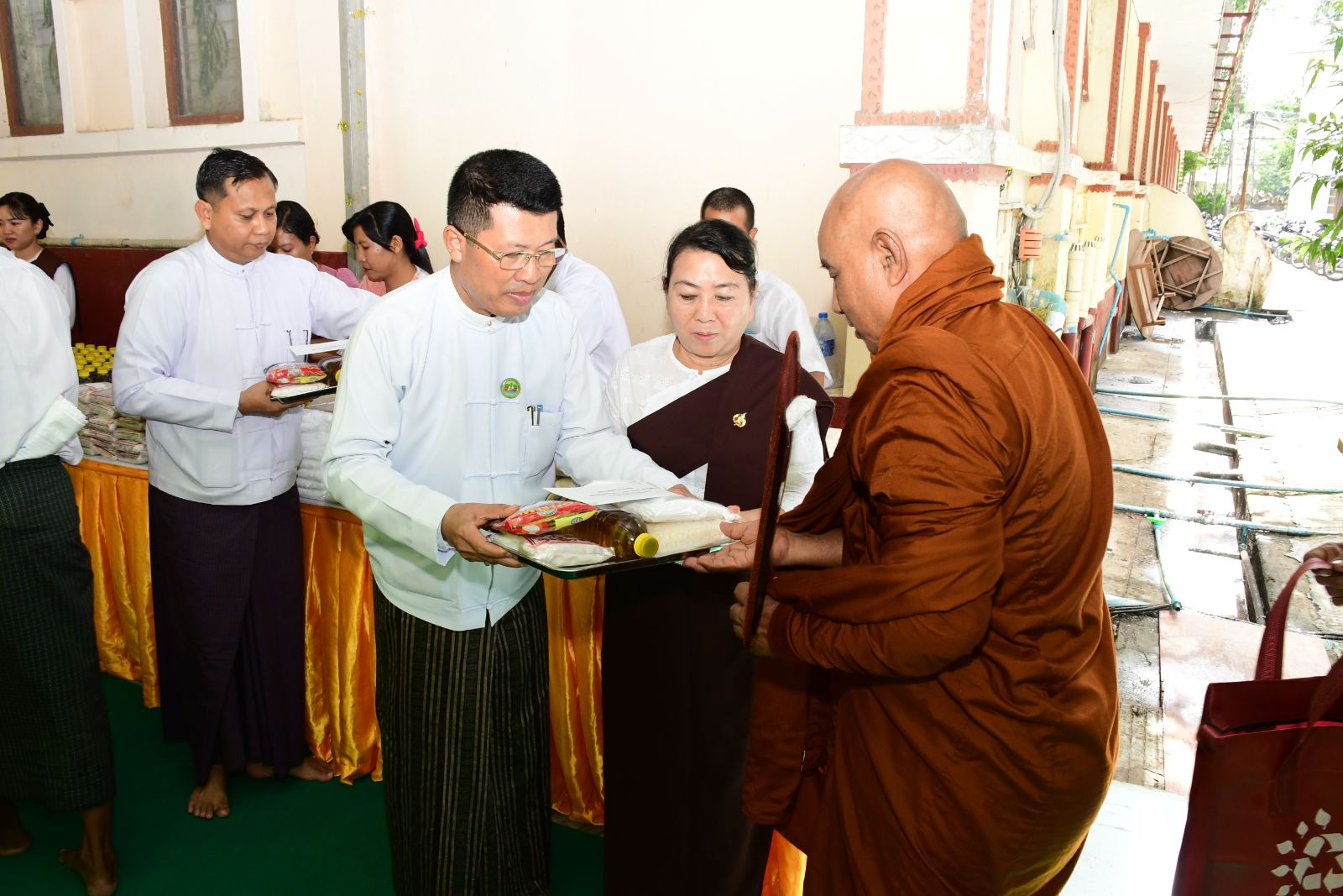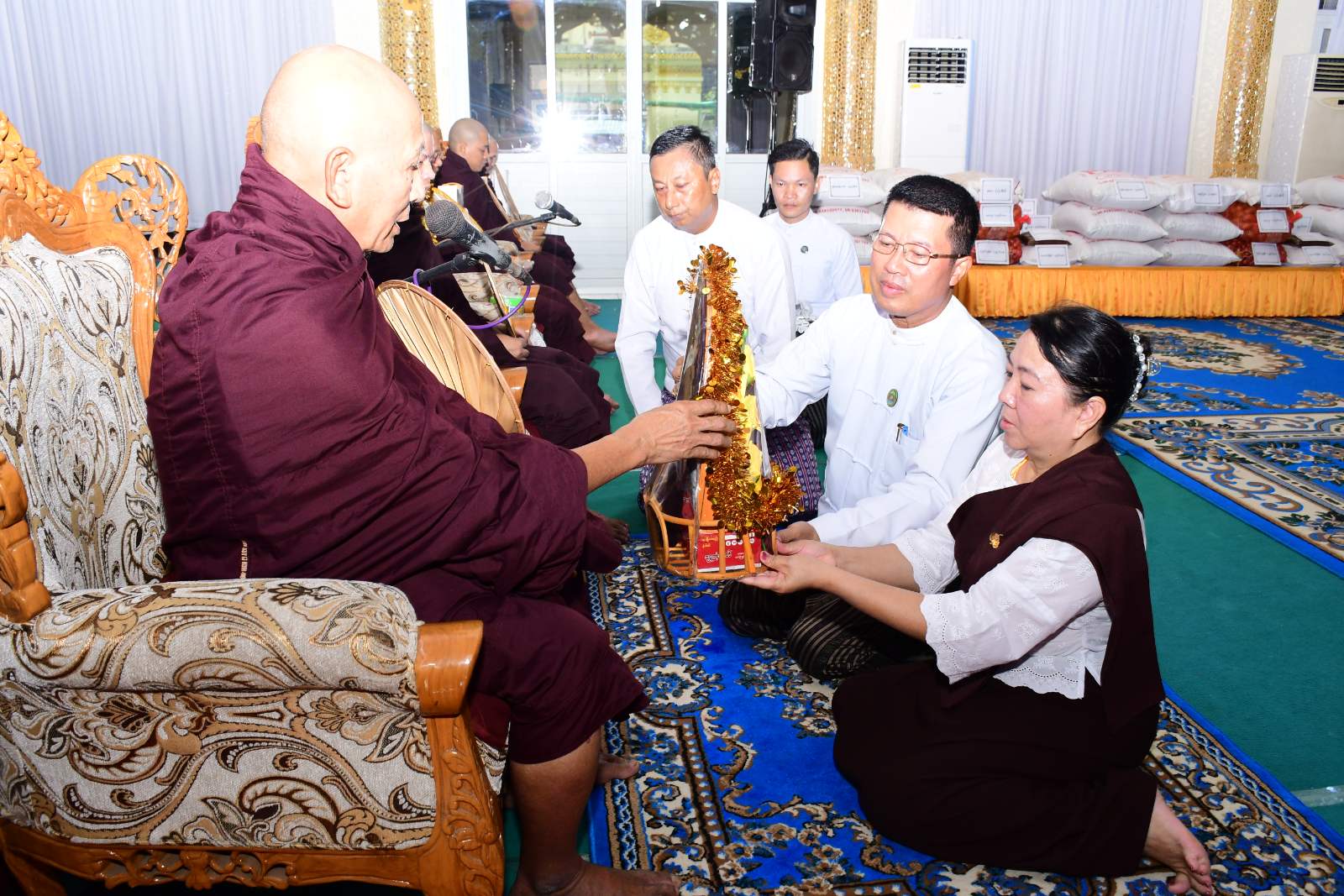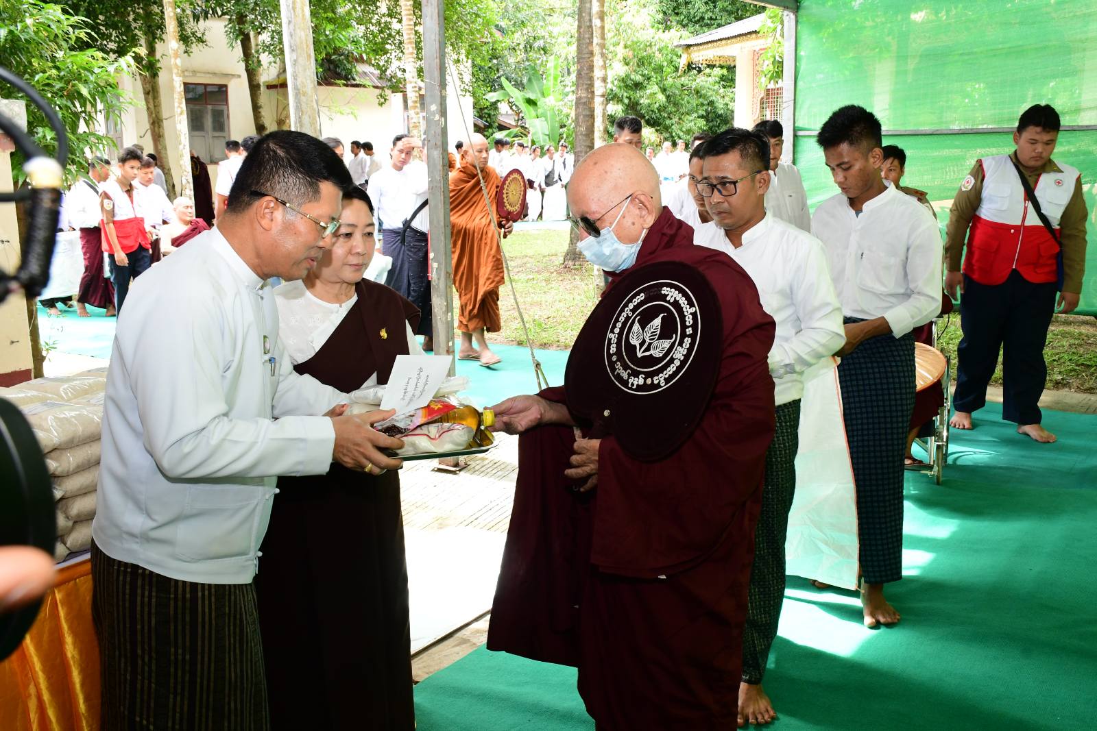 ထို့နောက် ဆရာတော်သံဃာတော် အရှင်သူမြတ်များအား တိုင်းဒေသကြီးဝန်ကြီးချုပ်နှင့် ဇနီး၊ တိုင်းဒေသကြီး ဝန်ကြီးများနှင့် ဇနီးများက လှူဖွယ်ဝတ္ထုပစ္စည်းများဆက်ကပ်လှူဒါန်းခဲ့ကြကာ ပုသိမ်မြို့ ကျောင်းထိုင်ဘုန်းကြီးသင်တန်းကျောင်း ကျောင်းအုပ်ဆရာတော် (မဟာသဒ္ဓမ္မဇောတိကဓဇ)ဒေါက်တာဘဒ္ဒန္တဇောတိဿရ မထေရ်မြတ်ထံမှ အနုမောဒနာတရားနာကြား၍ လှူဒါန်းမှုအစုစုတို့အတွက် ရေစက်သွန်းချအမျှပေးဝေသည်။ ယင်းနောက် ဆရာတော်သံဃာတော်အရှင်သူမြတ်များအား နေ့ဆွမ်းဆက်ကပ်လှူဒါန်းခဲ့ကြပြီး ဧည့်ပရိသတ်များအား နေ့လယ်စာဖြင့် ကျွေးမွေးလှူဒါန်းသည်။