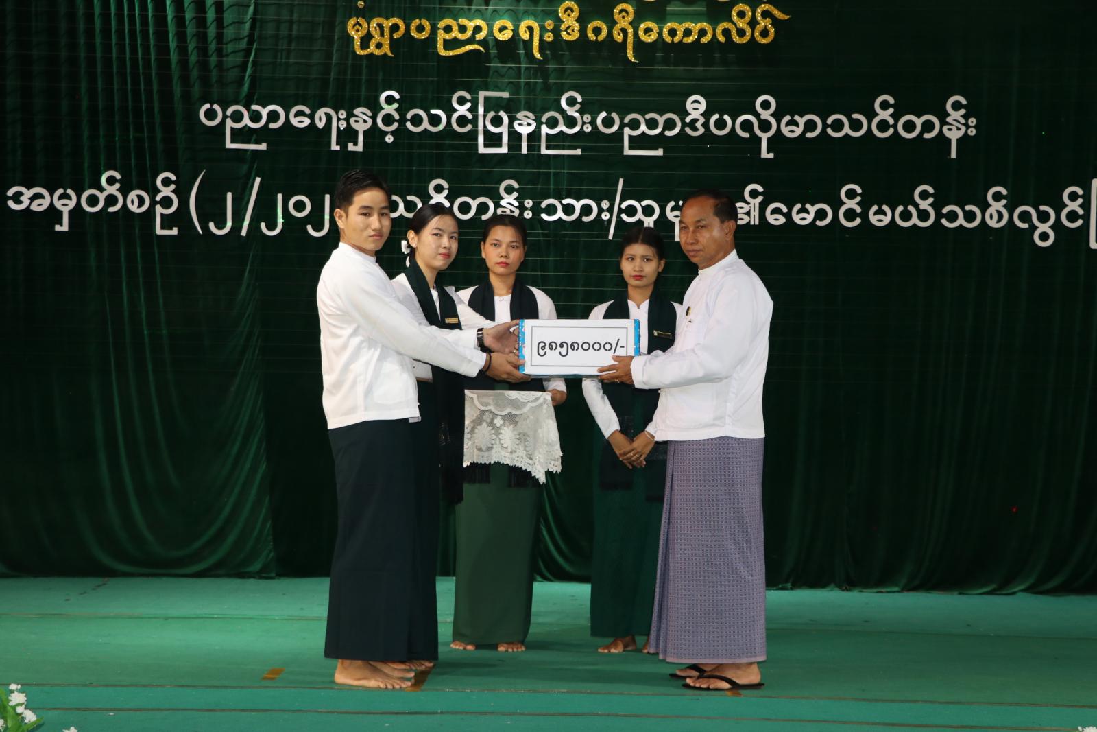 ယင်းနောက် တိုင်းဒေသကြီး ဝန်ကြီးချုပ်က မုံရွာပညာရေးဒီဂရီကောလိပ် ပညာရေးနှင့် သင်ပြနည်းပညာဒီပလိုမာသင်တန်း(Dip.EP) အမှတ်စဉ်(၂)သင်တန်းသား/သင်တန်းသူများအတွက် ဂုဏ်ပြုချီးမြှင့်ငွေကျပ် ၂၃,၀၀,၀၀၀နှင့် မုံရွာပညာရေးဒီဂရီကောလိပ်ရှိ သင်တန်းသား/သင်တန်းသူ ၂၁၂ ဦးအတွက် စားစရိတ် ငွေကျပ် ၉၈,၅၈,၀၀၀ တို့အား ပေးအပ်ချီးမြှင့်သည်။