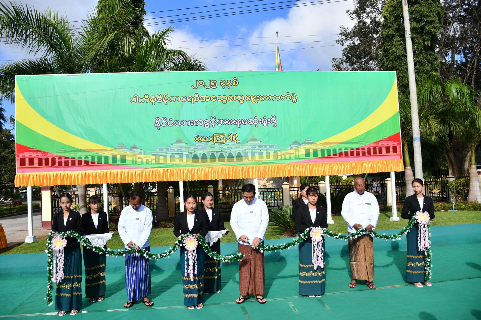ဆက်လက်၍ ပြည်နယ်ဝန်ကြီးချုပ်၊ သယံဇာတရေးရာဝန်ကြီးနှင့် ပြည်နယ်ရွေးကောက်ပွဲကော်မရှင်အဖွဲ့ခွဥက္ကဋ္ဌတို့က ရွေးကောက်ပွဲနှိုးဆော်အသိပညာပေး မြေစိုက်ပိုစတာအား ဖဲကြိုးဖြတ် ဖွင့်လှစ် ပေးသည်။