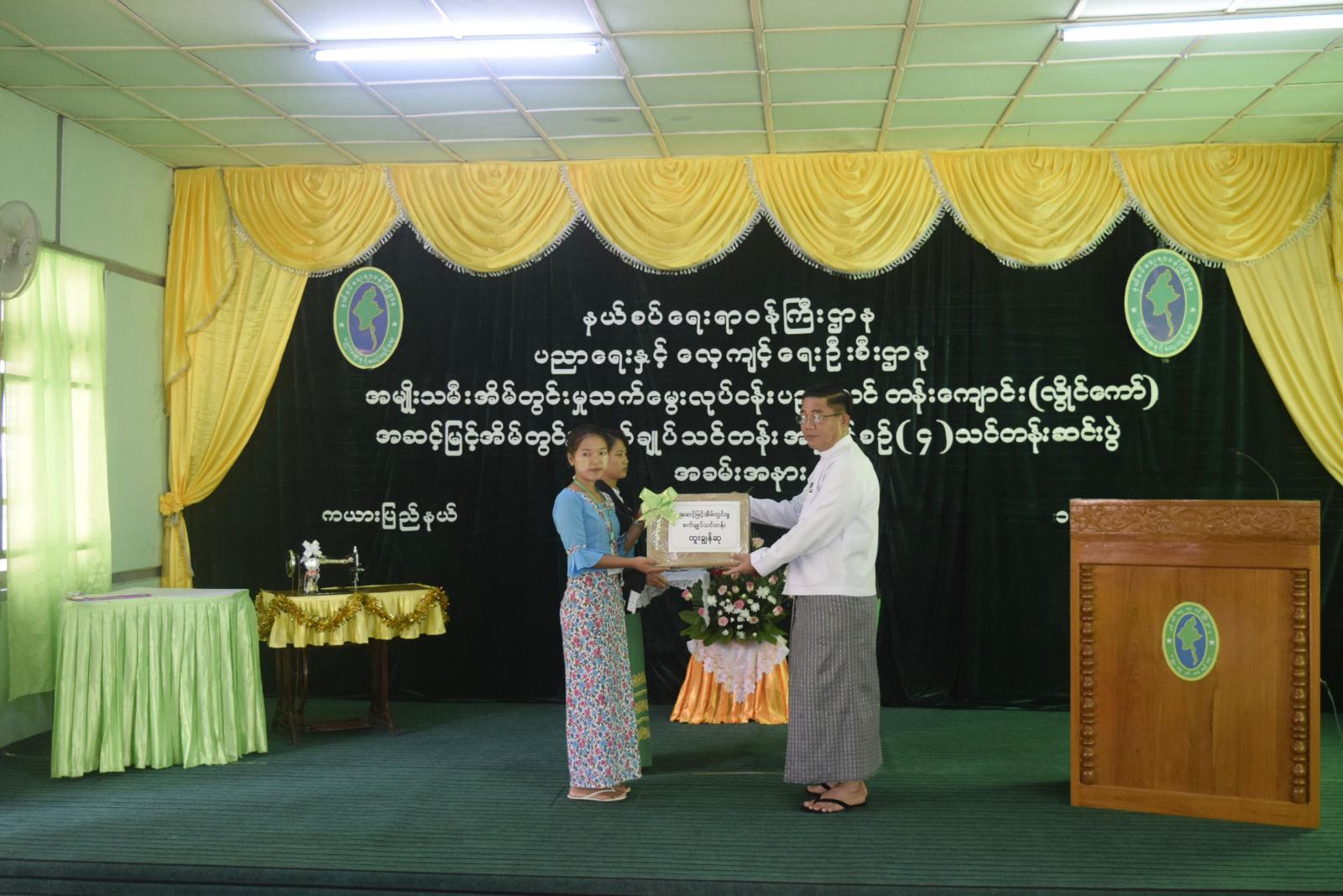 ထို့နောက် ပြည်နယ်ဝန်ကြီးချုပ်က သင်တန်း၌ ထူးချွန်ဆုရရှိသည့် ဒီးမော့ဆိုမြို့နယ်မှ သင်တန်းသူ တစ်ဦးအား အပ်ချုပ်စက်နှင့် ဆက်စပ်ပစ္စည်းများအား ပေးအပ်ချီးမြှင့်ခဲ့သည်။ ဆက်လက် ၍ သင်တန်းကျောင်းအုပ်ကြီးမှ သင်တန်းဆင်းအောင်လက်မှတ်များကို သင်တန်းသား ကိုယ်စားလှယ်တစ်ဦးသို့ ပေးအပ်ခဲ့ပြီး သင်တန်းကျောင်းဆိုင်ရာအချက်အလက်များနှင့် သင်တန်းကာလအတွင်း သင်တန်းသူများ၏ သင်ကြားသင်ယူမှုနှင့် ပြင်ပဗဟုသုတရရှိစေရေး ဆောင်ရွက်ပေးမှု အခြေအနေများအား ရှင်းလင်းတင်ပြခဲ့သည်။
