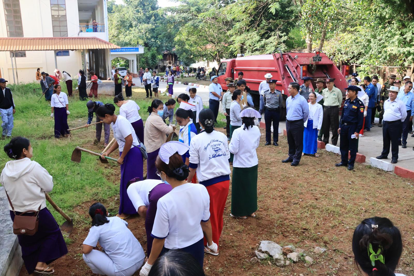 ဦးစွာ ပြည်နယ်ဝန်ကြီးချုပ်နှင့် တာဝန်ရှိသူများသည် လွိုင်ကော်မြို့ ကုတင်(၅၀၀)ဆံ့ ပြည်သူ့ဆေးရုံကြီးအတွင်း နယ်မြေခံတပ်ရင်းတပ်ဖွဲ့များ၊ ရဲတပ်ဖွဲ့ဝင်များ၊ မီးသတ်တပ်ဖွဲ့ဝင်များနှင့် ဌာနဆိုင်ရာဝန်ထမ်းများ၊ ကျန်းမာရေးဝန်ထမ်းများနှင့် ရပ်ကွက်နေပြည်သူများက စုပေါင်းသန့်ရှင်းရေးဆောင်ရွက်နေမှုတို့ကို လှည့်လည်ကြည့်ရှုအားပေးသည်။ ထို့နောက် ပြည်နယ်ဝန်ကြီးချုပ်က ဆေးကုသရန် လာရောက်သည့် ပြည်သူများအား ကျန်းမာရေး စောင့်ရှောက်မှု အပြည့်အဝပေးရန် ၊ ကျန်းမားရေး ပစ္စည်းကိရိယာများ အမြဲအသင့်ဖြစ်စေရေးနှင့် ပျက်စီးမှုဖြစ်ပေါ်ပါက သက်ဆိုင်ရာသို့ချက်ချင်းတင်ပြရန်၊ ဆေးရုံပတ်ဝန်းကျင် စိမ်းလန်းစိုပြည်ရေးနှင့် သန့်ရှင်းသာယာလှပရေး အစဉ်တစိုက်ဆောင်ရွက်ရန်နှင့် ရေနုတ်မြောင်းများ ရေစီးရေလာကောင်းမွန်ရေး တာဝန်ရှိသူများအား မှာကြားခဲ့ပြီး လိုအပ်သည်များ ပေါင်းစပ်ညှိနှိုင်းပေးခဲ့ကြောင်း သိရသည်။