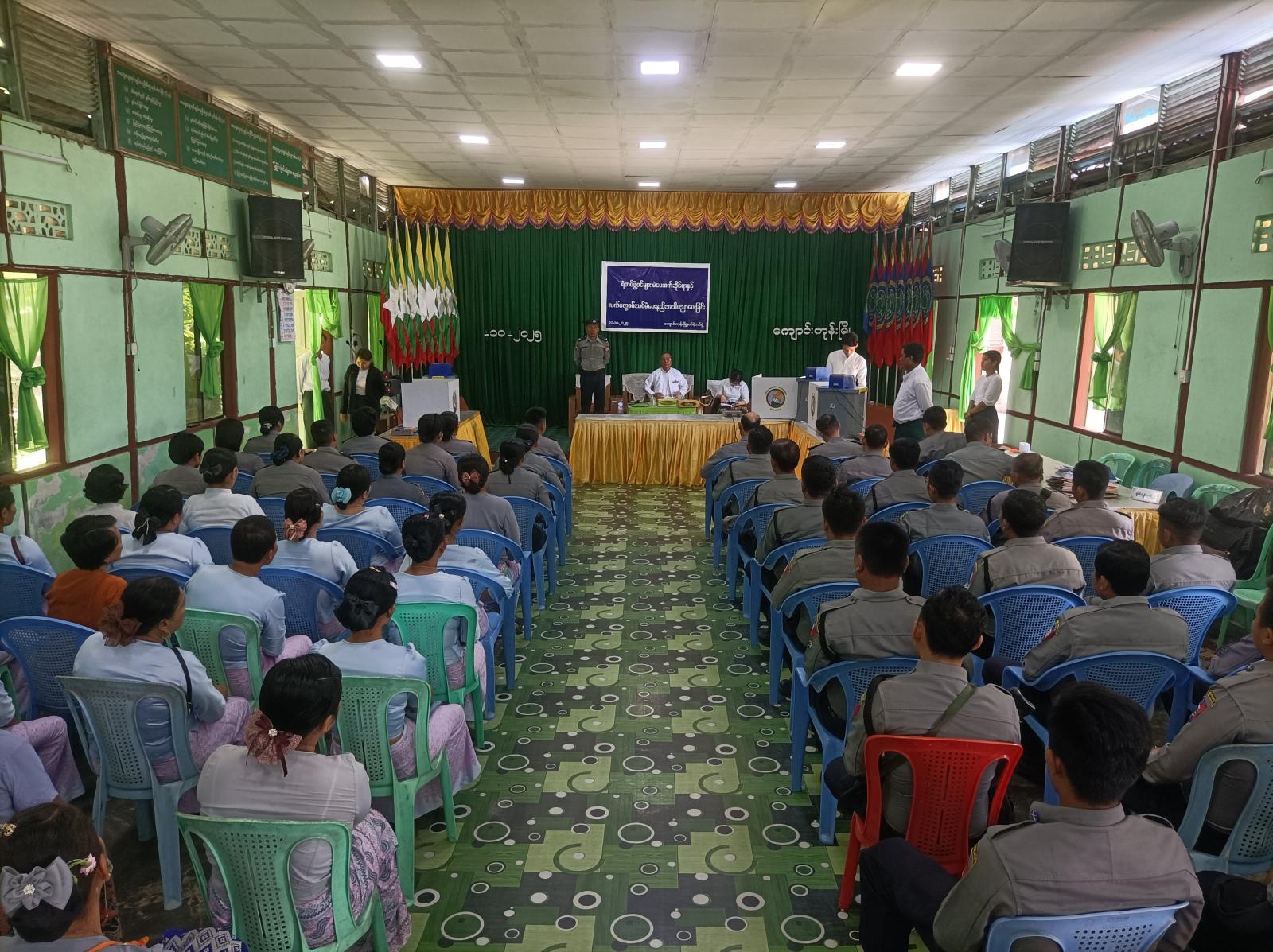 အခမ်းအနားတွင် မြို့နယ်ရဲတပ်ဖွဲ့မှူး ရဲမှူးအောင်နိုင်ဦးက အဖွင့်အမှာစကားပြောကြားပြီး၊ မြို့နယ်ရွေးကောက်ပွဲကော်မရှင်အဖွဲ့ခွဲဥက္ကဋ္ဌ ဦးမျိုးညွန့်က မဲဆန္ဒနယ်များသတ်မှတ်ထားပုံကို ရှင်းလင်းပြောကြားခဲ့သည်။