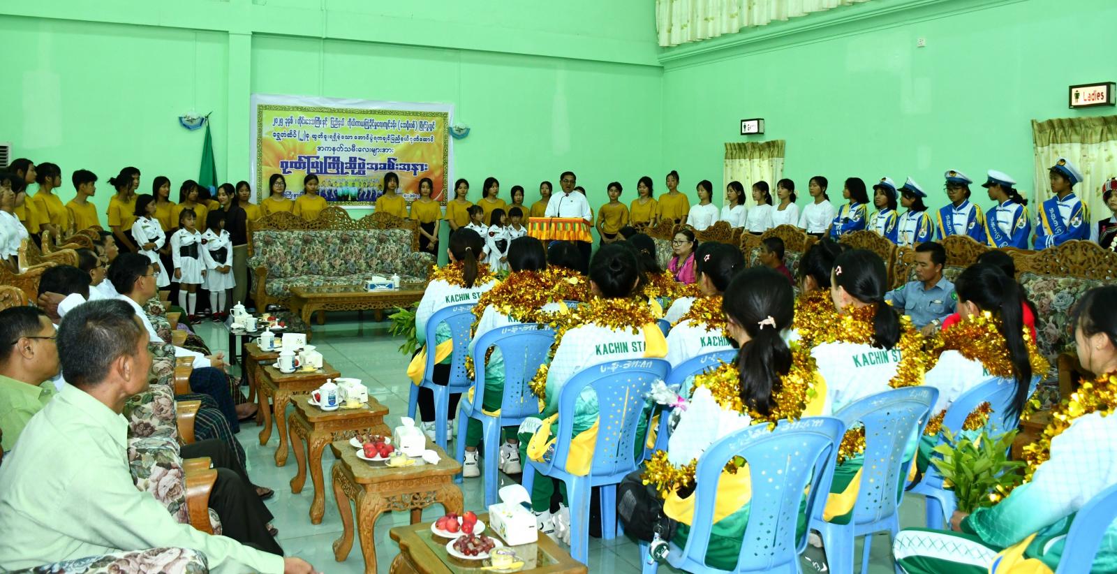 ဆက်လက်၍ လေဆိပ်ဧည့်ခန်းမဆောင်၌ ပြည်နယ်ဝန်ကြီးချုပ်က အောင်ပွဲရ အေရိုးဗစ်အသင်းအား ကချင်ပြည်နယ်အေရိုးဗစ်အသင်းအနေဖြင့် (၉)ယောက်တွဲနှင့် (၃)ယောက်တွဲတို့တွင် ရွှေတံဆိပ် (၂)ခုရရှိခဲ့သည့်အပြင် တိုင်းဒေသကြီးနှင့် ပြည်နယ်အဆင့် (၂)နေရာတွင် ရပ်တည်နိုင်ခဲ့ပြီး ပြည်နယ်အတွက် ဂုဏ်ယူဝမ်းမြောက်ဖွယ်ရာ အောင်မြင်မှုရရှိအောင် စွမ်းဆောင်ပေးခဲ့ကြသည့် အားကစားသမားများအားလုံးကို ချီးကျူးဂုဏ်ပြုပါကြောင်း ဂုဏ်ပြုပြောကြားသည်။