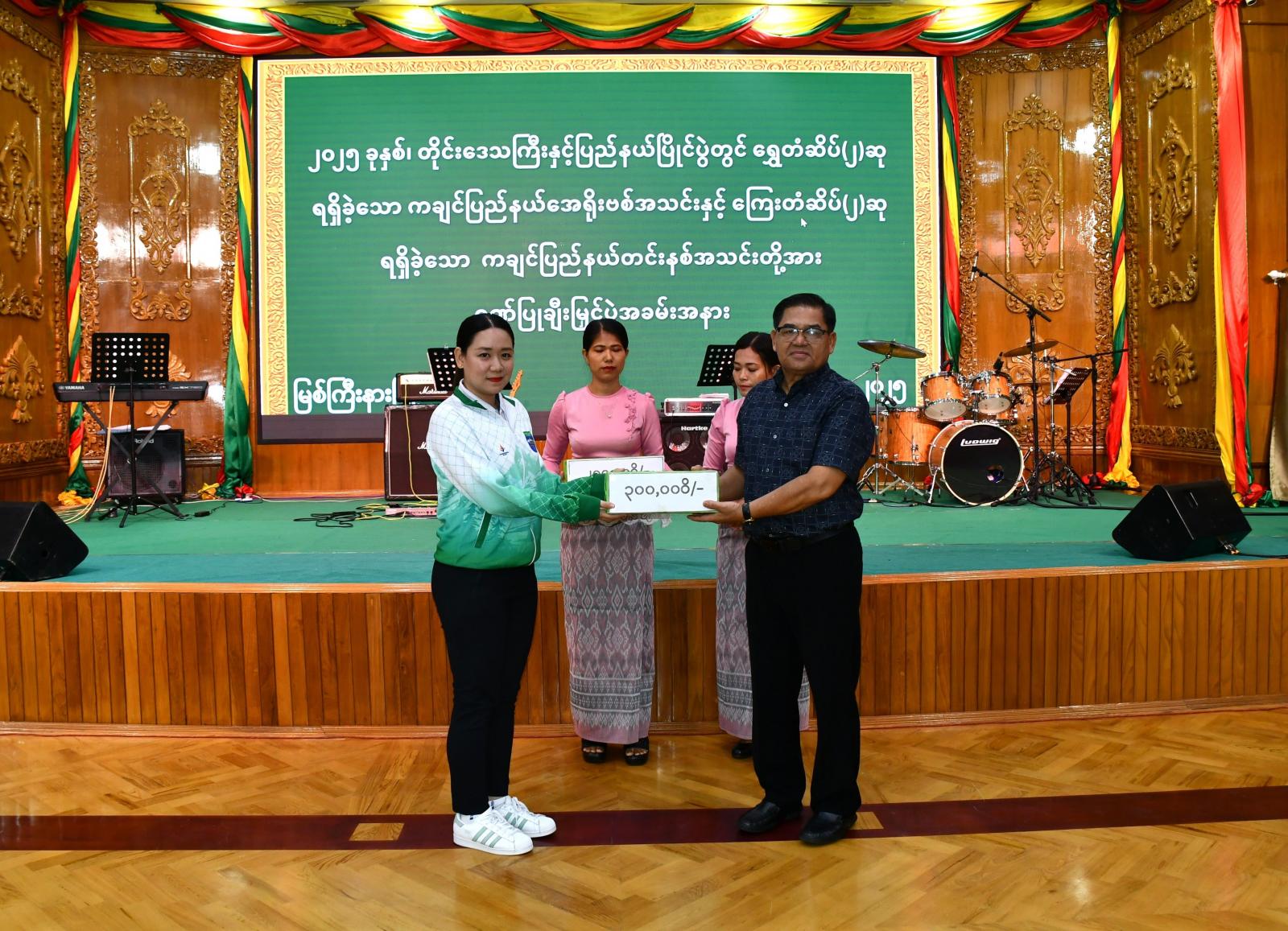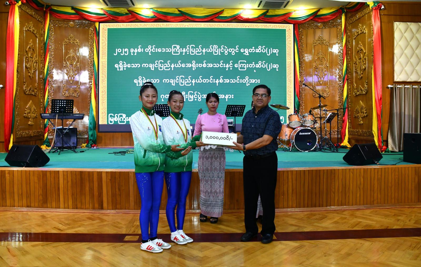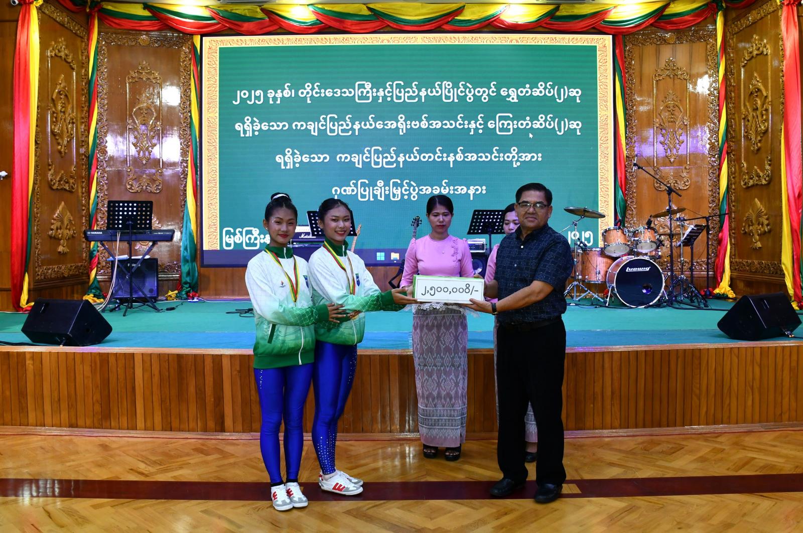 ဆက်လက်၍ အေရိုးဗစ်အသင်းနည်းပြနှင့် တင်းနစ်အသင်း နည်းပြတို့က ပြိုင်ပွဲအတွေ့အကြုံ များကို ရှင်းလင်းတင်ပြပြီး ပြည်နယ်ဝန်ကြီးချုပ်က ရွှေတံဆိပ် (၂)ဆုအတွက် ငွေကျပ်သိန်း ၂၀ ၊ အနိုင်ရရှိသည့် ပြိုင်ပွဲ (၅)ပွဲအတွက် ၂၅ သိန်း၊ အုပ်ချုပ်သူ၊ နည်းပြနှင့် ဒိုင်တို့အတွက် ငွေကျပ် ၉ သိန်းကို လည်းကောင်း၊ ပြည်နယ်လူမှုရေးရာဝန်ကြီးက တင်းနစ်ပြိုင်ပွဲတွင် ကြေးတံဆိပ်ဆု (၂)ဆုအတွက် ငွေကျပ် ၁၀ သိန်း၊ အနိုင်ရရှိသည့် ပြိုင်ပွဲ (၅)ပွဲအတွက် ငွေကျပ်သိန်း ၂၀ နှင့် အုပ်ချုပ်သူ၊ နည်းပြများအတွက် ငွေကျပ် ၁၀ သိန်းကို လည်းကောင်း စုစုပေါင်းချီးမြှင့်ငွေကျပ် ၉၄ သိန်းနှင့် အသေးစား၊ အလတ်စားစက်သုံးဆီလုပ်ငန်းရှင်များအသင်းနှင့် လုပ်ငန်းရှင်များက စုစုပေါင်းငွေကျပ်သိန်း ၄၀ ကို လည်းကောင်း အသီးသီးချီးမြှင့်ပေးအပ်ခဲ့ကြရာ လက်ရွေးစင်အုပ်ချုပ်သူတစ်ဦးက ကျေးဇူးတင်စကား ပြန်လည်ပြောကြားခဲ့သည်။