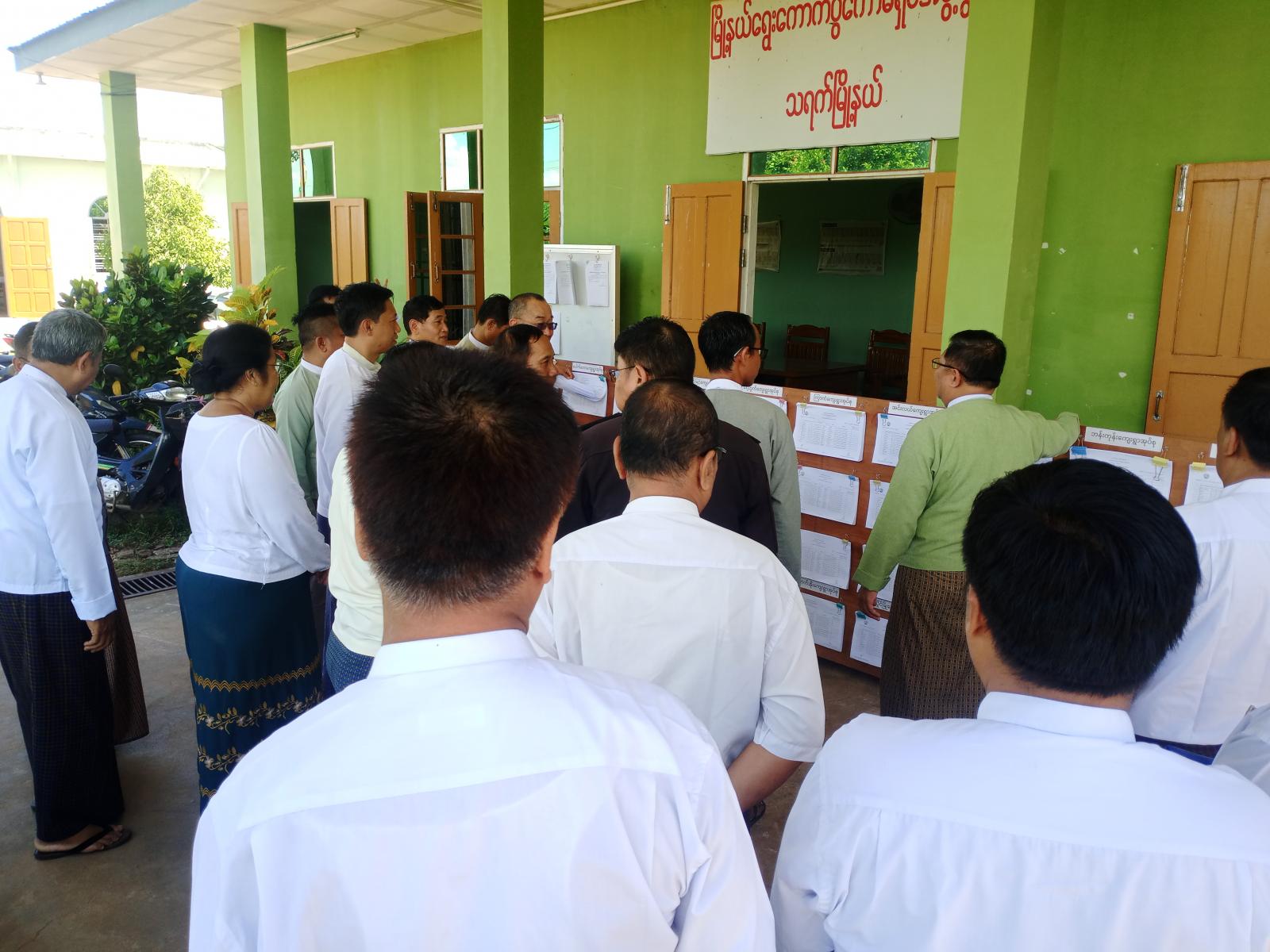 မကွေးတိုင်းဒေသကြီး သရက်မြို့နယ်၌ ၂၀၂၅ ခုနှစ် ဒီဇင်ဘာလတွင် ပါတီစုံဒီမိုကရေစီအထွေထွေရွေးကောက်ပွဲကျင်းပနိုင်ရေးအတွက် မဲဆန္ဒရှင်စာရင်းများ ပထမအကြိမ်ကပ်ထားကြေညာထားရှိမှုအား ခရိုင်စီမံခန့်ခွဲရေးနှင့်အုပ်ချုပ်ရေးကော်မတီဥက္ကဋ္ဌနှင့် အဖွဲ့ဝင်များ၊ ခရိုင်/မြို့နယ်ကော်မရှင်အဖွဲ့ခွဲ ဥက္ကဋ္ဌနှင့် အဖွဲ့ဝင်များက အောက်တိုဘာ ၁၁ ရက် မွန်းတည့် ၁၂ နာရီခွဲက မြို့နယ်ကော်မရှင်အဖွဲ့ခွဲရုံး၌ကြေညာထားရှိမှုအား လိုက်လံကြည့်ရှုသည်။