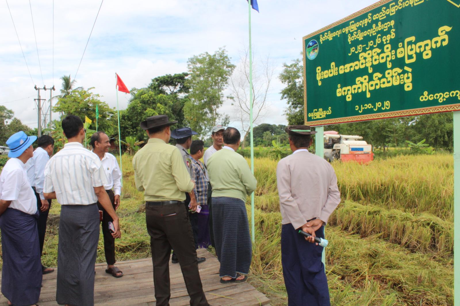အဆိုပါအခမ်းအနားသို့ ခရိုင်စိုက်ပျိုးထုတ်လုပ်မှု တိုးတက်မြင့်မားရေးကော်မတီဥက္ကဋ္ဌ၊ ခရိုင်အုပ်ချုပ်ရေးမှူး ဦးမြင့်နိုင်နှင့် အဖွဲ့ဝင်များ၊ မြို့နယ်စိုက်ပျိုးထုတ်လုပ်မှု တိုးတက်မြင့်မားရေး ကော်မတီဥက္ကဋ္ဌ၊ မြို့နယ်အုပ်ချုပ်ရေးမှူး ဦးကျော်မိုးလွင်နှင့် အဖွဲ့ဝင်များ၊ မြို့နယ်စိုက်ပျိုးရေးဦးစီးဌာနမှ ဝန်ထမ်းများနှင့်အတူ စံကွက်ရိတ်သိမ်းနေမှုအား ကြည့်ရှုအားပေးခဲ့ကြပြီး တာဝန်ရှိသူများက တောင်သူများနှင့် ရင်းရင်းနှီးနှီးတွေ့ဆုံကာ အားပေးစကားပြောကြားခဲ့သည်။ စံကွက်ရိတ်သိမ်းရာတွင် တစ်ဧကအထွက်နှုန်းမှာ အစိုတင်း (၁၁၈.၁၇)တင်း၊ အခြောက်တင်း (၁၀၂)တင်း ထွက်ရှိကြောင်း သိရသည်။