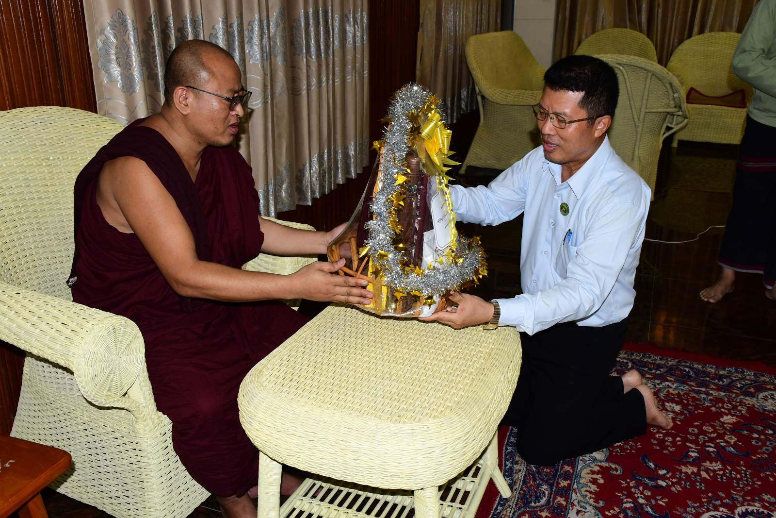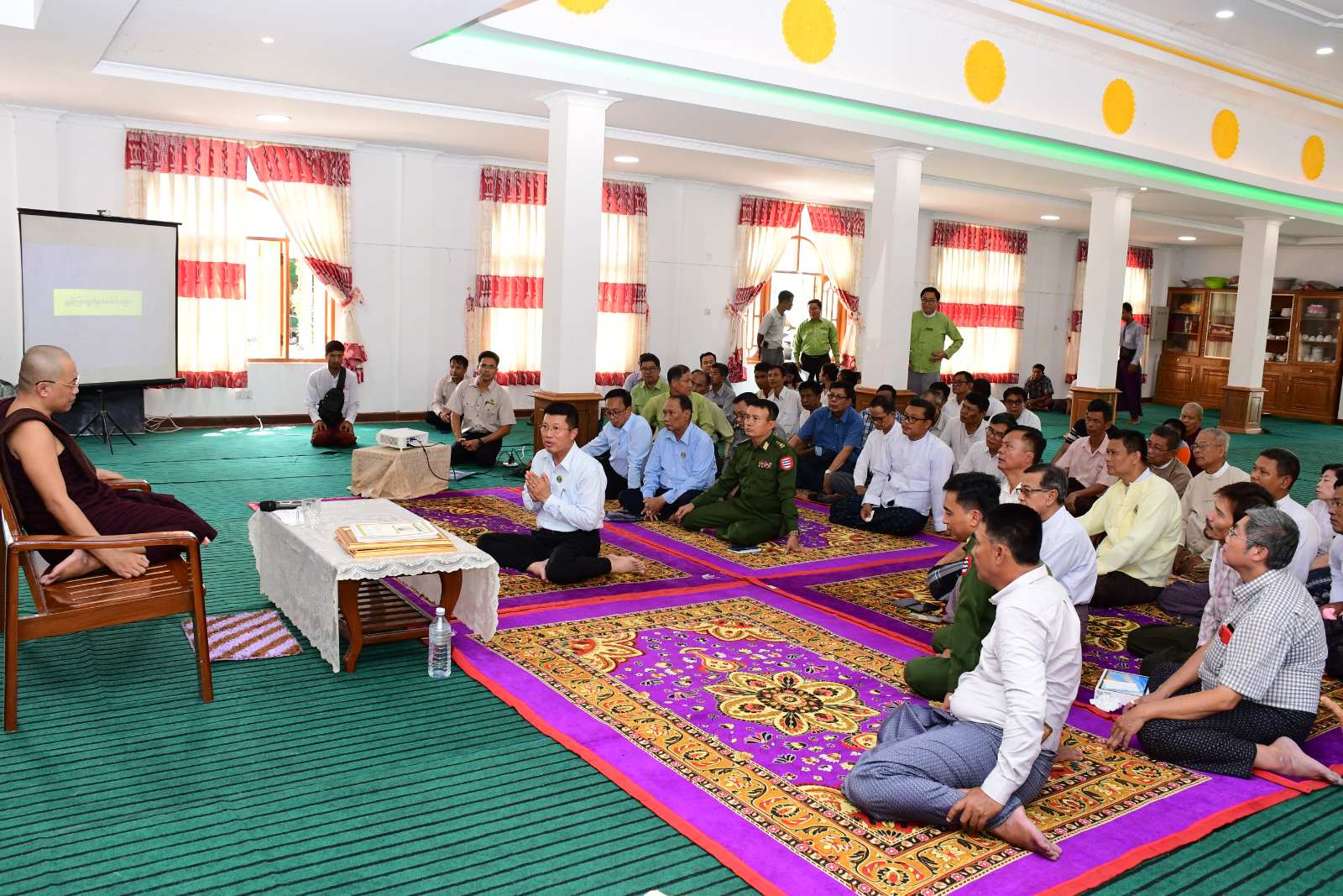 ထို့နောက် တိုင်းဒေသကြီးဝန်ကြီးချုပ်နှင့်အဖွဲ့သည် သက်ရှည်ရတနာ သာသနာ့ဗိမာန်တော်ကြီးတွင် ကျောက်စိမ်းစေတီတော် ဆရာတော် အရှင်ကုသလ(B.A မြန်မာ)အား ဖူးမြော်ကြည်ညို၍ လှူဖွယ်ပစ္စည်းများ ဆက်ကပ်လှူဒါန်းခဲ့ပြီးနောက် တာဝန်ရှိသူတစ်ဦးက ဧရာဝတီတိုင်းဒေသကြီး၊ အင်္ဂပူမြို့နယ်၊ ကွင်းကောက်ကျေးရွာအုပ်စုတွင် တည်ထားကိုးကွယ်လျက်ရှိသော ကျောက်စိမ်းဘုရား ရင်ပြင်တော်ရှိ လိုအပ်နေသောနေရာများအား မြေထိန်းနံရံတည်ဆောက်ခြင်း၊ ပန်းတင်ခုံ တည်ဆောက်ခြင်း၊ ရင်ပြင်တော်ကြွေပြားကပ်ခြင်း၊ အများသုံးသန့်စင်ခန်းနှင့် မိလ္လာကန်တည်ဆောက်ခြင်းလုပ်ငန်းတို့အတွက် ကုန်ကျငွေများအားခန့်မှန်းတွက်ချက် ရေးဆွဲထားရှိမှု၊ ကျောက်စိမ်းဘုရားရှိ (၅၆') အရှည် အနား(၈)ဘက်မြေထိန်းနံရံ တည်ဆောက်ခြင်း လုပ်ငန်းများအနက်မှ ဆောင်ရွက်ပြီးစီးမှုနှင့် ဆက်လက်ဆောင်ရွက်မည့် အခြေအနေများအား ရှင်းလင်းတင်ပြမှုအပေါ် တိုင်းဒေသကြီးဝန်ကြီးချုပ်က လိုအပ်သည်များကို ဖြည့်စွက်မှာကြားခဲ့ပြီးနောက် ကျောက်စိမ်းစေတီဆရာတော်အား သာသနာရေးဆိုင်ရာ ကိစ္စရပ်များနှင့် ကျောက်စိမ်းစေတီ ရင်ပြင်တော်ရှိ လိုအပ်နေသောနေရာများအတွက် တည်ဆောက်ခြင်းလုပ်ငန်း ဆောင်ရွက်ထားရှိမှုအခြေအနေများအား တင်ပြလျှောက်ထားခဲ့သည်။