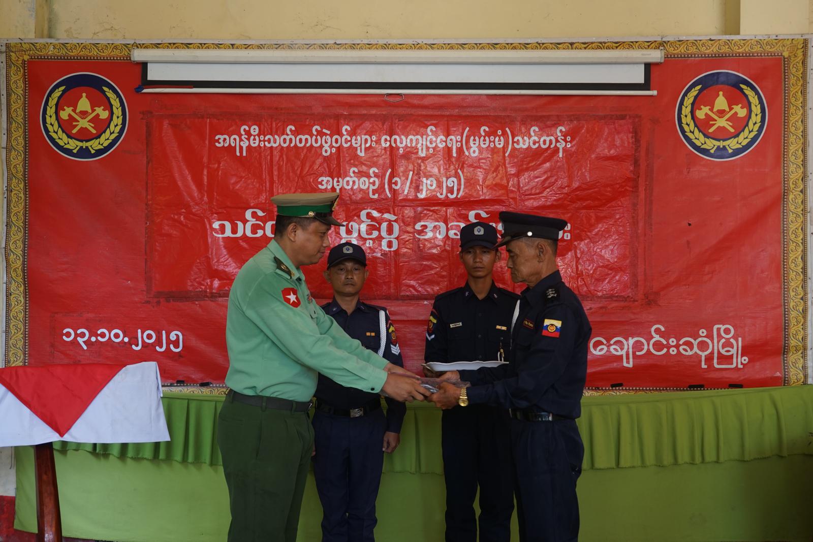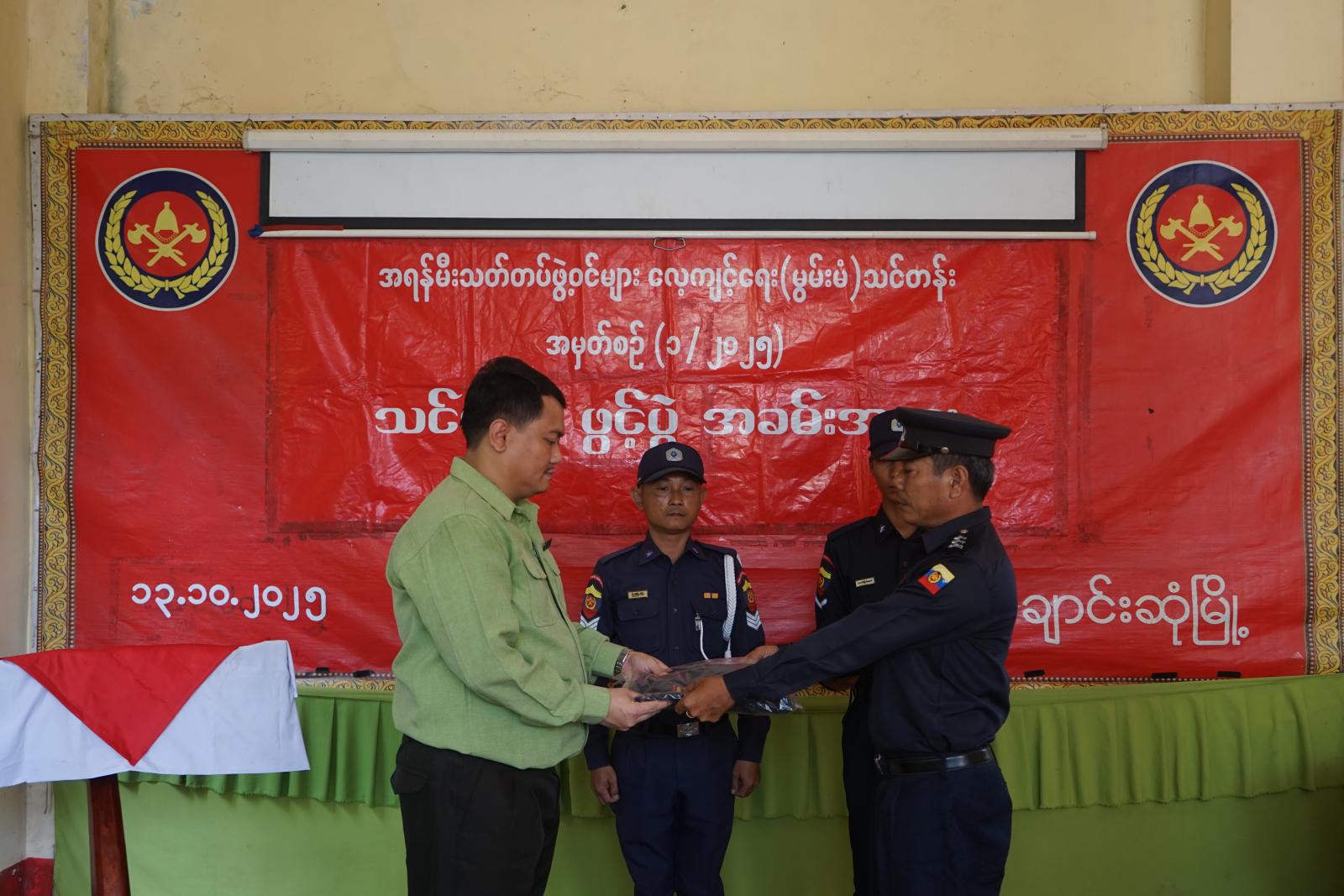 အခမ်းအနားတွင် မြို့နယ်စီမံခန့်ခွဲရေးနှင့် အုပ်ချုပ်ရေးကော်မတီ ဥက္ကဋ္ဌ ဦးဇော်နိုင်ဝင်းက အဖွင့်အမှာစကား ပြောကြားခဲ့ပြီး တာဝန်ရှိသူများမှ သင်တန်းသားများအား အရန်မီးသတ်တပ်ဖွဲ့ဝင် ဝတ်စုံများအား ပေးအပ်ခဲ့သည်။