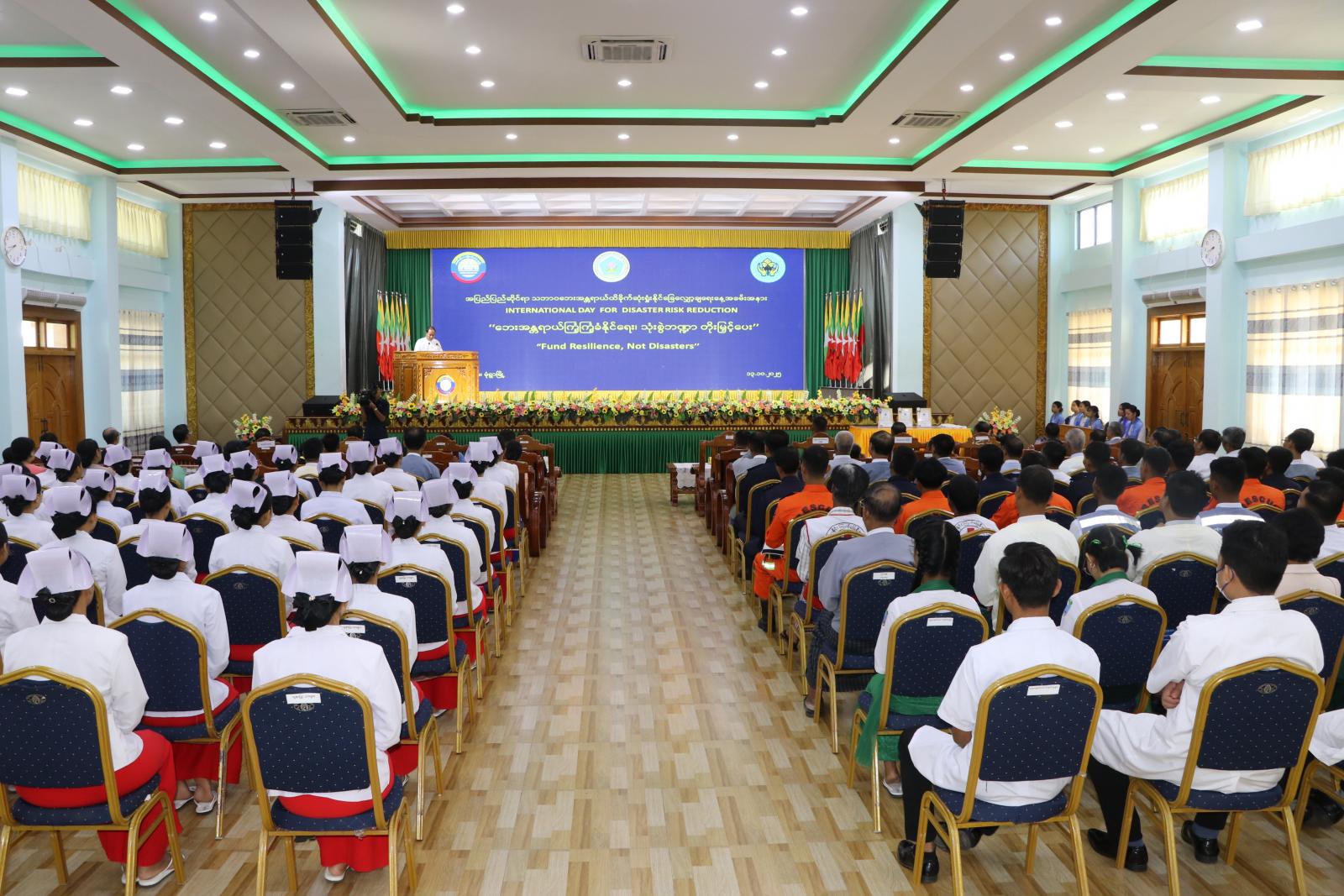 ဦးစွာ တိုင်းဒေသကြီး ဝန်ကြီးချုပ် ဦးမြတ်ကျော်က မျက်မှောက်ကာလတွင် သဘာဝဘေးအန္တရာယ်များ ပိုမိုဖြစ်ပွားလာခြင်း ပိုမိုအင်အားပြင်းထန်လာခြင်းတို့နှင့်အတူ ထိခိုက်ဆုံးရှုံးမှုများလည်း ပိုမိုကြီးမားလာသည်ကို တွေ့ရှိရပြီး ကမ္ဘာနိုင်ငံများအနေဖြင့လည်း သဘာဝဘေး အန္တရာယ်ကြောင့် ထိခိုက်ဆုံးရှုံးနိုင်ခြေလျော့ပါးရေးလုပ်ငန်းများအား အထူးအလေးပေး ဆောင်ရွက်လျက်ရှိပါကြောင်း၊ သဘာဝဘေးအန္တရာယ်လျော့ပါးရေး လုပ်ငန်းစဉ်များအား အောင်မြင်စွာ အကောင်းအထည်ဖော်ဆောင်ရွက်ခြင်းအားဖြင့် သဘာဝဘေးကြောင့် ထိခိုက် ပျက်စီးမှုများအား လျော့ချနိုင်မည်ဖြစ်ပြီး ပြည်သူလူထုအနေဖြင့် ရာသီအလိုက်ဖြစ်ပေါ်တတ်သည့် မည်သည့်ဘေးအန္တရာယ်မျိုးကိုမဆို အသိသတိရှိစွာဖြင့် ကြိုတင်ပြင်ဆင် ဆောင်ရွက်သွားကြရန် လိုအပ်ပါကြောင်း ပြောကြားခဲ့သည်။