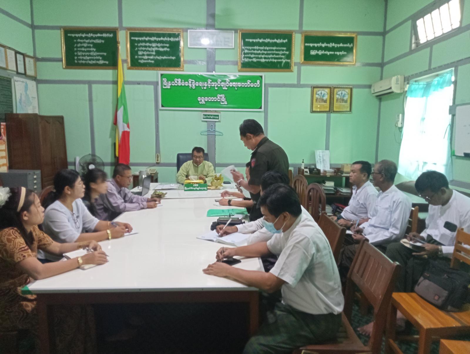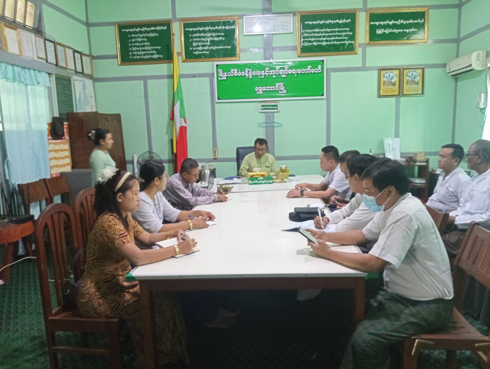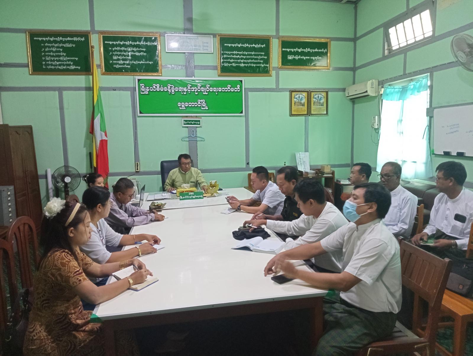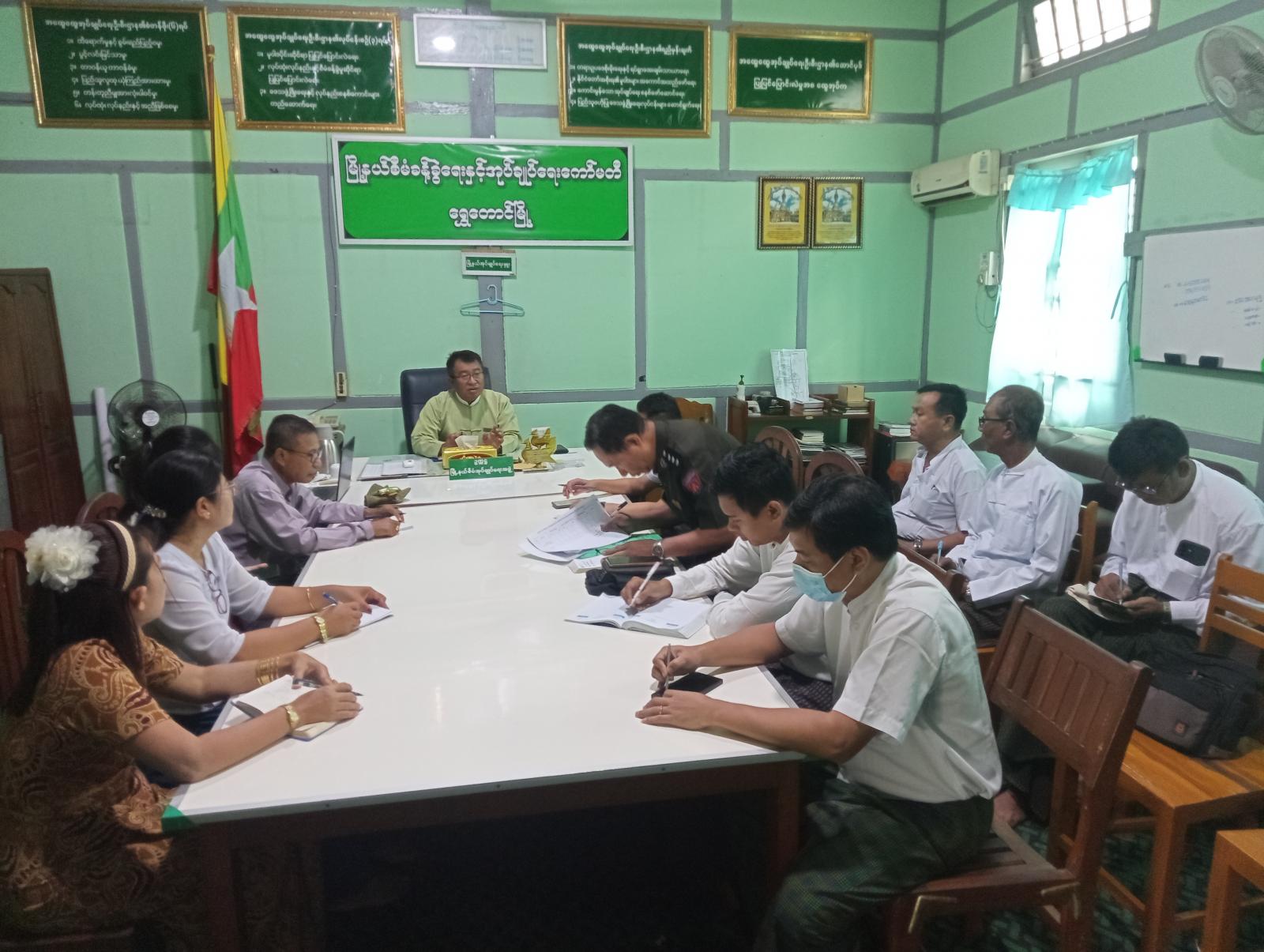 ဆက်လက်၍ မြို့နယ်လူဝင်မှုကြီးကြပ်ရေးနှင့်ပြည်သူ့အင်အားဝန်ကြီးဌာန မြို့နယ်ဦးစီးမှူးနှင့် မြို့နယ်ရွေးကောက်ပွဲကော်မရှင်အဖွဲ့ခွဲရုံး မြိုနယ်ရွေးကောက်ပွဲ အရာရှိ ဒေါ်သဲစုခိုင်စိုးတို့မှ လုပ်ထုံးလုပ်နည်းများနှင့်အညီ ပါတီစုံဒီမိုကရေစီအထွေထွေရွေးကောက်ပွဲ အောင်မြင်စွာ ကျင်းပနိုင်ရေး ဒေသခံပြည်သူများ၏ မဲစာရင်းများတိကျမှန်ကန်စွာပါရှိရေး၊ လုပ်ငန်းဆောင်ရွက်ထားရှိမှုများအား မြို့နယ်စီမံခန့်ခွဲရေးနှင့်အုပ်ချုပ်ရေးကော်မတီဥက္ကဋ္ဌနှင့် မြို့နယ်ရွေးကောက်ပွဲ ကော်မရှင်အဖွဲ့ဝင်များကိုတင်ပြခဲ့ကြရာ သိရှိလိုသည်များနှင့် ဆက်လက်လုပ်ဆောင်မည့်လုပ်ငန်းတာဝန်များကို တိုင်ပင်ဆွေးနွေးဆောင်ရွက်ခဲ့ကြကြောင်း သိရသည်။