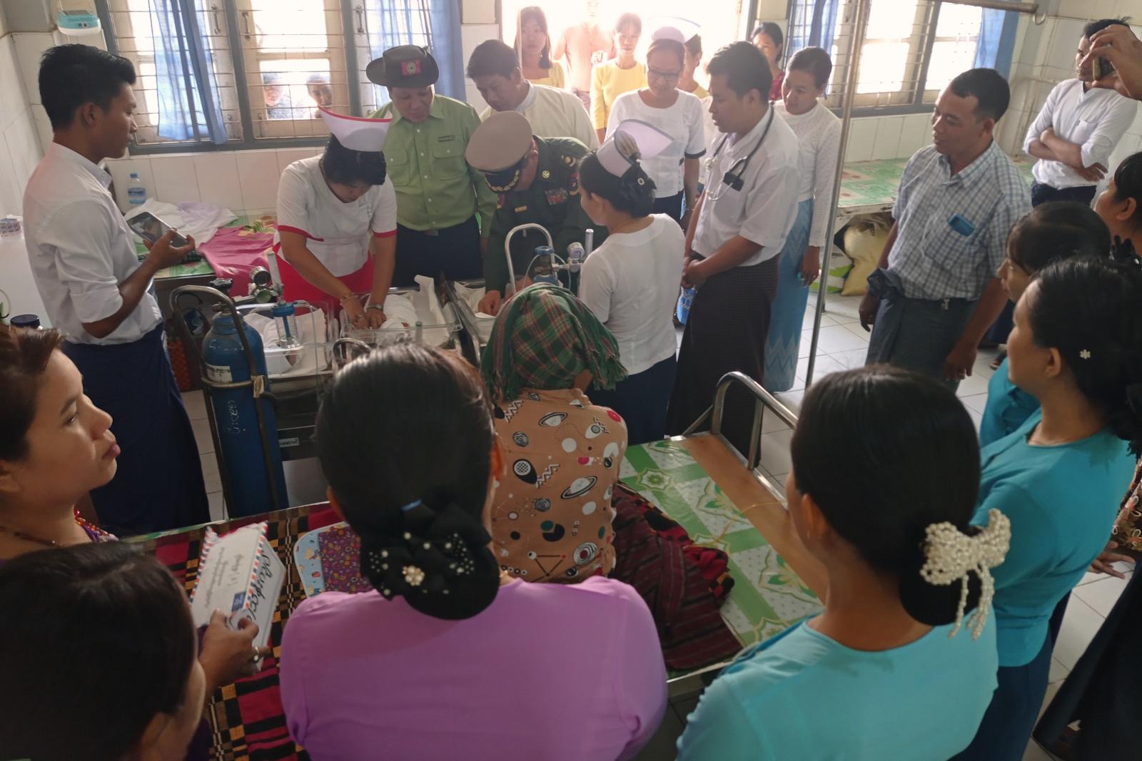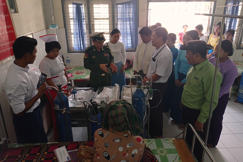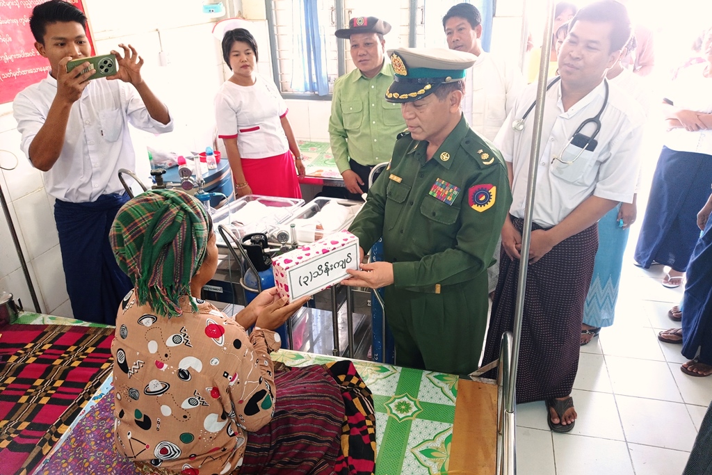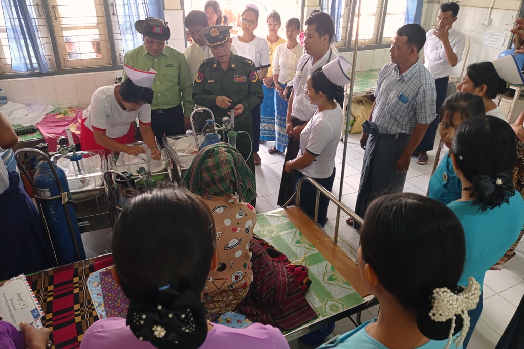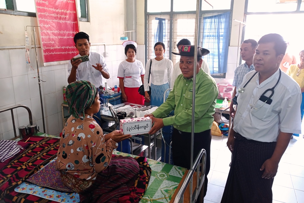 ဆက်လက်၍ ခရိုင်စီမံခန့်ခွဲရေးနှင့်အုပ်ချုပ်ရေးကော်မတီခေတ္တဥက္ကဋ္ဌနှင့်တာဝန်ရှိသူများသည် ပြည်သူ့ ဆေးရုံကြီးရှိ ကလေးကုသဆောင်ရှိ မွေးလူနာ(၃)ဦးနှင့် ကလေးငယ်များကို လှည့်လည်ကြည့်ရှု၍ တစ်ဦးလျှင် ငါးသောင်းကျပ်စီ ထောက်ပံ့ငွေများ ပေးအပ်ကြသည်။