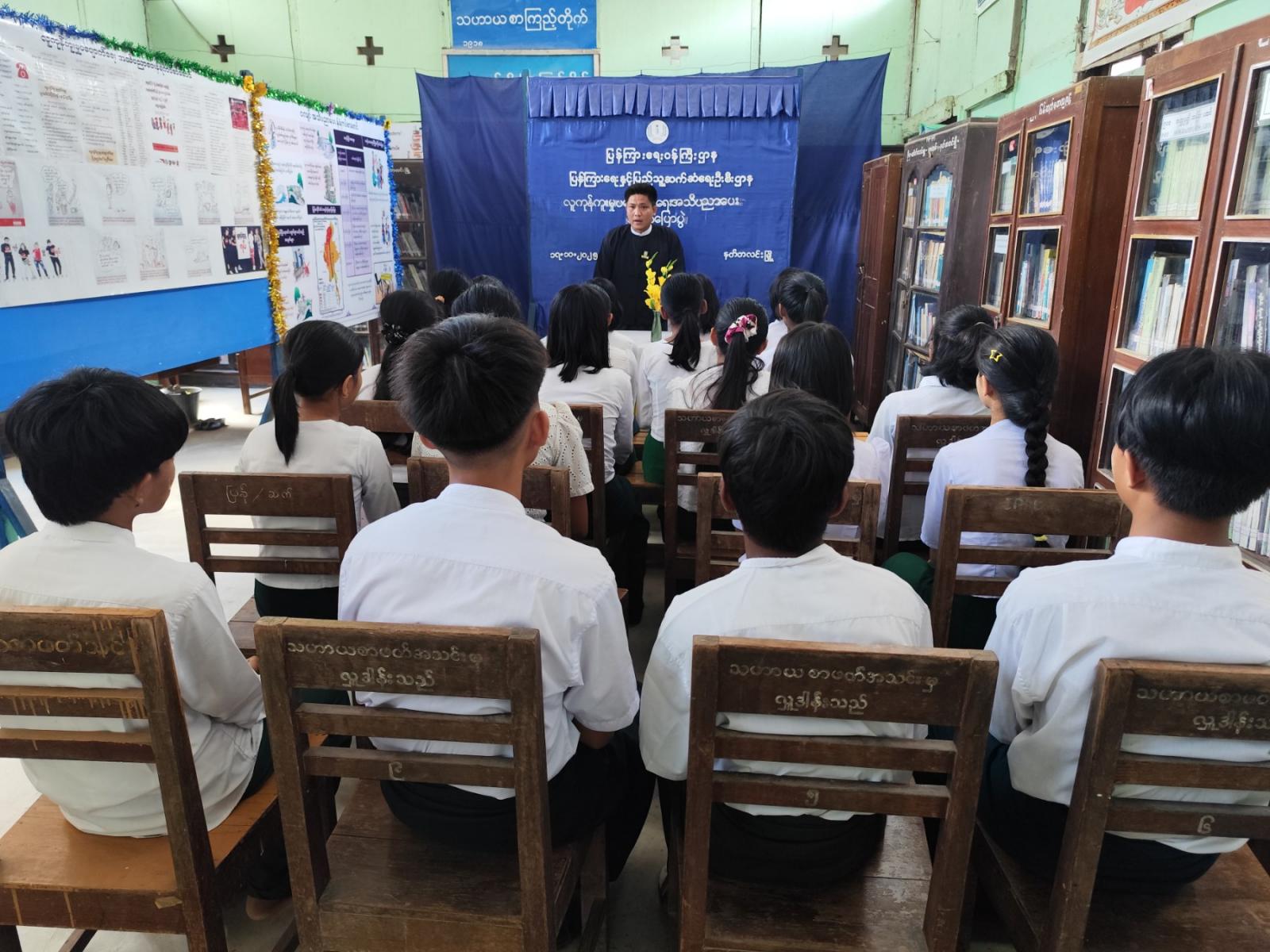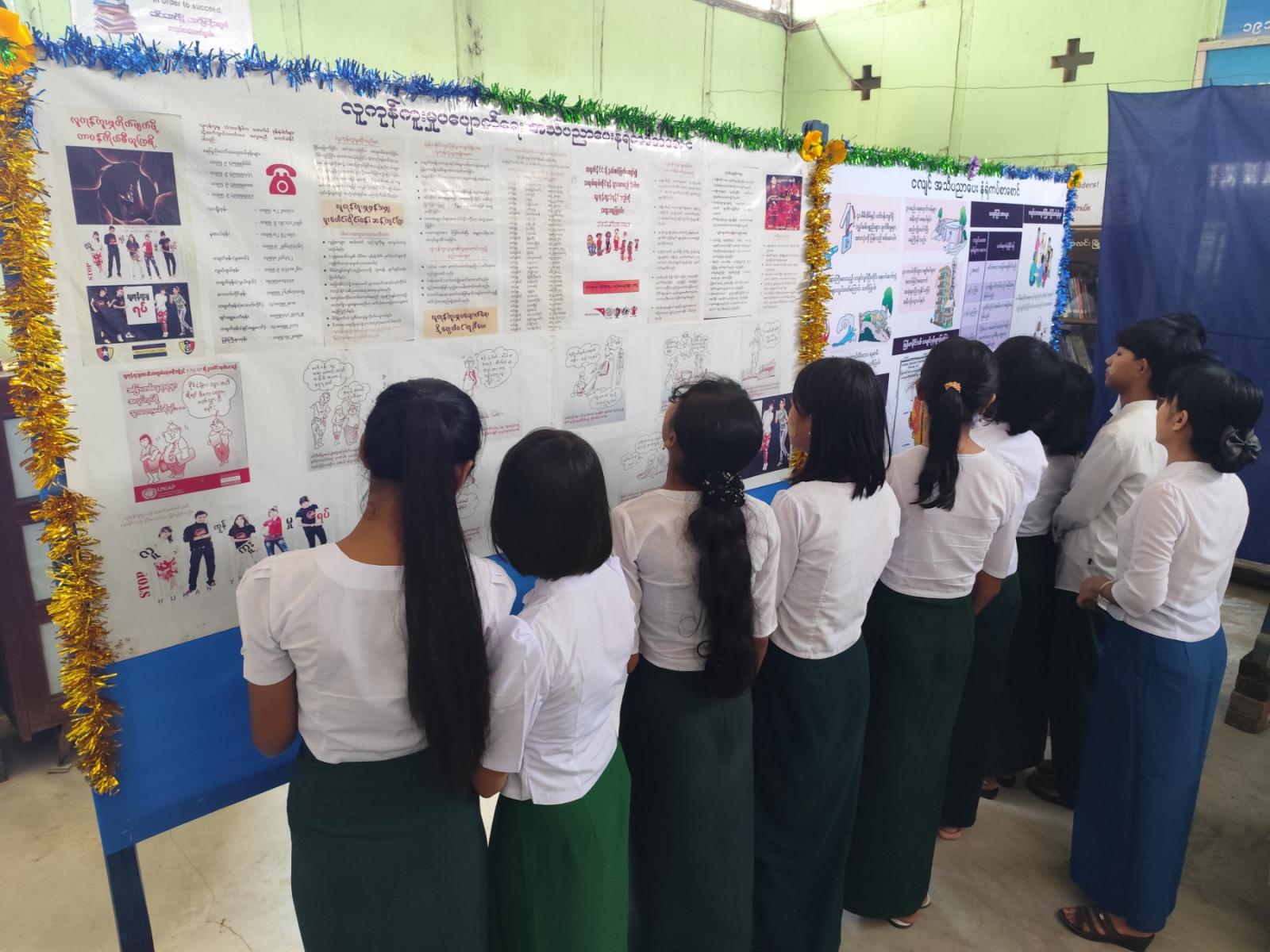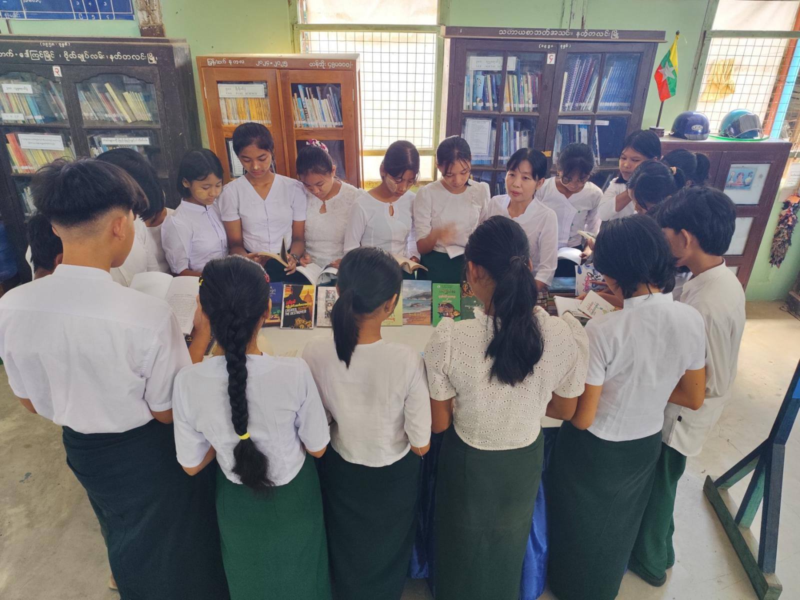 ထို့နောက် ခင်းကျင်းပြသထားသော စာအုပ်စာစောင်များ၊ လူကုန်ကူးမှုတားဆီးကာကွယ်ရေး အသိပညာပေး နံရံကပ်စာစောင်နှင့် ငလျင်အသိပညာပေးနံရံကပ်စာစောင်များကို ကျောင်သား၊ ကျောင်းသူများက စိတ်ပါဝင်စားစွာ ကြည့်ရှုလေ့လာခဲ့ကြောင်း သိရသည်။