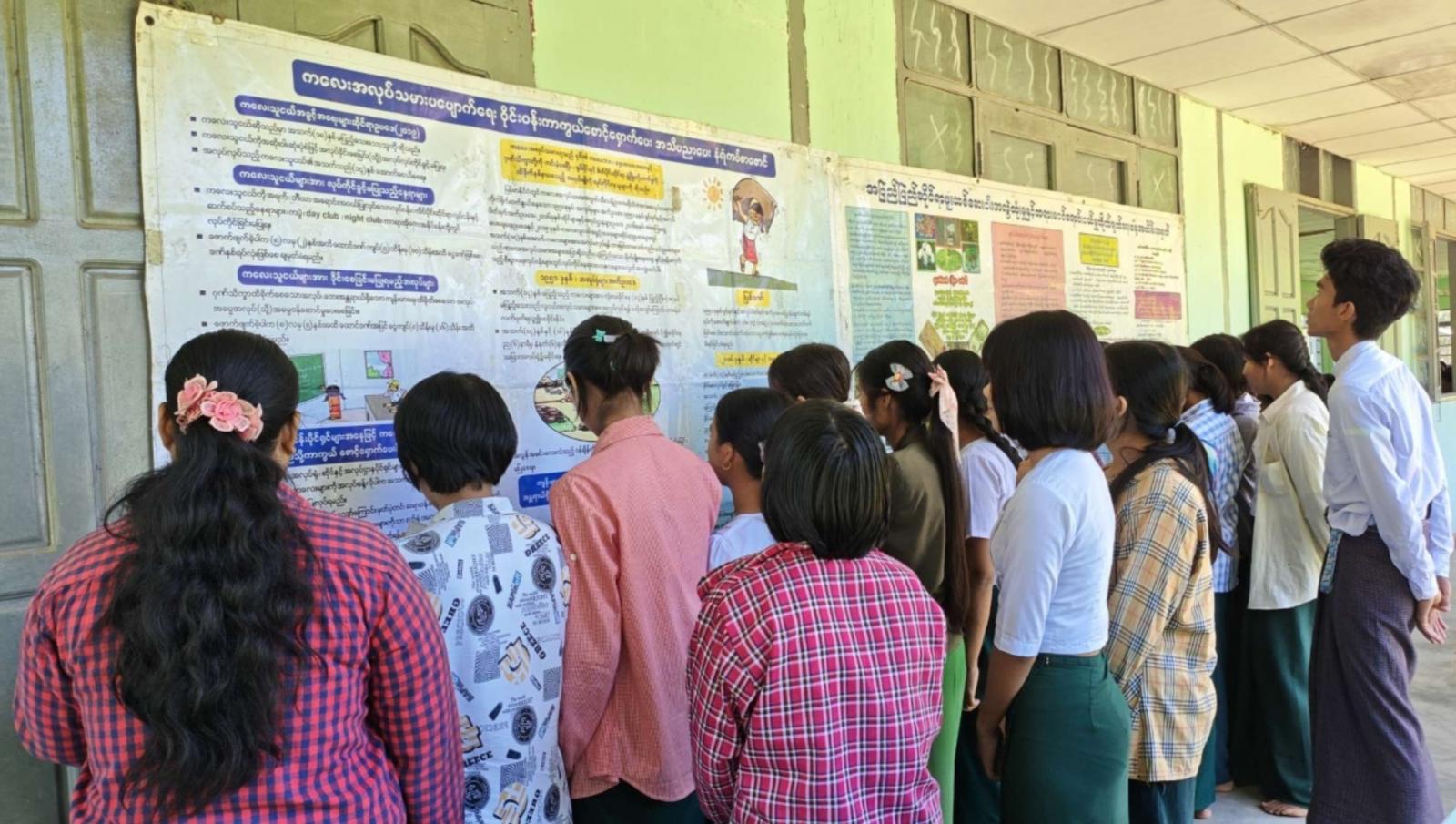 ထို့နောက် ကျောင်းသား၊ ကျောင်းသူ၊ လူငယ်၊ လူရွယ်များက ပြန်ကြားရေးနှင့်ပြည်သူ့ဆက်ဆံရေးဦးစီးဌာနမှ ခင်းကျင်းပြသထားသည့် ကလေးအလုပ်သမား ပပျောက်ရေးနံရံကပ်စာစောင်၊ မူးယစ်ဆေးဝါးအန္တရာယ်အသိပညာပေးနံရံကပ်စာစောင်တို့အား စိတ်ပါဝင်စားစွာကြည့်ရှုခဲ့ကြောင်း သိရသည်။