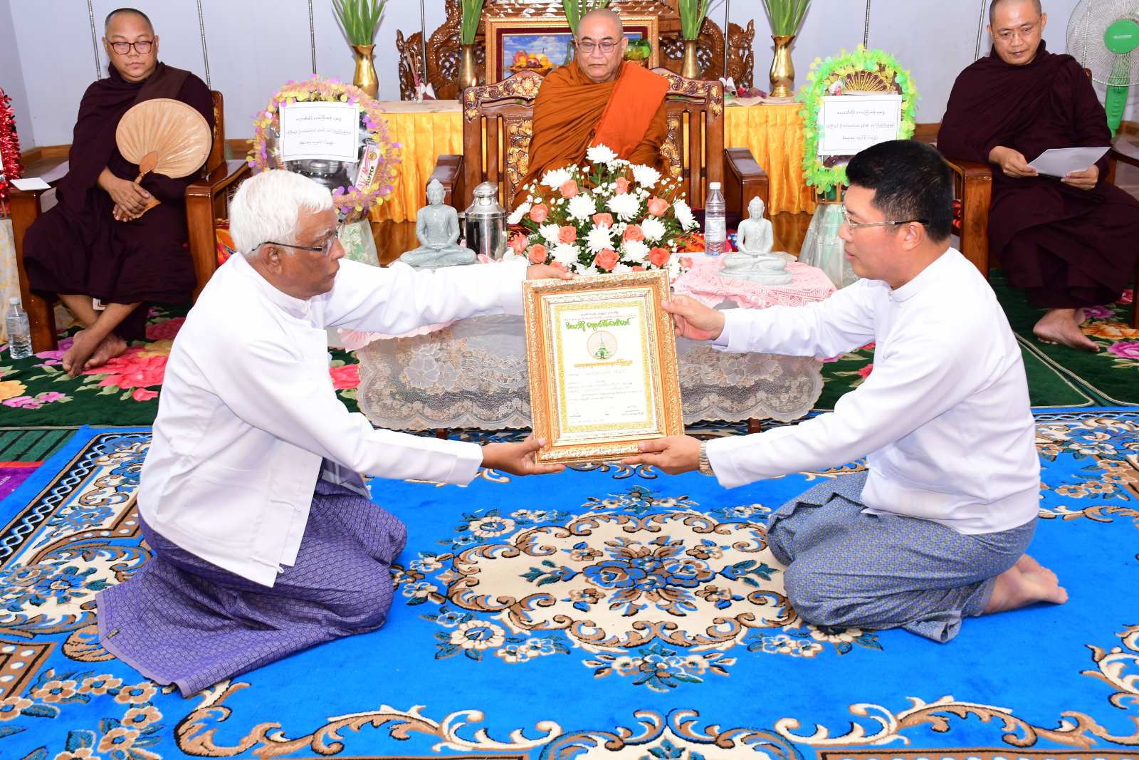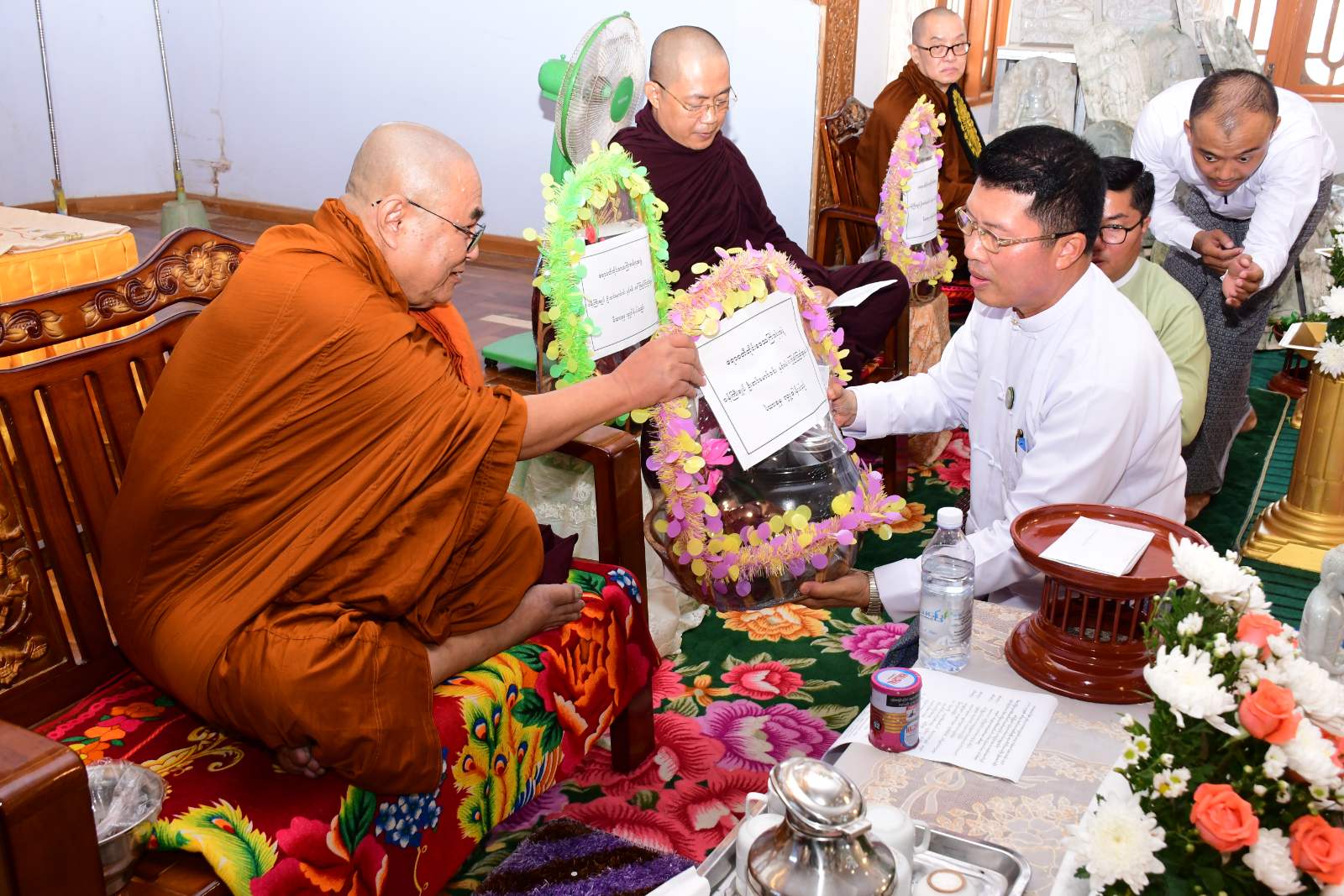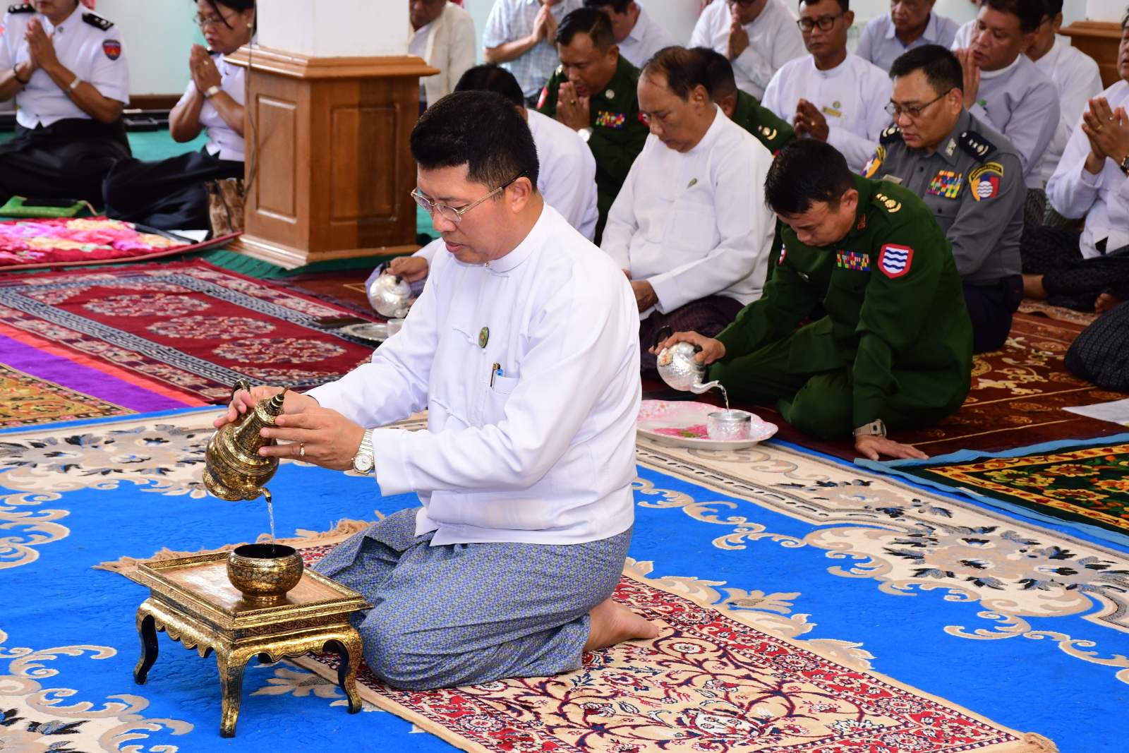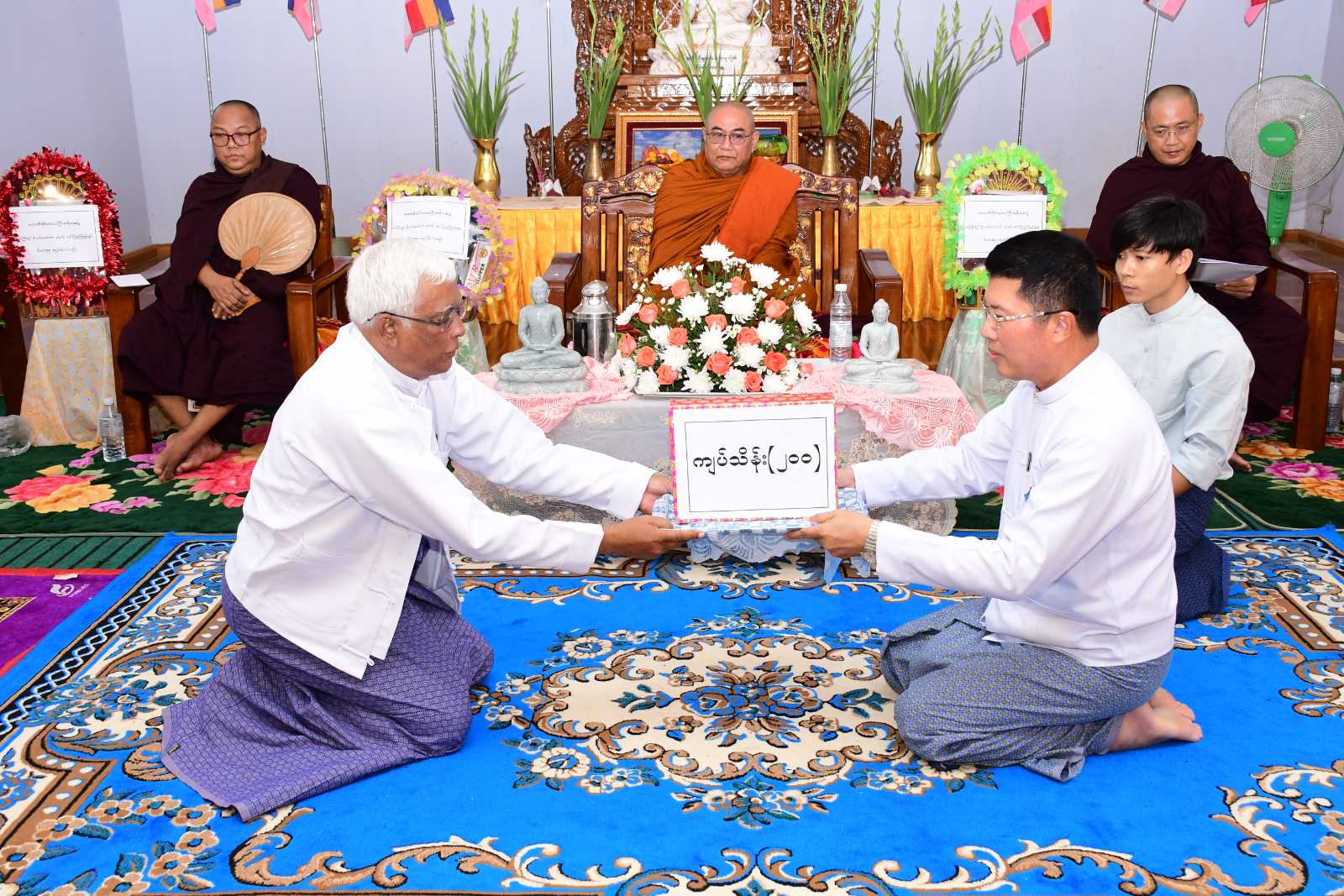 ဦးစွာ အခမ်းအနားကို “နမောတဿ” သုံးကြိမ်ရွတ်ဆို ဘုရားကန်တော့၍ ဖွင့်လှစ်ခဲ့ပြီးနောက် အင်္ဂပူမြို့နယ်၊ သံဃနာယကအဖွဲ့ဥက္ကဋ္ဌ၊ ရေကျော်စန္ဒာရုံကျောင်းတိုက်ဆရာတော် ဘဒ္ဒန္တမဏ္ဍလထံမှ တိုင်းဒေသကြီးဝန်ကြီးချုပ်နှင့် ဧည့်ပရိသတ်များက ငါးပါးသီလ ခံယူဆောက်တည်ခဲ့ကြပြီး ဆရာတော်သံဃာတော်အရှင်သူမြတ်များအား လှူဖွယ်ဝတ္တုပစ္စည်းများ ဆပ်ကပ်လှူဒါန်းခဲ့သည်။ ယင်းနောက် မဟာသဒ္ဓမ္မဇောတိကဓဇ၊ သာသနဓဇဓမ္မာစရိယ၊ ဝိနိယဝိဒူ B.A(Myanmar)၊ မဟာစည်နယ်လှည့်ဓမ္မကထိက သဒ္ဓမ္မဂုဏ်ရည်အရှင်ကုသလ ကျောက်စိမ်းဆရာတော်က တိုင်းဒေသကြီးဝန်ကြီးချုပ်နှင့် တာဝန်ရှိသူများအား ကျောက်စိမ်း ဆင်းတုရုပ်ပွားတော်မြတ်များအား ပေးအပ်လှူဒါန်းခဲ့သည်။