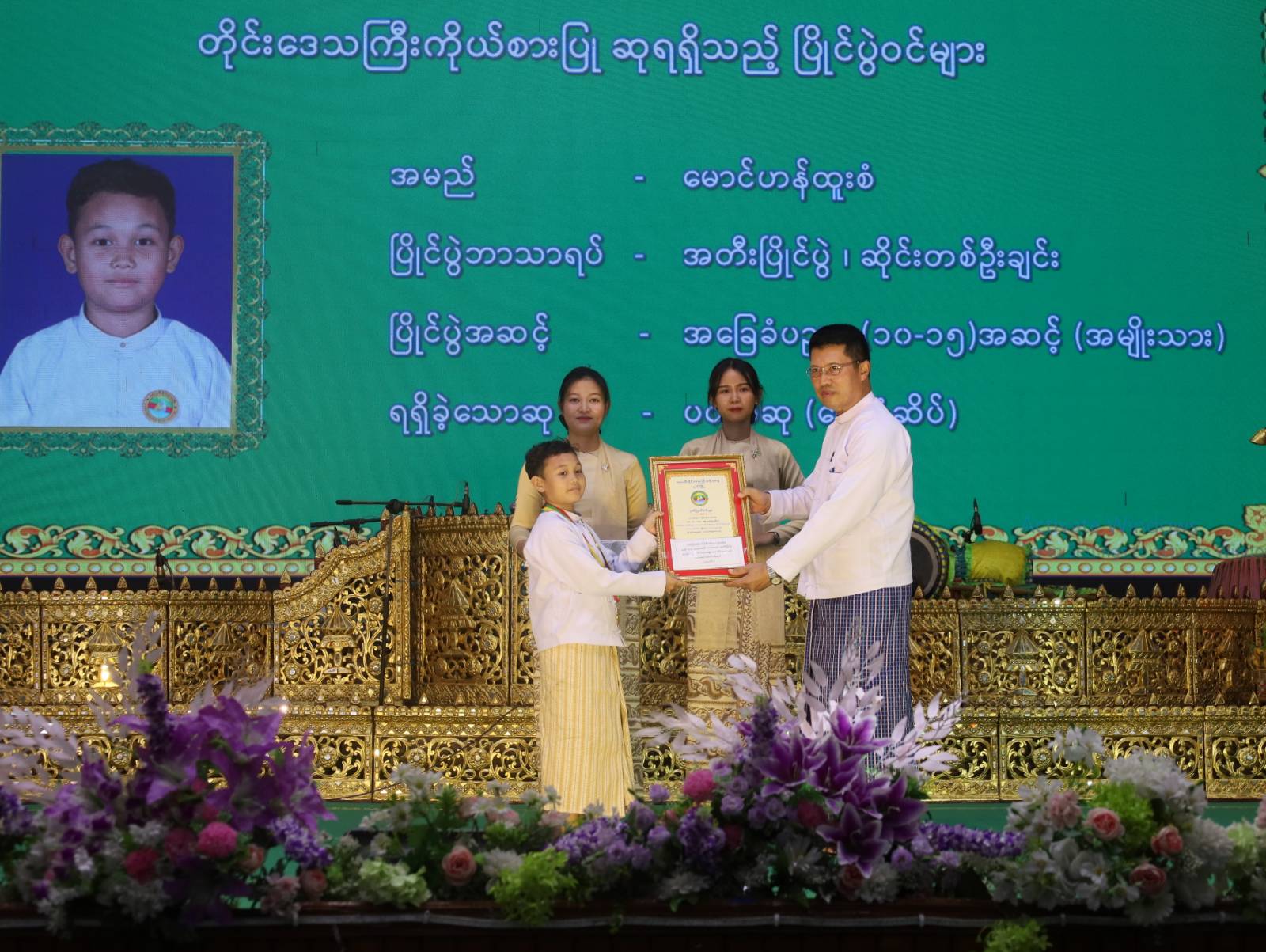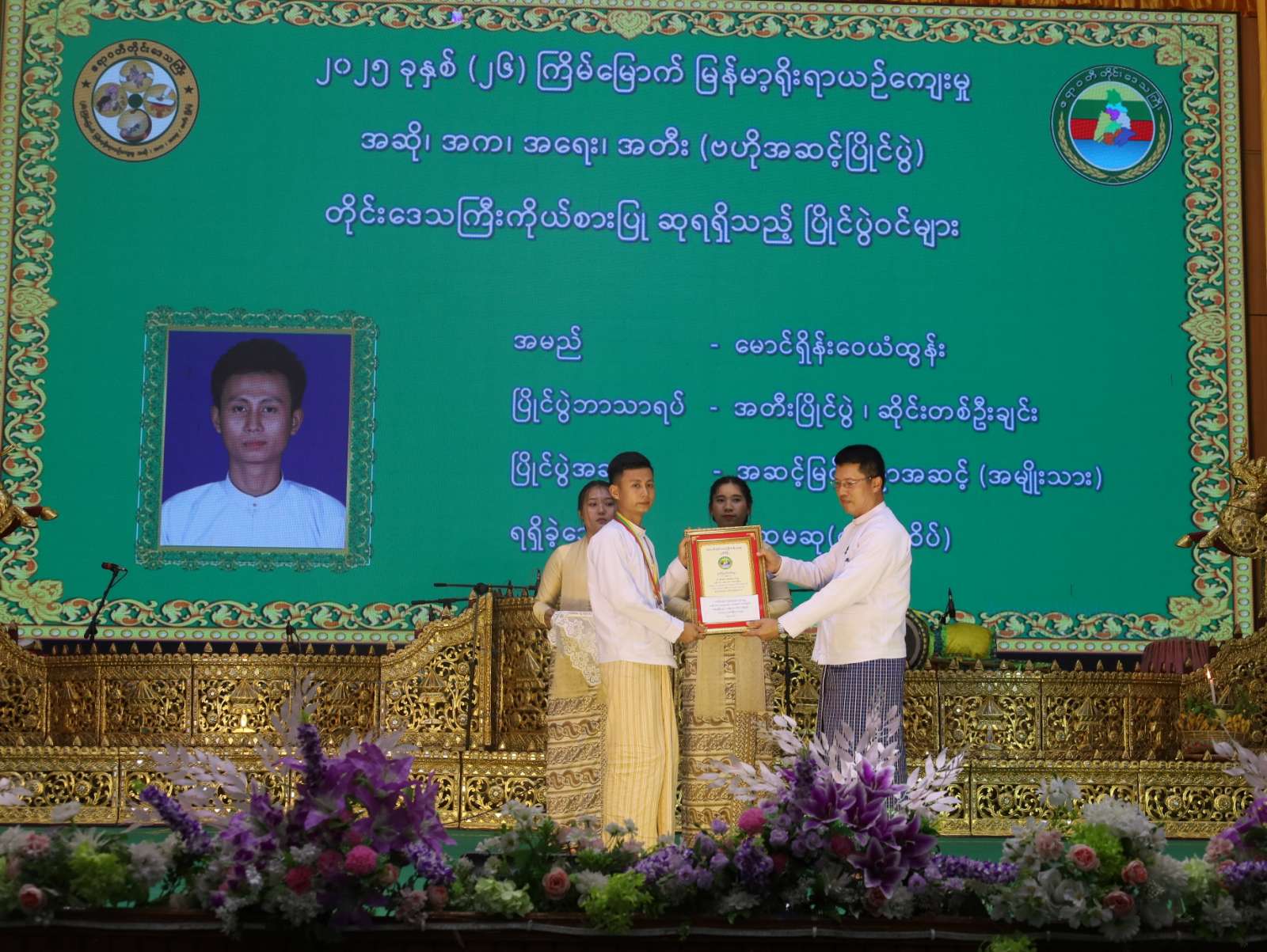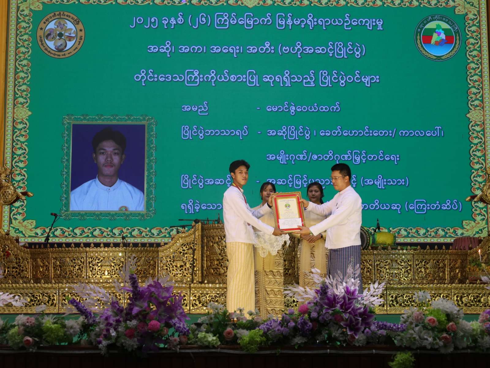 ထို့နောက် ဆုချီးမြှင့်ပွဲ အခမ်းအနားကိုဆက်လက်ပြုလုပ်ရာ အဆိုပြိုင်ပွဲတွင် အဆင့်မြင့်ပညာအဆင့်(အမျိုးသား)၊ ခေတ်ဟောင်း တေး/ကာလပေါ်တွင် ပထမဆု (ရွှေတံဆိပ်)နှင့် အမျိုးဂုဏ်၊ ဇာတိဂုဏ်မြှင့်တင်ရေးတွင် တတိယဆု (ကြေးတံဆိပ်) ဆု၊ အတီးပြိုင်ပွဲ၊ အဆင့်မြင့်ပညာအဆင့် (အမျိုးသား)၊ ဆိုင်းတစ်ဦးချင်းတွင် ပထမဆု (ရွှေတံဆိပ်)၊ အတီးပြိုင်ပွဲ၊ အဆင့်မြင့်ပညာအဆင့် (အမျိုးသား)၊ နှဲတွင် ပထမဆု (ရွှေတံဆိပ်)၊ အတီးပြိုင်ပွဲ၊ အခြေခံပညာ(၁၅-၂၀)အဆင့် (အမျိုးသား)၊ ဒုံမင်းတွင် ပထမဆု (ရွှေတံဆိပ်)၊ အတီးပြိုင်ပွဲ၊ အဆင့်မြင့်ပညာအဆင့် (အမျိုးသား)၊ အိုးစည်အဖွဲ့လိုက်တွင် ပထမဆု(ရွှေတံဆိပ်)၊ အတီးပြိုင်ပွဲ၊ အခြေခံပညာ (၁၀-၁၅)အဆင့် (အမျိုးသား)၊ ဆိုင်းတစ်ဦးချင်းတွင် ပထမဆု (ရွှေတံဆိပ်)ရရှိသူများနှင့် (၂၆)ကြိမ်မြောက် မြန်မာ့ရိုးရာယဉ်ကျေးမှု အဆို၊ အက၊ အရေး၊ အတီးပြိုင်ပွဲ၊ ဧရာဝတီတိုင်းဒေသကြီးကိုယ်စားပြု အသင်းအုပ်ချုပ်သူ/ ပံ့ပိုးသူများအား တိုင်းဒေသကြီးဝန်ကြီးချုပ်ကလည်းကောင်း၊ အဆိုပြိုင်ပွဲ၊ အခြေခံပညာ (၁၀-၁၅)အဆင့် (အမျိုးသမီး)၊ ခေတ်ဟောင်းတေး/ ကာလပေါ်တွင် ပထမဆု(ရွှေတံဆိပ်)၊ အဆိုပြိုင်ပွဲ၊ မဟာဂီတတွင် ပထမဆု (ရွှေတံဆိပ်)၊ အဆိုပြိုင်ပွဲ၊ အခြေခံပညာ (၁၅-၂၀)အဆင့် (အမျိုးသမီး)၊ ခေတ်ဟောင်းတေး/ကာလပေါ်တွင် ပထမဆု (ရွှေတံဆိပ်)၊ အတီးပြိုင်ပွဲ၊ မယ်ဒလင်တွင် တတိယဆု (ကြေးတံဆိပ်)၊ အတီးပြိုင်ပွဲ၊ အခြေခံပညာ (၁၀-၁၅)အဆင့် (အမျိုးသမီး)၊ စောင်းတွင် ပထမဆု (ရွှေတံဆိပ်)၊ အတီးပြိုင်ပွဲ၊ အခြေခံ ပညာ (၁၅-၂၀)အဆင့်၊ စန္ဒရားတွင် တတိယဆု (ကြေး တံဆိပ်)၊ အတီးပြိုင်ပွဲ၊ အခြေခံပညာ (၁၀-၁၅)အဆင့် (အမျိုးသား) ဒုံမင်းတွင် ပထမဆု (ရွှေတံဆိပ်)၊ အတီးပြိုင်ပွဲ၊ အခြေခံပညာ (၁၅-၂၀) အဆင့်၊ ဆိုင်းတစ်ဦးချင်းတွင် တတိယဆု (ကြေးတံဆိပ်)၊ အတီးပြိုင်ပွဲ၊ အဆင့်မြင့်ပညာအဆင့် (အမျိုးသား)၊ ဒိုးပတ်အဖွဲ့လိုက်တွင် ပထမဆု (ရွှေတံဆိပ်)ဆုရရှိသူများနှင့် (၂၆) ကြိမ်မြောက် မြန်မာ့ရိုးရာယဉ်ကျေးမှု အဆို၊ အက၊ အရေး၊ အတီးပြိုင်ပွဲတွင် “တို့ဘိုးဘွားအမွေ ဧရာမြေ” သီချင်းဖြင့် ပါဝင် တင်ဆက်ခဲ့သော ဧရာဝတီတိုင်းဒေသကြီးကိုယ်စားပြု ကျေးလက်ရိုးရာအကအဖွဲ့အား တိုင်းဒေသကြီးဝန်ကြီးချုပ်၏ ဇနီးကလည်းကောင်း၊ အကပြိုင်ပွဲ၊ အခြေခံပညာ (၁၀-၁၅)အဆင့် (အမျိုးသား)၊ တစ်ဦးချင်းအကတွင် ဒုတိယဆု (ငွေတံဆိပ်)၊ အတီးပြိုင်ပွဲ၊ အဆင့်မြင့်ပညာအဆင့် (အမျိုးသား)၊ ပလွေတွင် ဒုတိယဆု (ငွေတံဆိပ်)၊ အတီးပြိုင်ပွဲ၊ အဆင့်မြင့်ပညာအဆင့် (အမျိုးသမီး)၊ မယ်ဒလင်တွင် ဒုတိယဆု (ငွေတံဆိပ်)၊ အတီးပြိုင်ပွဲ၊ အခြေခံပညာ (၁၀-၁၅) အဆင့် (အမျိုးသမီး)၊ ဒုံမင်းတွင် ဒုတိယဆု (ငွေတံဆိပ်) ဆုရရှိသူများအား ပုသိမ်လေတပ်စခန်းဌာနချုပ်မှူးကလည်းကောင်း၊ အတီးပြိုင်ပွ