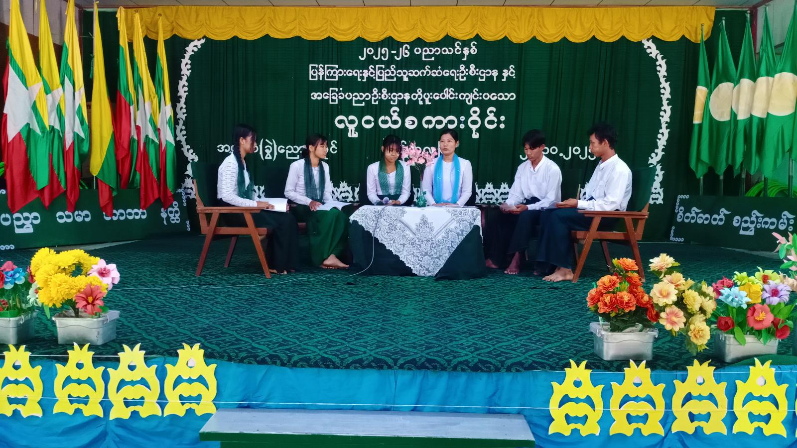 ဆက်လက်၍ လူငယ်စကားဝိုင်းကျင်းပရာ ခရိုင်ပြန်ကြားရေးနှင့်ပြည်သူ့ဆက်ဆံရေးဦးစီးဌာန ဦးစီးအရာရှိ ဒေါ်ခိုင်ဇင်က ဦးဆောင်ဆွေးနွေးသူအဖြစ်ဆောင်ရွက်ပြီး ကျောင်းသား/ကျောင်းသူ ငါးဦးတို့က လူငယ်နှင့်သဘာဝဘေးအန္တရာယ်၊ လူငယ်နှင့်မူးယစ်ဆေးဝါး၊ လူငယ်နှင့်ပညာရေး၊ လူငယ်နှင့်ယဥ်ကျေးမှု၊ လူငယ်နှင့်စာရိတ္တခေါင်းစဥ်များဖြင့် ဆွေးနွေးခဲ့ကြပြီး တက်ရောက်လာသော ကျောင်းသား ကျောင်းသူများ၏ မေးမြန်းချက်များကို ပြန်လည်ဖြေကြားပေးခဲ့သည်။