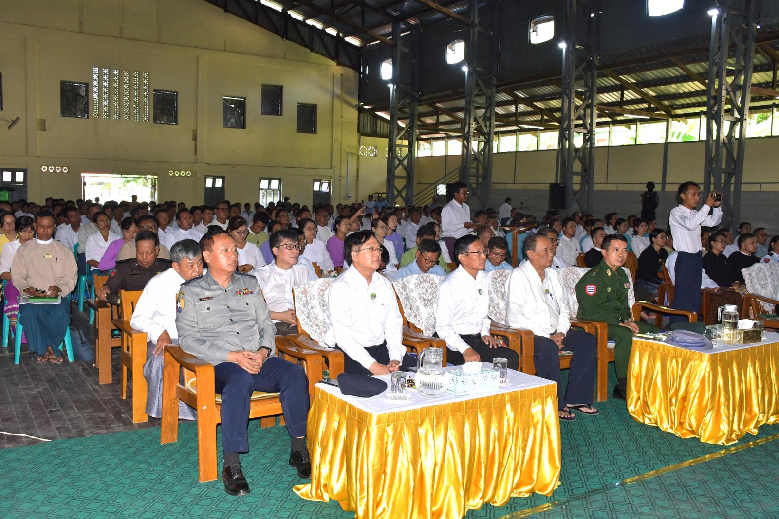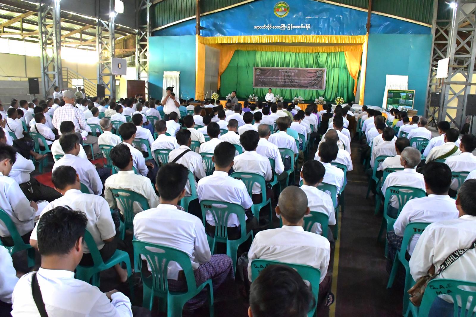 ဆက်လက်၍ မြန်အောင်ခရိုင်စီမံခန့်ခွဲရေးနှင့်အုပ်ချုပ်ရေးကော်မတီဥက္ကဋ္ဌ ဦးမျိုးလှိုင်က မြန်အောင်ခရိုင်အတွင်း မိုးစပါးနှင့်ပဲမျိုးစုံ စိုက်ပျိုးမှုအခြေအနေများကို ရှင်းလင်းတင်ပြသည်။