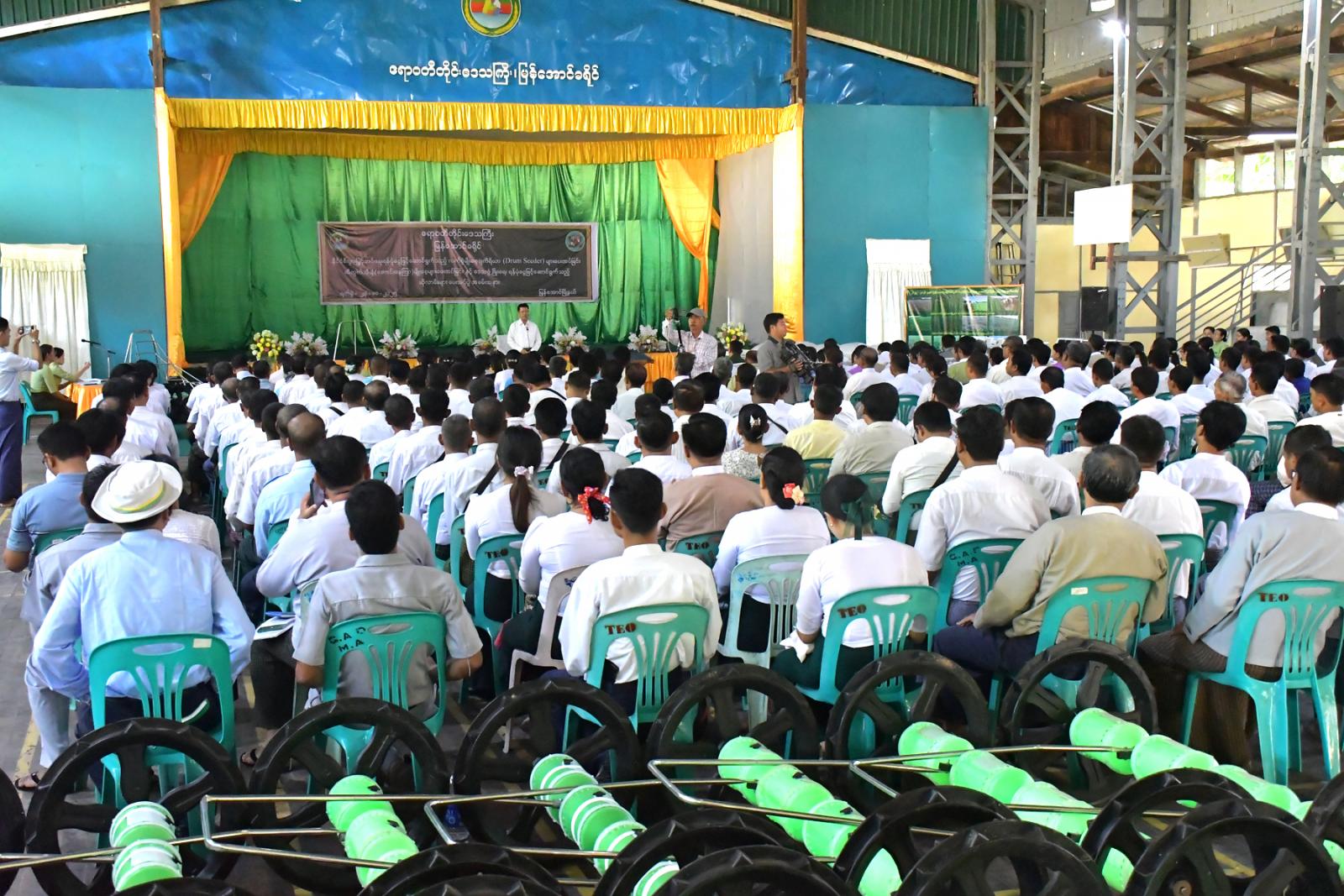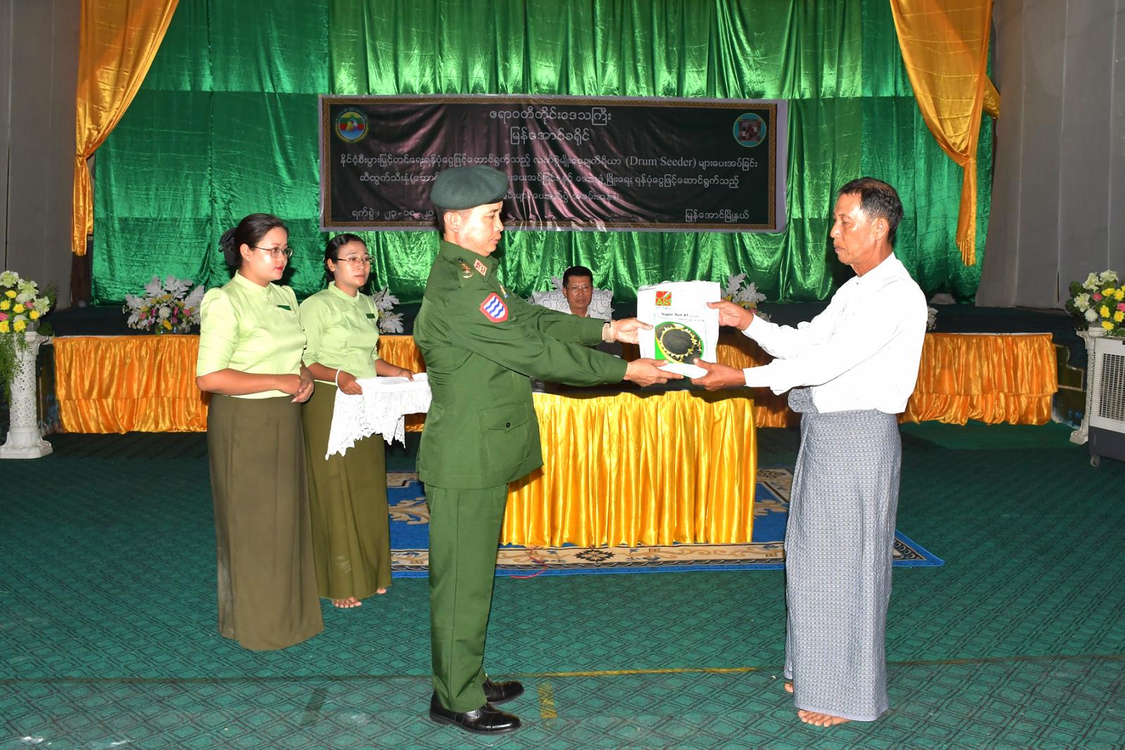 အခမ်းအနားတွင် ဧရာဝတီတိုင်းဒေသကြီးအစိုးရအဖွဲ့ဝန်ကြီးချုပ် ဦးတင်မောင်ဝင်းက နိုင်ငံ့စီးပွားမြှင့်တင်ရေးရန်ပုံငွေဖြင့်ဆောင်ရွက်သည့် လက်စွဲမျိုးစေ့ချကိရိယာ (Drum-Seeder)များကို မြန်အောင်၊ ကြံခင်း၊ အင်္ဂပူမြို့နယ်တို့မှ မိုးစပါးစိုက်တောင်သူများအားပေးအပ်ခဲ့သည်။