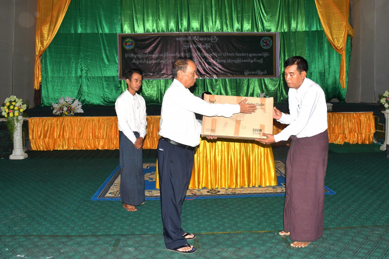 ဆက်လက်၍ ဧရာဝတီတိုင်းဒေသကြီးအစိုးရအဖွဲ့ လုံခြုံရေးနှင့်နယ်စပ်ရေးရာဝန်ကြီး ဗိုလ်မှူးကြီး ခန့်မွန်ဆွေက ဆီထွက်အထူးဇုန်ဧရိယာတွင်စိုက်ပျိုးသော တောင်သူများအား ဆီထွက်သီးနှံ (ဆောင်းနေကြာ) မျိုးစေ့များပေးအပ်ပြီး သယံဇာတရေးရာဝန်ကြီး ဦးအုန်းမြင့်က ဒေသ ဖွံ့ဖြိုးရေးရန်ပုံငွေဖြင့် ဆောင်ရွက်သည့် ဆိုလာမီးများအား ပေးအပ်ခဲ့ကြသည်။
