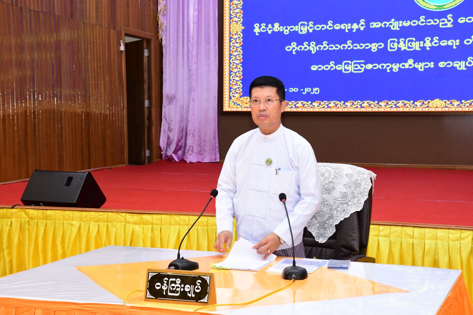 ဦးစွာ တိုင်းဒေသကြီးဝန်ကြီးချုပ်က တောင်သူများအား နိုင်ငံ့စီးပွားမြှင့်တင်ရေး ရန်ပုံငွေဖြင့် သွင်းအားစုများ ပေးအပ်ခြင်း၊ နိုင်ငံ့စီးပွားမြှင့်တင်ရေးနှင့် အကျုံးမဝင်သည့် တောင်သူများအား ဓာတ်မြေဩဇာများ တိုက်ရိုက်သက်သာစွာ ဖြန့်ဖြူးပေးခြင်းဖြင့် ပန်းတိုင် အထွက်နှုန်းရရှိရေးအတွက် များစွာအထောက်အပံ့ရမည်ဖြစ်ကြောင်း၊ တောင်သူများ၏ လက်ဝယ်သို့ သွင်းအားစုများ အချိန်မီပေးအပ်ရန်လိုအပ်မည်ဖြစ်ပြီး သက်ဆိုင်ရာ တာဝန်ရှိသူများက ကြပ်မတ်ဆောက်ရွက်ရန်လိုပါကြောင်း၊ တောင်သူများကလည်း သတ်မှတ်ကာလအတွင်း သွင်းအားစုနှင့်ညီမျှသည့် သီးနှံများပြန်လည်ပေးသွင်းရန် လိုအပ်မည်ဖြစ်ပါကြောင်းနှင့် အချိန်မီပေးသွင်းနိုင်ရေးအတွက် တာဝန်ရှိသူများက စနစ်တကျ စီမံဆောင်ရွက်ရန် လိုအပ်မည်ဖြစ်ပါကြောင်း၊ တောင်သူများကလည်း သွင်းအားစုများကို အကျိုးရှိစွာသုံးစွဲရန် လိုအပ်မည်ဖြစ်ပါကြောင်း၊ တောင်သူများအား ဓာတ်မြေဩဇာများ တိုက်ရိုက် သက်သာစွာ ဖြန့်ဖြူးနိုင်ရေးအတွက် ပါဝင်ဆောင်ရွက် စာချုပ်ချုပ်ဆိုခဲ့သည့် ကုမ္ပဏီများကိုလည်း ကျေးဇူးတင်ရှိပါကြောင်း အမှာစကားပြောကြားသည်။