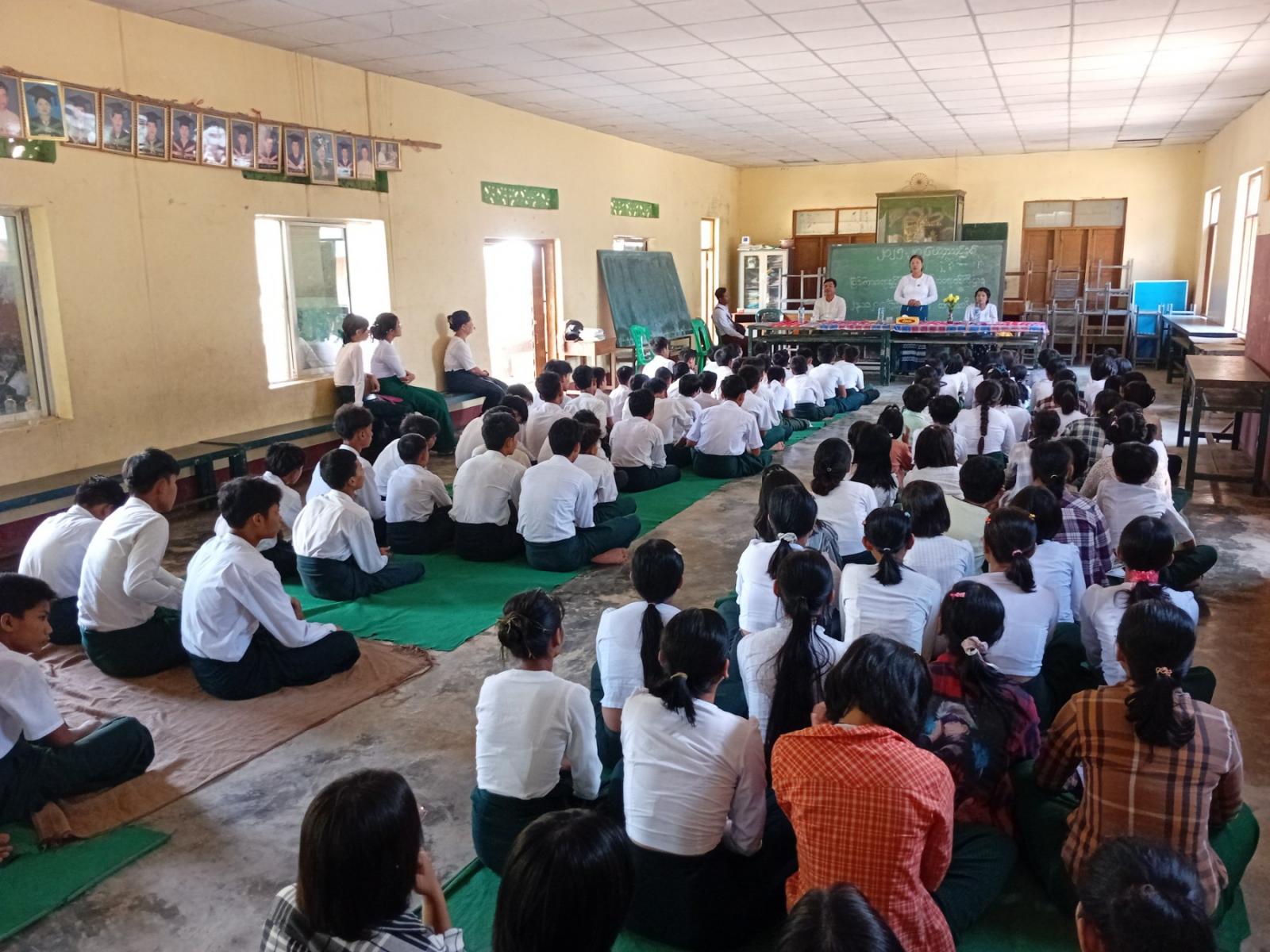 ရှေးဦးစွာ ကျောင်းအုပ်ဆရာကြီး ဦးအောင်ကျော်မိုးက အမှာစကားပြောကြားပြီး ခရိုင်ပြန်ကြားရေးနှင့်ပြည်သူ့ဆက်ဆံရေးဦးစီးဌာနမှ ခရိုင်ဦးစီးမှူး ဒေါ်ခင်စန္ဒာဆွေက ကျောင်းသား ကျောင်းသူများအား"ဗလငါးတန်ဖွံ့ဖြိုးဖို့ စာပေလေ့လာဖတ်ရှုကြပါစို့" ခေါင်းစဉ်ဖြင့် အသိပညာပေးပြောကြားခြင်း၊ ဦးစီးအရာရှိ ဒေါ်အေးအေးမာက "လူငယ်တွေစာဖတ်ဖို့ စာကြည့်တိုက်ကို သွားကြစို့" ခေါင်းစဉ်ဖြင့် အသိပညပေး ဟောပြောပါသည်။