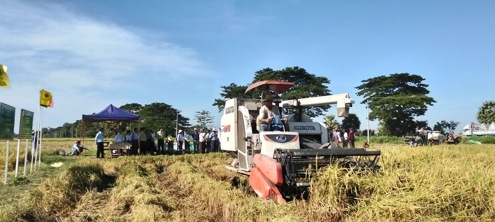 ဧရာဝတီတိုင်းဒေသကြီး၊ မြောင်းမြခရိုင်၊ အိမ်မဲမြို့နယ် ကွင်းကလေးကျေးရွာအုပ်စု၊ ပရိုက် ကျေးရွာ တောင်သူ ဦးဝင်းဘို၏ ကွင်းအမှတ် ၉၂၊ ဦးပိုင်အမှတ် ၃၆/၃ လယ်မြေ(၂)ဧက တွင် မိုးစပါးဆင်းသုခစပါးမျိုး စံကွတ်ရိတ်သိမ်းပွဲကို ယနေ့နံနက် (၉) နာရီအချိန်ကကျင်းပခဲ့သည်။