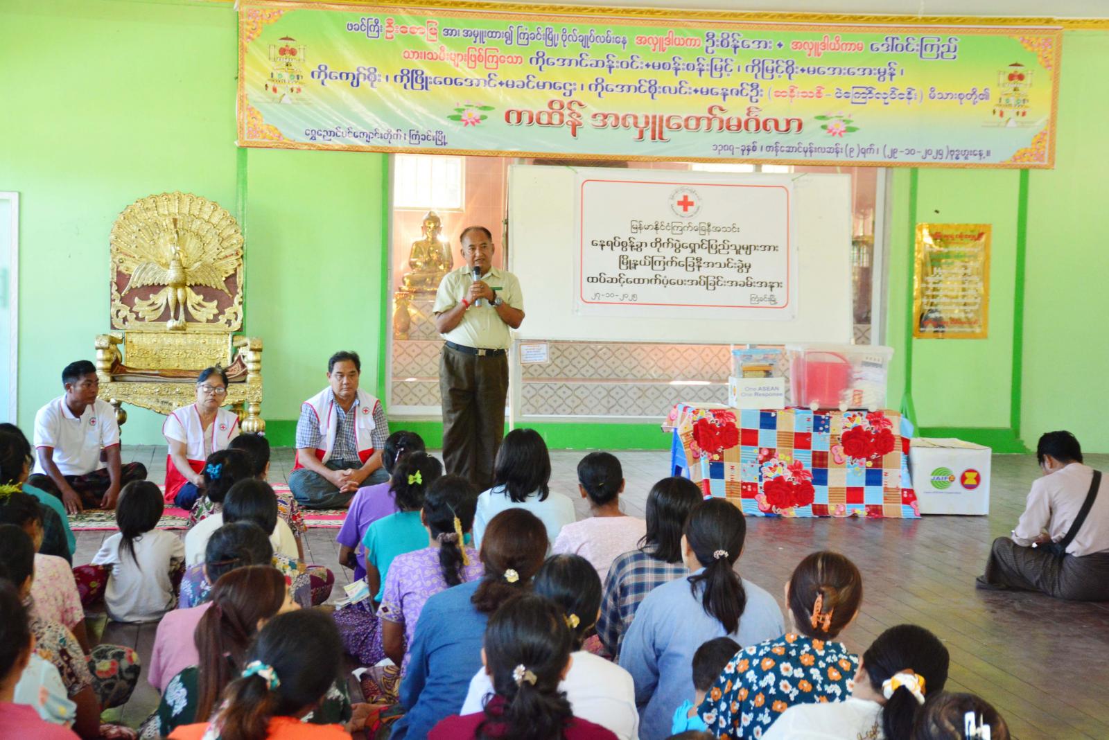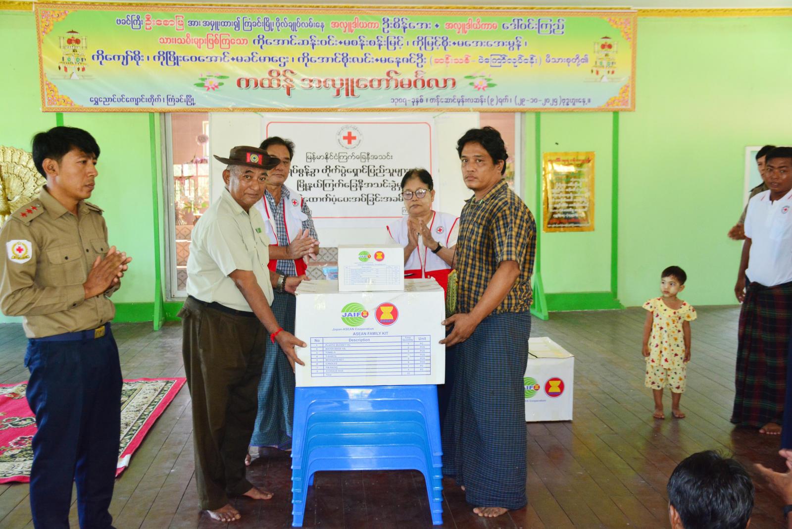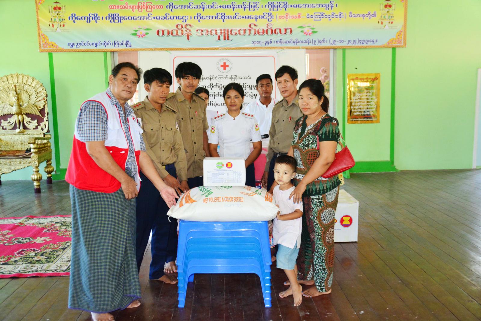 အခမ်းအနားတွင် မြို့နယ်စီမံခန့်ခွဲရေးနှင့် အုပ်ချုပ်ရေးကော်မတီဥက္ကဋ္ဌ ဦးဝင်းလှိုင်က အဖွင့်အမှာစကားပြောကြားပြီး၊ မြို့နယ်ကြက်ခြေနီအသင်းခွဲဥက္ကဋ္ဌ ဦးနေလင်း၊ ဒုဥက္ကဋ္ဌ ဒေါ်ခင်ခင်စန်း တို့က ASEAN က လူသားချင်းစာနာထောက်ထားမှုဆိုင်ရာအနေဖြင့် ဧရာဝတီတိုင်းဒေသကြီးအတွင်းရှိ မြို့နယ် ၂၆ မြို့နယ်သို့ ကြောင်းအမျိုးမျိုးဖြင့် ရှောက်ရှိလာကြသော ယာယီနေရပ်စွန့်ခွာ ပြည်သူများအား ထောက်ပံ့ပေးအပ်ရန်အတွက် မြန်မာနိုင်ငံကြက်ခြေနီအသင်းကို ပေးပို့လာသော ပစ္စည်းများကို မြို့နယ်ကြက်ခြေနီအသင်းခွဲက ယခုလိုထပ်ဆင့်ထောက်ပံ့ပေးအပ်ရခြင်းဖြစ်ကြောင်း၊ မြန်မာနိုင်ငံကြက်ခြေနီအသင်းအနေဖြင့် အခြေခံမူ(၇)ချက်အညီ ဆောင်ရွက်လျက်ရှိကြောင်း ပြောကြားခဲ့ကြသည်။ ထို့နောက် မြို့နယ်စီမံခန့်ခွဲရေးနှင့်အုပ်ချုပ်ရေးကော်မတီဥက္ကဋ္ဌ ဦးဝင်းလှိုင်၊ ဒုတိယမြို့နယ် အုပ်ချုပ်ရေးမှူး ဦးပြည့်သိမ်းကျော်၊ မြို့နယ်ကြက်ခြေနီအသင်းခွဲဥက္ကဋ္ဌ ဦးနေလင်း၊ ဒုဥက္ကဋ္ဌ ဒေါ်ခင်ခင်စန်းတို့က ယာယီနေရပ်စွန့်ခွာပြည်သူ ၂၁၈ ဦး၊ အိမ်ထောင်စု ၈၉ စုတို့အား အိမ်ထောင်တစ်စု လျှင် ဆန် ၂၄ ပြည် တစ်အိတ်နှင့် မိသားစု ၅ ဦးအထက်ရှိသူများအား ASEAN FAMILY KIT အကြီးအား လည်းကောင်း၊ ၅ ဦးအောက်ရှိသူများအား ASEAN FAMILY KIT အငယ်များအား အသီးသီးပေးအပ်ခဲ့ ကြသည်။