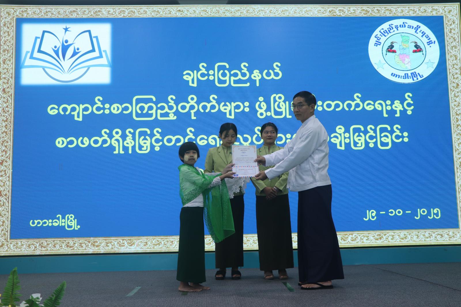 ကျောင်းစာကြည့်တိုက်များဖွံ့ဖြိုးတိုးတက်ရေးနှင့် စာဖတ်ရှိန်မြှင့်တင်ရေးလှုပ်ရှားမှု ပုံပြင်ပြောပြိုင်ပွဲနှင့် ကဗျာရွတ်ဆိုပြိုင်ပွဲ ဆုချီးမြှင့်ခြင်းအခမ်းအနားကို အောက်တိုဘာလ ၂၉ ရက်နေ့ နံနက် ၁၀ နာရီက ဟားခါးမြို့၊ ချင်းပြည်နယ်အစိုးရအဖွဲ့ရုံးရှိ ပြည်နယ်အထွေထွေအုပ်ချုပ်ရေးဦးစီးဌာန အစည်းအဝေးခန်းမ၌ ကျင်းပသည်။