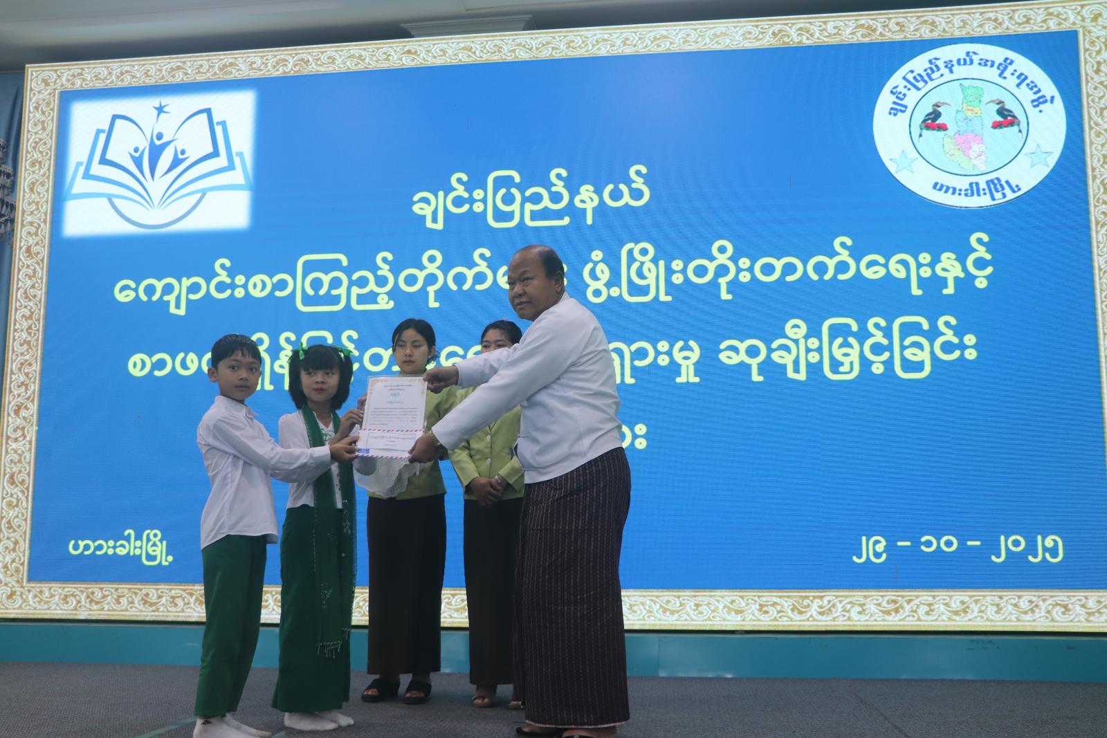 ယင်းနောက် ကျောင်းစာကြည့်တိုက်များဖွံ့ဖြိုးတိုးတက်ရေးနှင့်စာဖတ်ရှိန်မြှင့်တင်ရေးလှုပ်ရှားမှု အထက်အဆင့် ပုံပြင်ပြောပြိုင်ပွဲများတွင် ပထမ ၊ ဒုတိယ ၊ တတိယဆု ရရှိသူများကို ခေတ္တပြည်နယ် ဝန်ကြီးချုပ် ၊ လုံခြုံရေးနှင့်နယ်စပ်ရေးရာဝန်ကြီး ဗိုလ်မှူးကြီး ခင်မောင်ထွေးကလည်းကောင်း ၊ အလယ်တန်းအဆင့် ပုံပြင်ပြောပြိုင်ပွဲများတွင် ပထမ ၊ ဒုတိယ ၊ တတိယရရှိသူများကို ပြည်နယ်တရား လွှတ်တော်တရားသူကြီးချုပ် ဦးနေစိုးကလည်းကောင်း၊ မူလတန်းအဆင့် ပုံပြင်ပြောပြိုင်ပွဲတွင် ပထမ၊ ဒုတိယ ၊ တတိယရရှိသူများကို စီးပွားရေးရာဝန်ကြီး ဒေါက်တာလျန်ဇခုပ်ကလည်းကောင်း ၊ အလယ်တန်းအဆင့် ကဗျာရွတ်ဆိုပြိုင်ပွဲတွင် ပထမ ၊ ဒုတိယ ၊ တတိယရရှိသူများကို သယံဇာတရေးရာဝန်ကြီး ဦးကောလ်လျန်ထန်းကလည်းကောင်း ၊ မူလတန်း (အထက်) အဆင့် ကဗျာရွတ်ဆိုပြိုင်ပွဲတွင် ပထမ ၊ ဒုတိယ ၊ တတိယ ရရှိသူများကို လမ်းပန်းဆက်သွယ်ရေးဝန်ကြီး ဦးနေလင်းအောင်ကလည်းကောင်း ၊ မူလတန်း ( အောက် ) အဆင့် ကဗျာရွတ်ဆိုပြိုင်ပွဲတွင် ပထမ ၊ ဒုတိယ ၊ တတိယ ရရှိသူများကို တိုင်းရင်းသားရေးရာဝန်ကြီး ဦးစိန်ထွန်းလှကလည်းကောင်း ဂုဏ်ပြုမှတ်တမ်းလွှာနှင့် ဆုငွေများ ပေးအပ်ချီးမြှင့်ကြပြီး ပြန်ကြားရေးနှင့်ပြည်သူ့ဆက်ဆံရေးဦးစီးဌာန၊ ချင်းပြည်နယ်ဦးစီးမှူး ဦးခမ်လျန်ဆုမ်းက ကျောင်းစာကြည့်တိုက်များဖွံ့ဖြိုးတိုးတက်ရေးနှင့်စာဖတ်ရှိန်မြှင့်တင်ရေးလှုပ်ရှားမှု ပုံပြင်ပြောပြိုင်ပွဲနှင့် ကဗျာရွတ်ဆိုပြိုင်ပွဲကျင်းပနေမှုနှင့်ပတ်သက်၍ ရှင်းလင်းတင်ပြ၍ ဆုချီးမြှင့်ခြင်း အခမ်းအနား အောင်မြင်စွာ ရုပ်သိမ်းခဲ့ကြောင်း သိရသည်။