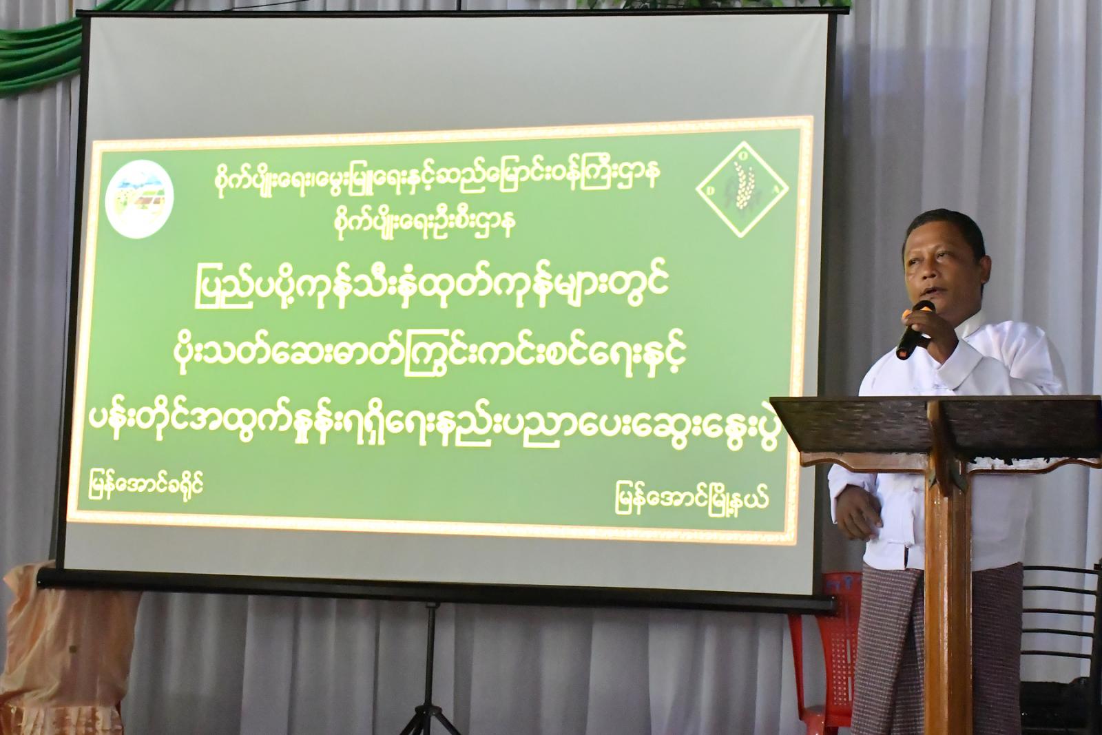 ဆက်လက်၍ Htet Myanmar Land Co.ltd မန်နေဂျင်းဒါရိုက်တာ ဦးထက်ညီလင်းက စိုက်ပျိုးရေးသုံးဆေးဝါးများမိတ်ဆက်ခြင်းနှင့် Golden Sun ကုမ္ပဏီမှတာဝန်ခံ ဦးစည်သူမြင့်က သီးနှံများအလိုက်ကျရောက်တတ်သော ပိုးမွှားများအကြောင်း အသိပညာပေးဆွေးနွေးပြောကြားပြီး စိန်သီဟစိုက်ပျိုးရေးဆေးဆိုင်မှ ဦးပြည့်သာထွန်းက မတ်ပဲပင်သေ၊ ပင်ညှိုးရောဂါအကြောင်း အသိပညာပေးဆွေးနွေးပြောကြား၍အခမ်းအနားသို့ တက်ရောက်ကြသည့် ဌာနဆိုင်ရာအကြီးအကဲများနှင့် တောင်သူများအား ကျေးဇူးတင်စကားပြောကြားခဲ့သည်။