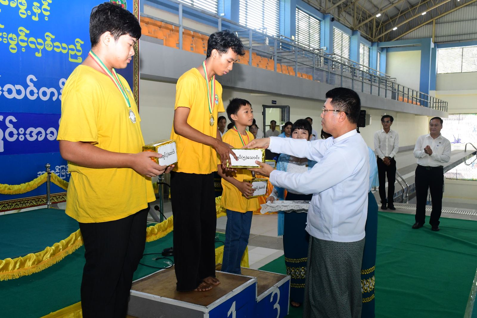 ထို့နောက် တိုင်းဒေသကြီးဝန်ကြီးချုပ်က သင်တန်းသား၊ သင်တန်းသူများအား သင်တန်းဆင်းလက်မှတ်များကို လည်းကောင်း၊ အမျိုးသားU-12 မီတာ(၅၀)အလွတ်ကူးပြိုင်ပွဲ၊ အမျိုးသားမီတာ(၅၀)ပက်လက်ကူးပြိုင်ပွဲ၊ အမျိုးသားမီတာ(၅၀) ရင်ဘောင်တန်းကူးပြိုင်ပွဲ၊ အမျိုးသားမီတာ(၅၀)လိပ်ပြာကူးပြိုင်ပွဲ၊ အမျိုးသား မီတာ(၅၀)အလွတ်ကူးပြိုင်ပွဲနှင့် အမျိုးသားဒိုင်ဗင်ပြိုင်ပွဲများတွင် ပထမ၊ ဒုတိယ၊ တတိယဆုရရှိသူများအား တစ်ဦးချင်းဆုတံဆိပ်များနှင့် ဂုဏ်ပြုချီးမြှင့်ငွေများကိုလည်းကောင်း၊ နည်းပြအဖွဲ့များအား ဂုဏ်ပြုချီးမြှင့်ငွေများကိုလည်းကောင်း၊ အမျိုးသမီးမီတာ(၅၀)လက်ပစ်ကူးပြိုင်ပွဲ၊ အမျိုးသမီးမီတာ(၅၀) ရင်ဘောင်တန်းကူးပြိုင်ပွဲ၊ အမျိုးသမီးမီတာ(၅၀)လိပ်ပြာကူးပြိုင်ပွဲ၊ အမျိုးသမီးမီတာ(၅၀)အလွတ်ကူးပြိုင်ပွဲ၊ အမျိုးမီးဒိုင်ဗင်ပြိုင်ပွဲတွင် ပထမ၊ ဒုတိယနှင့် တတိယဆုရရှိသူများအား တစ်ဦးချင်းဆုတံဆိပ်များနှင့် ဂုဏ်ပြုချီးမြှင့်ငွေများကို တိုင်းဒေသကြီးတရားကြီးချုပ်နှင့် တိုင်းဒေသကြီးဥပဒေချုပ်တို့ကလည်းကောင်း ဆုများအသီးသီးချီးမြှင့်ခဲ့ပြီးနောက် တိုင်းဒေသကြီးဝန်ကြီးချုပ်သည် သင်တန်းသားများ၏ ရေကူးနှင့် ဒိုင်ဗင်သရုပ်ပြသမှုများကို ကြည့်ရှုအားပေးခဲ့ကြောင်းနှင့် သင်တန်းကိုယခုလ(၁၀)ရက်နေ့မှ (၃၀)ရက်နေ့အထိ ဖွင့်လှစ်သင်ကြားပေးခဲ့ကြောင်းသိရသည်။
