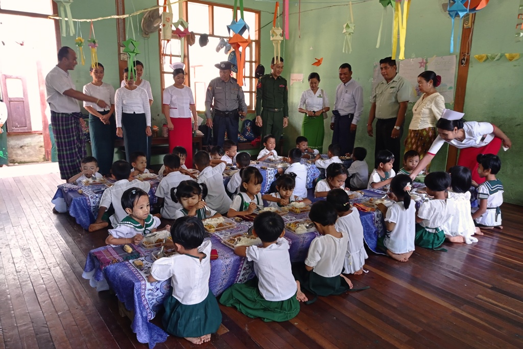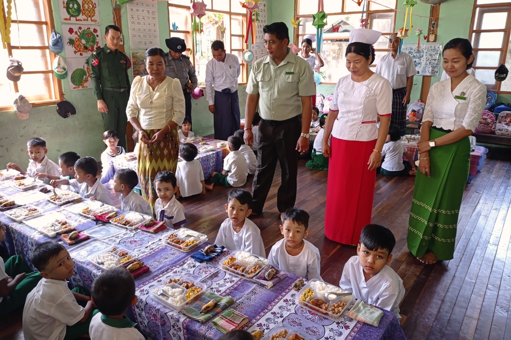 အဆိုပါ ကျောင်းကျန်းမာရေးသီတင်း ပတ်အဖြစ် KG ကျောင်းသား၊ ကျောင်းသူလေးများအား အာဟာရကျွေးမွေးရာသို့ မြို့နယ်စီမံခန့်ခွဲရေးနှင့်အုပ်ချုပ်ရေးကော်မတီ ဥက္ကဋ္ဌ ဦးစိုးဝင်းနှင့် အဖွဲ့ဝင်များ၊ မြို့နယ်ကျန်းမာရေးမှူး-၁ ဦးထွန်းဇော်လင်း ဦးဆောင်သည့် ကျန်းမာရေးဝန်ထမ်းများ၊ တာဝန်ခံ မြို့နယ်ပညာရေးမှူး ဦးဟန်စိုးစိုးနှင့် ကျောင်းအုပ်ဆရာ/ဆရာမကြီးများ၊ ဆရာ/ဆရာမ များက ကြည့်ရှုအားပေးခဲ့ကြကြောင်း သိရသည်။