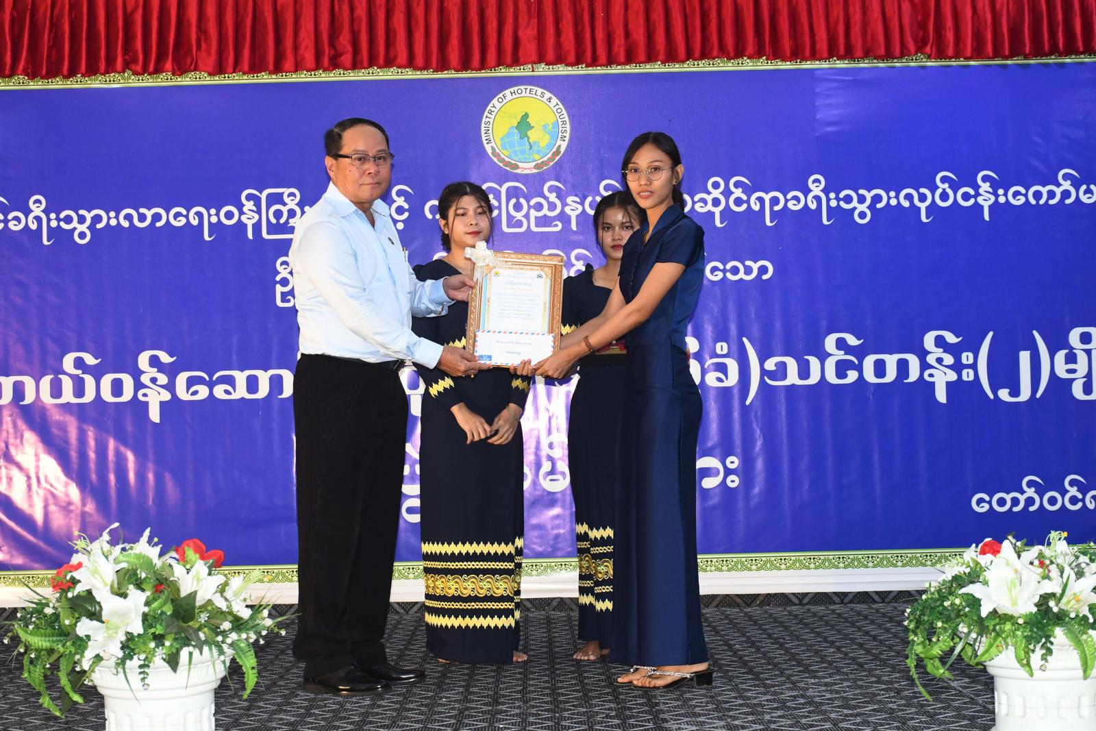 ထို့နောက် ပြည်နယ်ဝန်ကြီးချုပ်၊ ပြည်နယ်တရားလွှတ်တော်တရားသူကြီးချုပ်၊ ပြည်နယ်အစိုးရအဖွဲ့ဝင်များနှင့် တာဝန်ရှိသူများက ဟိုတယ်ဝန်ဆောင်မှုဆိုင်ရာ(အခြေခံ)သင်တန်း(၂)မျိုးတွင် သင်တန်းထူးချွန် ပထမ၊ ဒုတိယ၊ တတိယ ဆုရရှိကြသူများအား ဂုဏ်ပြုဆုများကိုလည်းကောင်း၊ သင်တန်းဆရာ (၄)ဦးအား ဂုဏ်ပြုဆုငွေနှင့်ဂုဏ်ပြုမှတ်တမ်းလွှာများကိုလည်းကောင်း၊ သင်တန်းဆင်း သင်တန်းသား၊ သင်တန်းသူများအား သင်တန်းဆင်းအောင်လက်မှတ်များကို လည်းကောင်း အသီးသီးပေးအပ်ချီးမြှင့်ခဲ့ ကြပြီး စုပေါင်းမှတ်တမ်းဓာတ်ပုံများရိုက်ကူးကြကာ ပြည်နယ်ဝန်ကြီးချုပ်နှင့် တာဝန်ရှိသူများသည် သင်တန်းသား၊သင်တန်းသူများအား ရင်းနှီးနွေးထွေးစွာတွေ့ဆုံနှုတ်ဆက်၍ အားပေးစကားများ ပြောကြားခဲ့ကြောင်း သိရသည်။