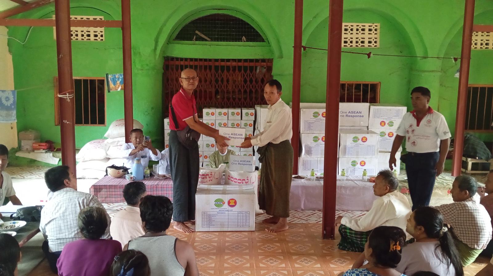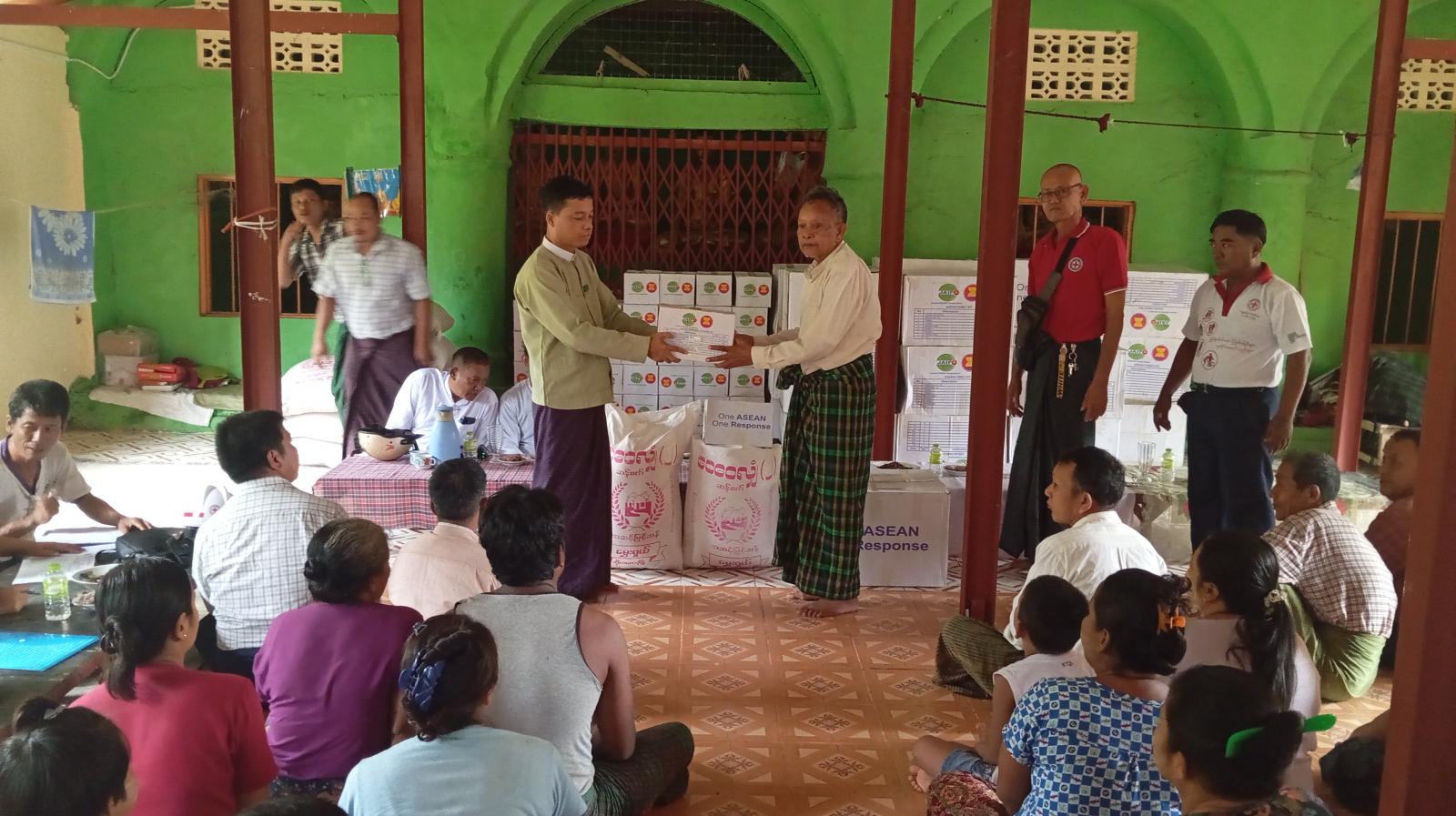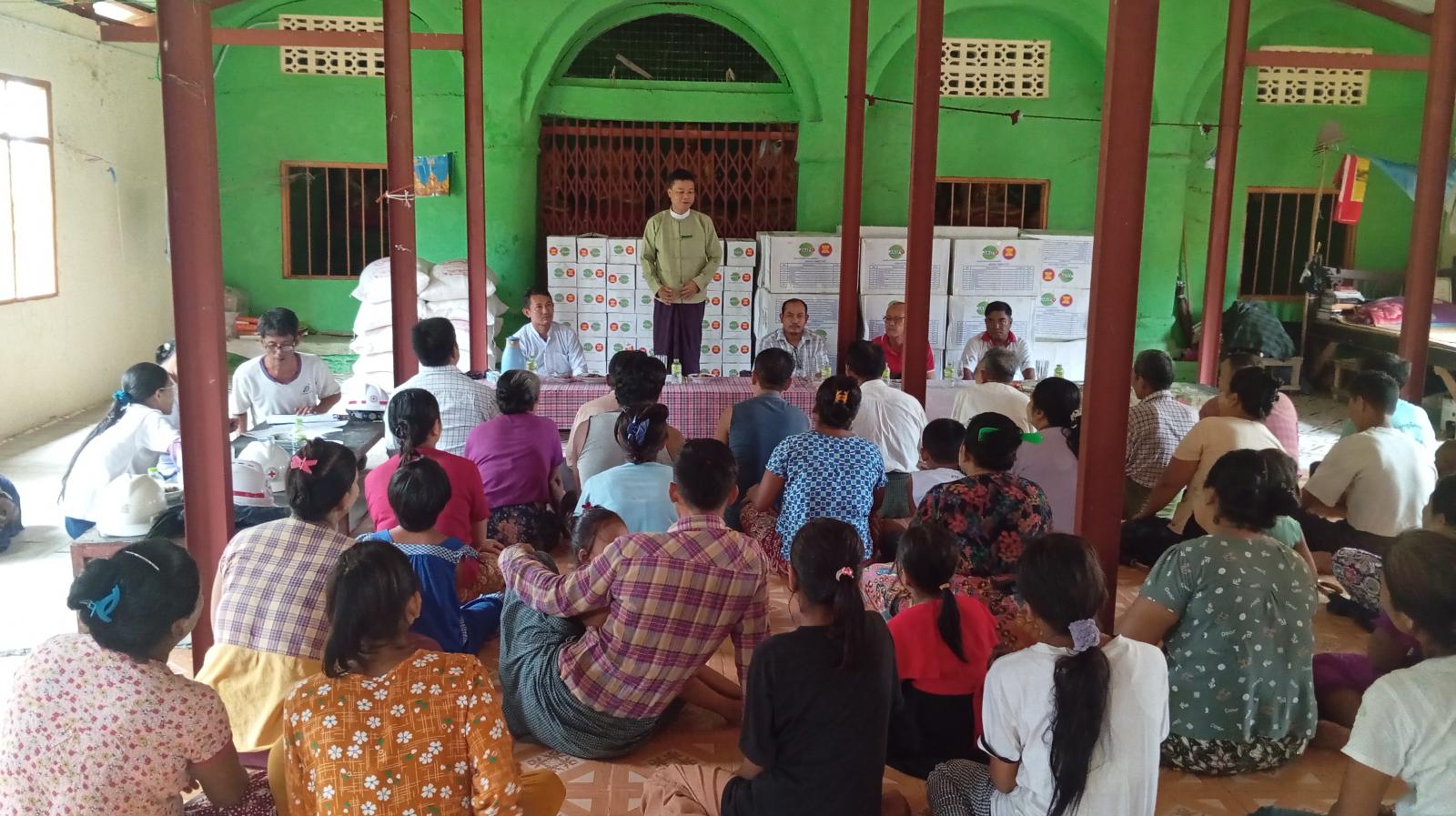 ဦးစွာ ဒုတိယမြို့နယ်အုပ်ချုပ်ရေးမှူး ဦးအောင်မျိုးကျော်က ယာယီနေရပ်စွန့်ခွာပြည်သူများအား ဆန်နှင့် မိသားစုသုံးပစ္စည်းများပေးအပ်ခြင်းနှင့်ပတ်သက်၍ ရှင်းလင်းပြောကြားသည်။ ဆက်လက်၍ ဒုတိယမြို့နယ်အုပ်ချုပ်ရေးမှူး ဦးအောင်မျိုးကျော်နှင့် မြန်မာနိုင်ငံ ကြက်ခြေနီအသင်းက တာဝန်ရှိသူများက ယာယီနေရပ်စွန့်ခွာ အိမ်ထောင်စု(၂၆)စုအား အိမ်ထောင်စုတစ်စုလျှင်ဆန်နှစ်အိတ်၊ မိသားစုတစ်ကိုယ်ရေသုံးပစ္စည်းများအား လက်ဝယ်အရောက် ပေးအပ်ခဲ့ကြောင်း သိရသည်။