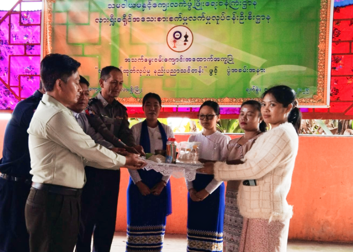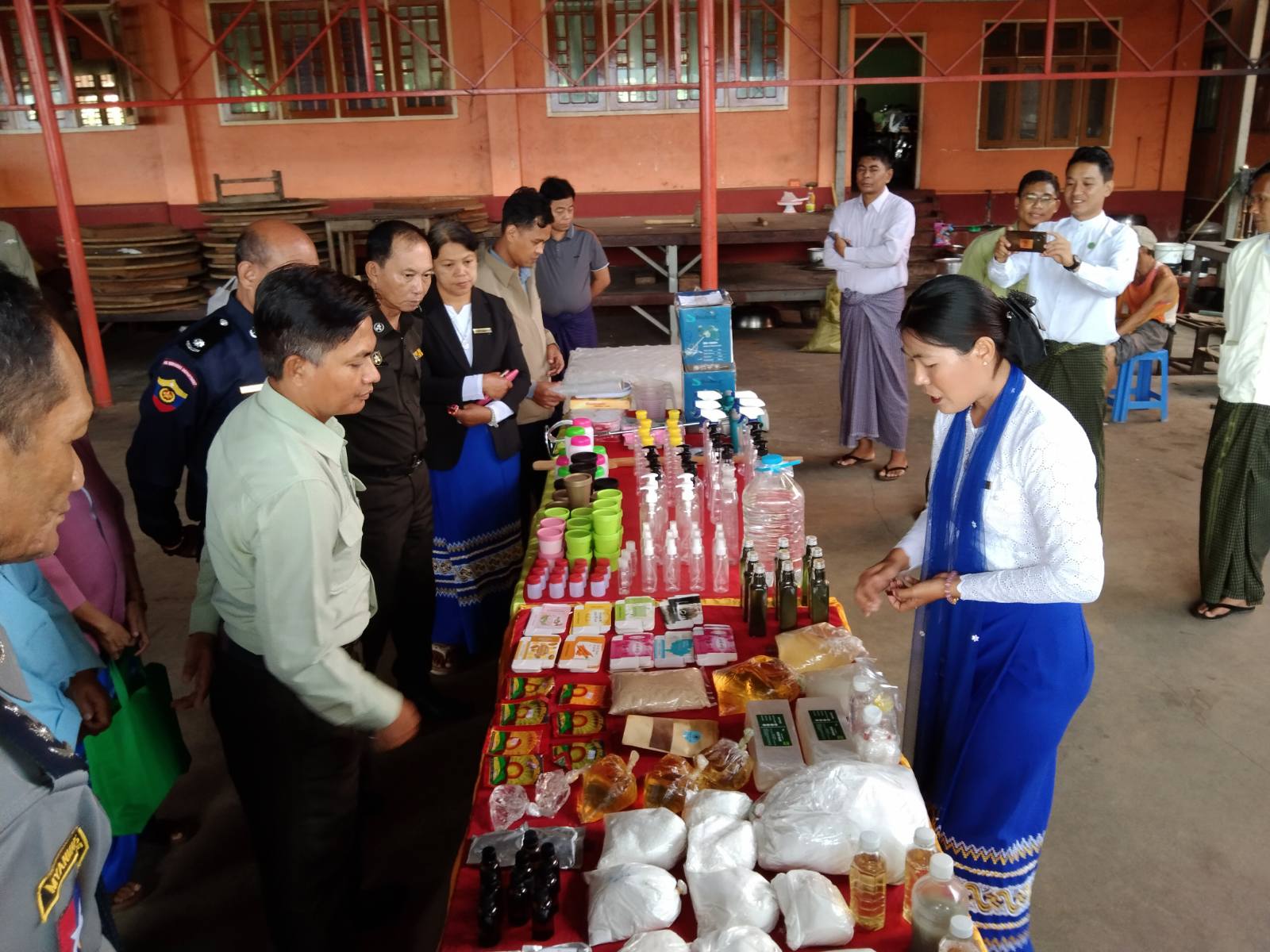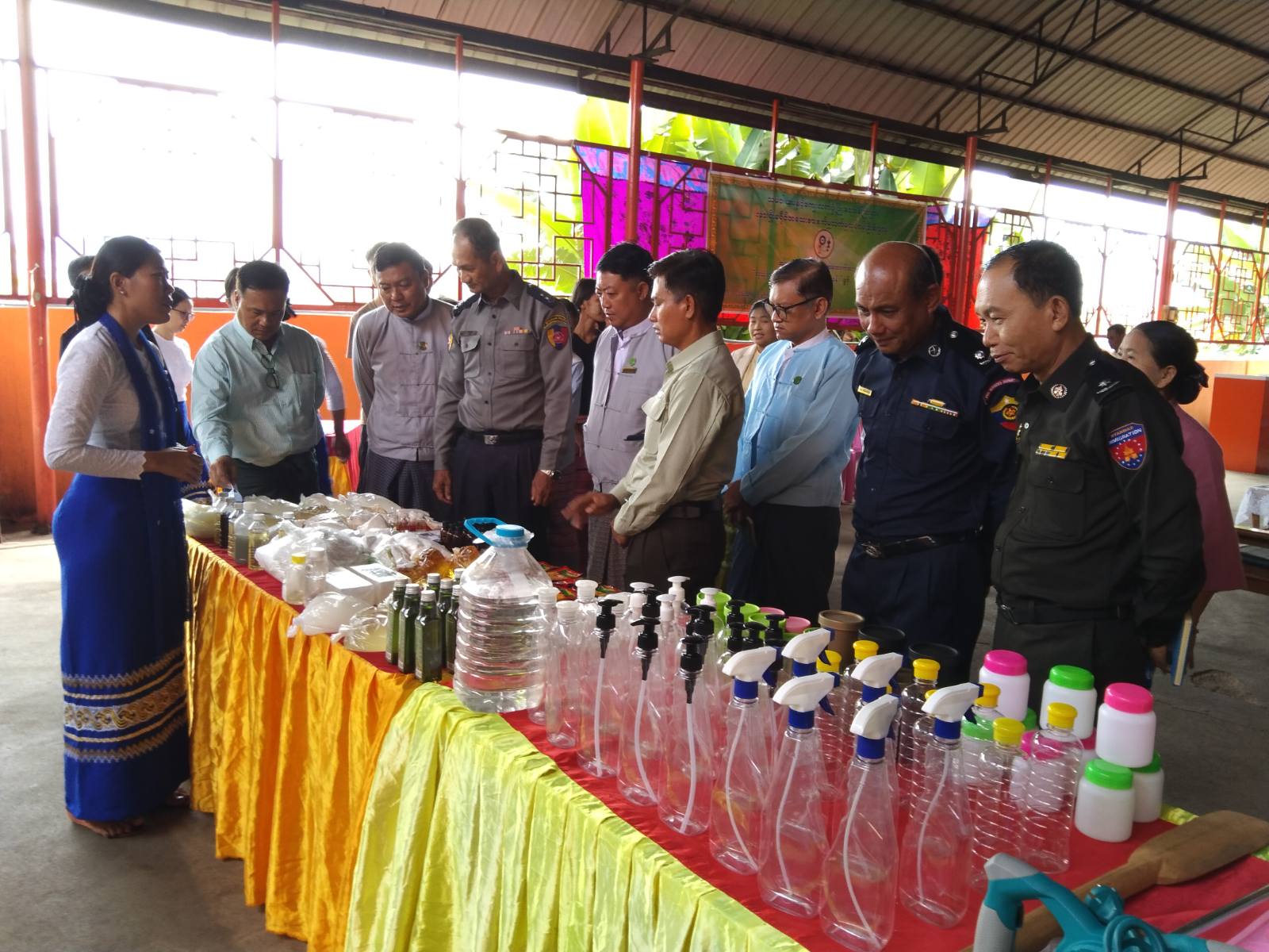 ထို့နောက် ခရိုင်စီမံခန့်ခွဲရေးနှင့်အုပ်ချုပ်ရေးကော်မတီဥက္ကဋ္ဌနှင့် ဌာနဆိုင်ရာတာဝန်ရှိသူများက လူသုံးကုန်ထုတ်လုပ်မှုနည်းပညာသင်တန်းအတွက် သင်သန်းသား၊ သင်တန်းသူများလက်ဝယ်သို့ ကုန်ကြမ်းပစ္စည်းများ အသီးသီးပေးအပ်ခဲ့သည်။