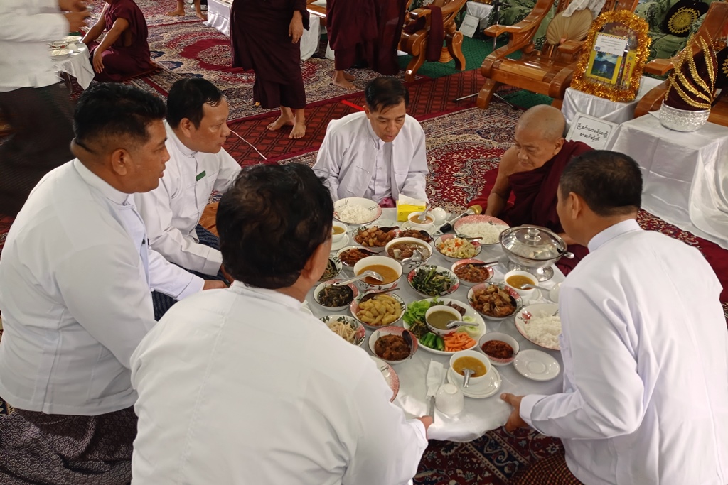 ထို့နောက် ဆရာတော်သံဃာတော် အရှင်သူမြတ်များထံမှ မေတ္တာသုတ်အစရှိသော ပရိတ်တရားတော်များကို နာယူကြည်ညိုကြကာ ဂန့်ဂေါမြို့၊ မြို့ခင်းသာပရိယတ္တိစာသင်တိုက် မြို့နယ်သံဃနာယကအဖွဲ့ဥက္ကဋ္ဌ ဆရာတော် အဂ္ဂမဟာဂန္တဝါစကပဏ္ဍိတ ဘဒ္ဒန္တဇဋိလအမှူးပြုသည့် ဆရာတော် သံဃာတော် အရှင်သူမြတ်များထံသို့ ကထိန်လျာသင်္ကန်းနှင့်လှူဖွယ်ဝတ္ထုပစ္စည်းများကို ခရိုင်စီမံခန့်ခွဲရေးနှင့်အုပ်ချုပ်ရေး ကော်မတီခေတ္တဥက္ကဋ္ဌ ဒုတိယဗိုလ်မှူးကြီး ရဲရန်ပိုင်နှင့် ဇနီးဒေါ်စုမြတ်မွန်၊ ခရိုင်စီမံခန့်ခွဲရေးနှင့်အုပ်ချုပ်ရေး ကော်မတီအဖွဲ့ဝင်များ၊ မြို့နယ်စီမံခန့်ခွဲရေးနှင့်အုပ်ချုပ်ရေးကော်မတီဥက္ကဋ္ဌ ဦးစိုးဝင်းနှင့် ခရိုင်/မြို့နယ်အဆင့်ဌာနဆိုင်ရာတာဝန်ရှိသူများက ဆက်ကပ်လှူဒါန်းကြသည်။