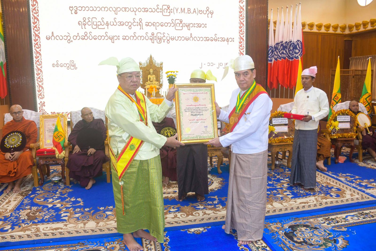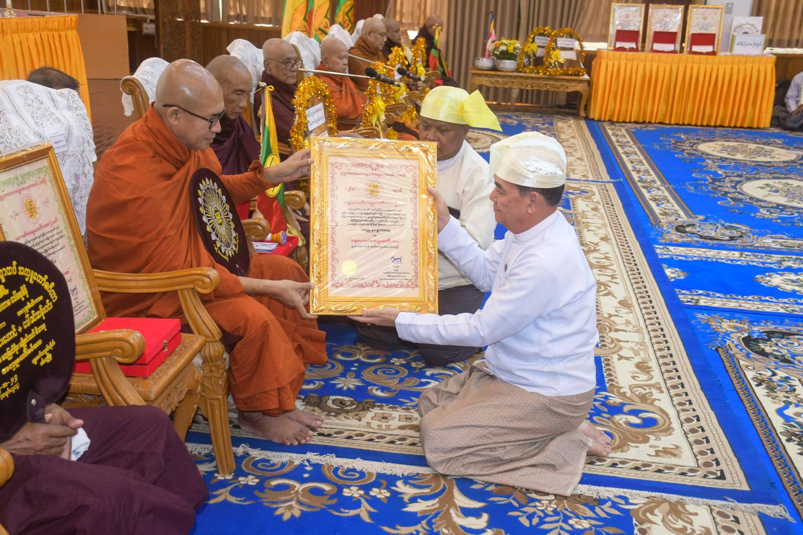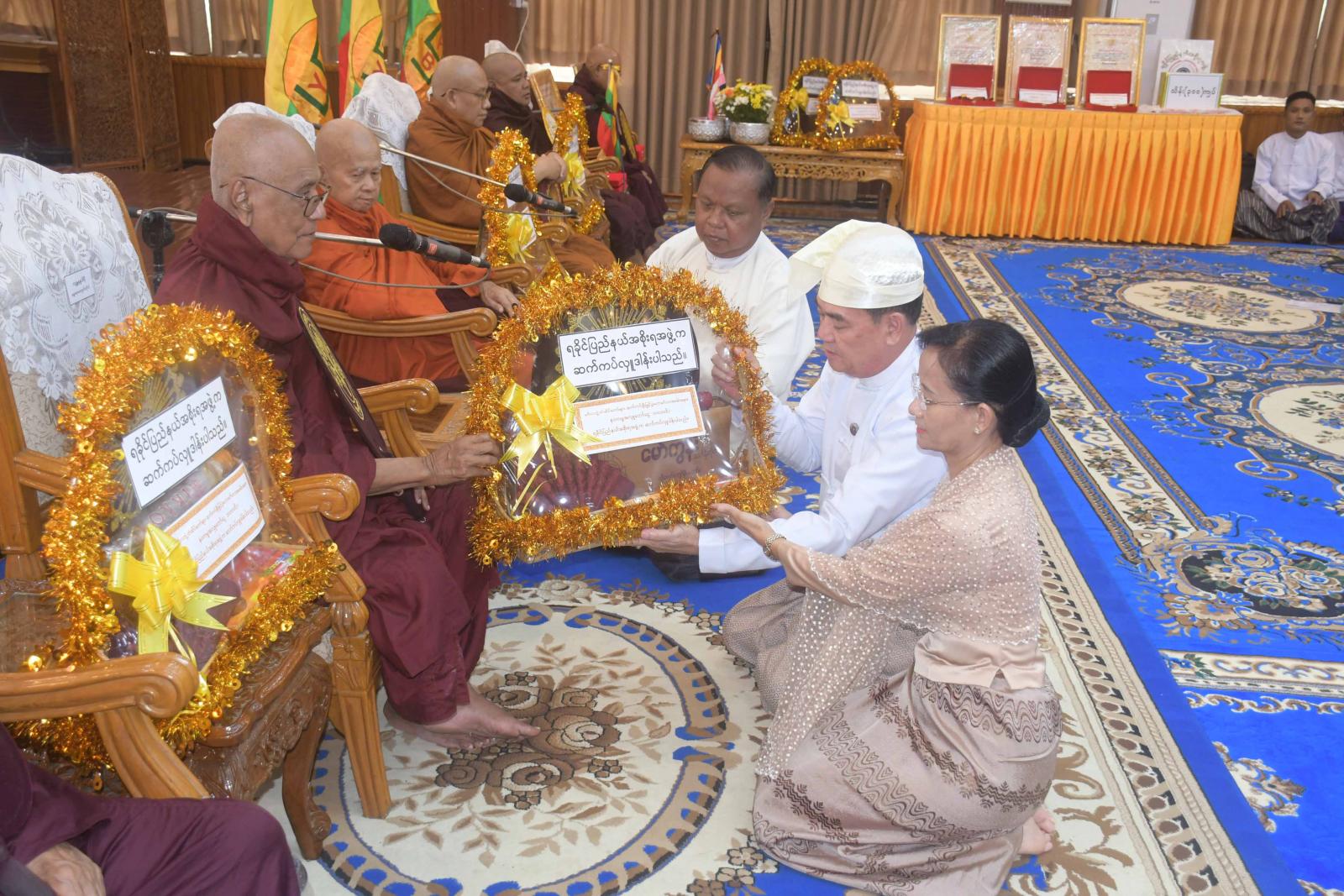 ထို့နောက် အဂ္ဂမဟာမင်္ဂလဓမ္မဇောတိကဓဇ ဘွဲ့တံဆိပ်တော် ရရှိကြသော ဆရာတော်ကြီး နှစ်ပါးနှင့် မဟာမင်္ဂလဓမ္မဇောတိကဓဇဘွဲ့တံဆိပ်တော်ရရှိကြသော ဆရာတော်ကြီးနှစ်ပါးတို့အား ပြည်နယ် ဝန်ကြီးချုပ် ဦးထိန်လင်း၊ ဗုဒ္ဓဘာသာကလျာဏယုဝအသင်းကြီး (Y.M.B.A) ဗဟို ဥက္ကဋ္ဌ ဦးရဲထွန်း၊ အနောက်ပိုင်းတိုင်း စစ်ဌာနချုပ် တိုင်းမှူး ဗိုလ်ချုပ် ကျော်စွာဦးနှင့် တာဝန်ရှိသူများက ဘွဲ့တံဆိပ်တော်များ ကပ်လှူပူဇော်ကြသည်။ ဆက်လက်၍ မဟာမင်္ဂလဓမ္မ ဇောတိကဓဇ ဘွဲ့တံဆိပ်တော်ရရှိသော လူပုဂ္ဂိုလ်တစ်ဦးနှင့် မင်္ဂလဓမ္မဇောတိကဓဇ ဘွဲ့တံဆိပ်တော်ရရှိ ကြသော လူပုဂ္ဂိုလ်(၂)ဦးတို့အား (Y.M.B.A)ဗဟို ဥက္ကဋ္ဌ ဦးရဲထွန်း၊ ပြည်နယ်ဝန်ကြီးချုပ် ဦးထိန်လင်းနှင့် တိုင်းမှူးတို့က ပေးအပ်ချီးမြှင့်ကြသည်။