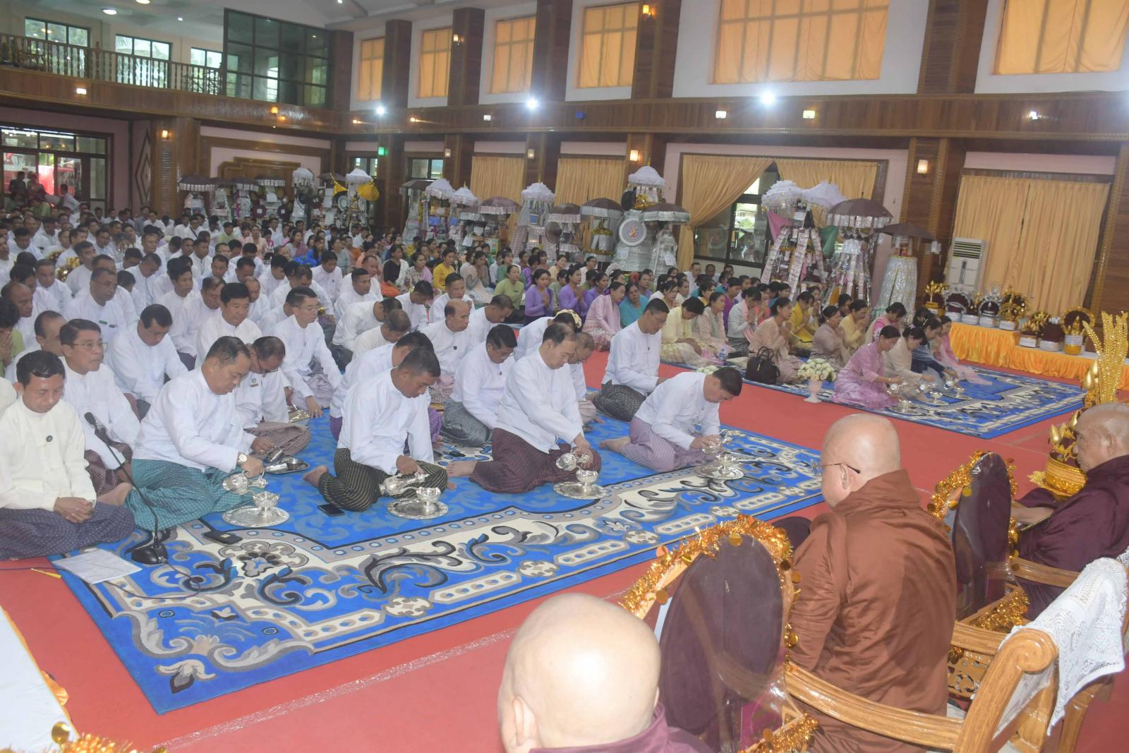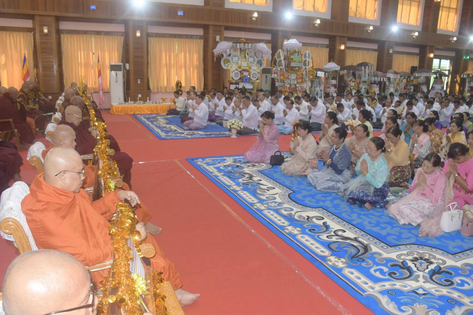ဆက်လက်၍ နန္ဒာရာမပရိယတ္တိစာသင်တိုက် ပဓာနနာယက၊ ပြည်နယ်ဩဝါဒါစရိယ၊ အဂ္ဂမဟာမင်္ဂလဓမ္မဇောတိကဓဇ၊ အဂ္ဂမဟာပဏ္ဍိတ၊ အဘိဓဇမဟာရဋ္ဌဂုရု ဘဒ္ဒန္တနန္ဒသိရီ မဟာ ထေရ်မြတ်ထံမှ ပြည်နယ်ဝန်ကြီးချုပ်အမှူးပြုသော ဧည့်ပရိသတ်များက ငါးပါးသီလခံယူ ဆောက်တည်ကြပြီး သံဃာတော်အရှင်သူမြတ်တို့က ပရိတ်တရားတော်များရွတ်ပွား ချီးမြှင့်တော် မူကြသည်။ ယင်းနောက် ပြည်နယ်ဝန်ကြီးချုပ် ဦးထိန်လင်းနှင့်ဇနီး ဒေါ်ဆွေဆွေမြတ်တို့က စစ်တွေမြို့၊ ကျောင်းထိုင်ဘုန်းကြီး သင်တန်းကျောင်း ဆရာတော်ထံသို့ ကထိန်လျာသင်္ကန်းအား ဆက်ကပ်လှူဒါန်းကြသည်။