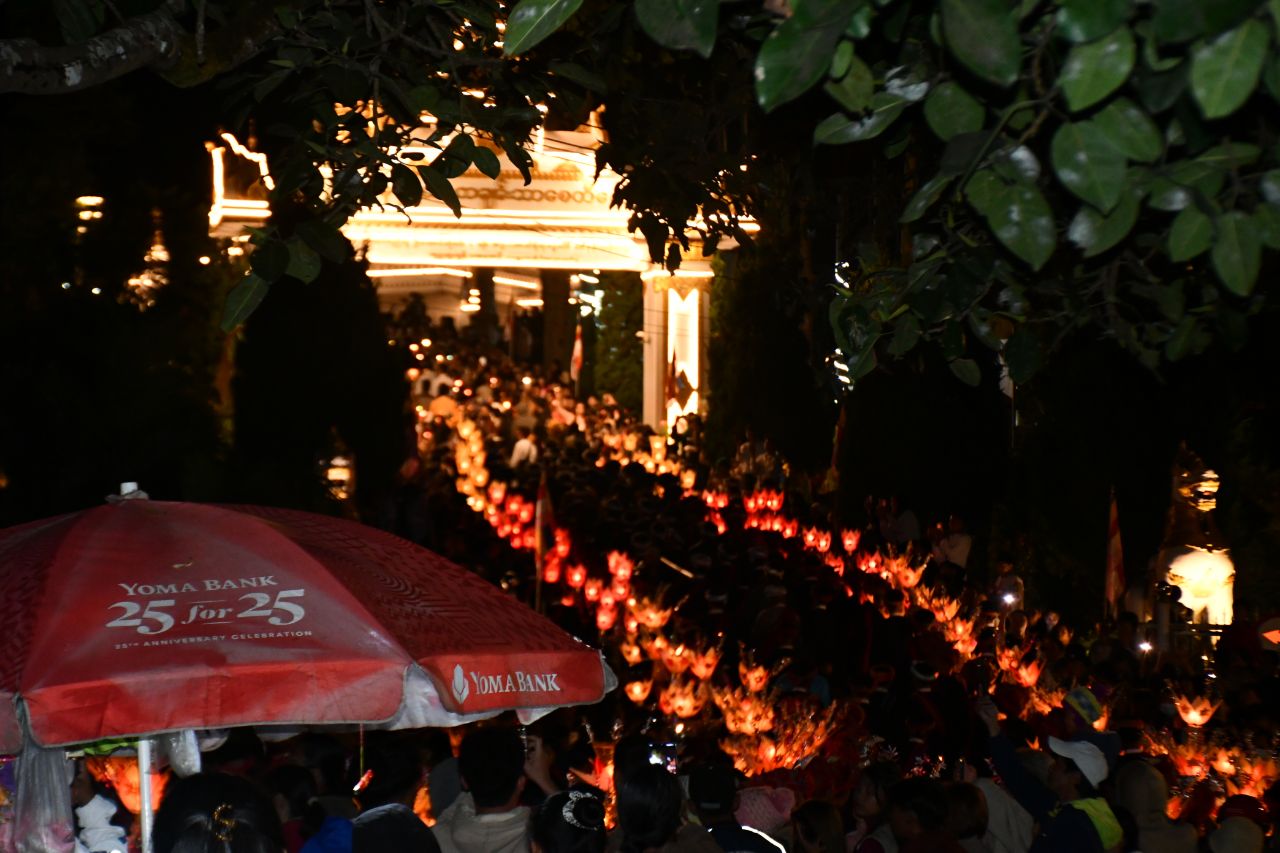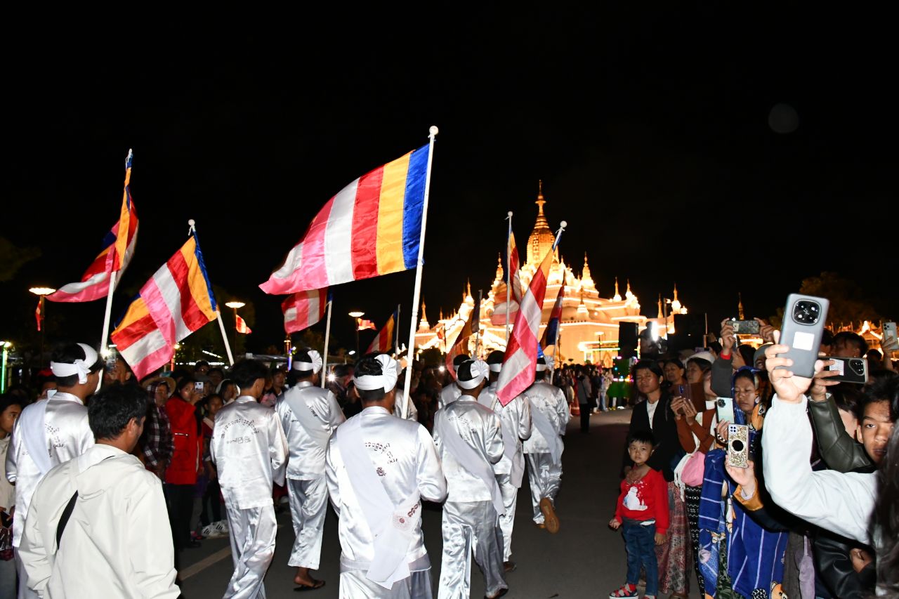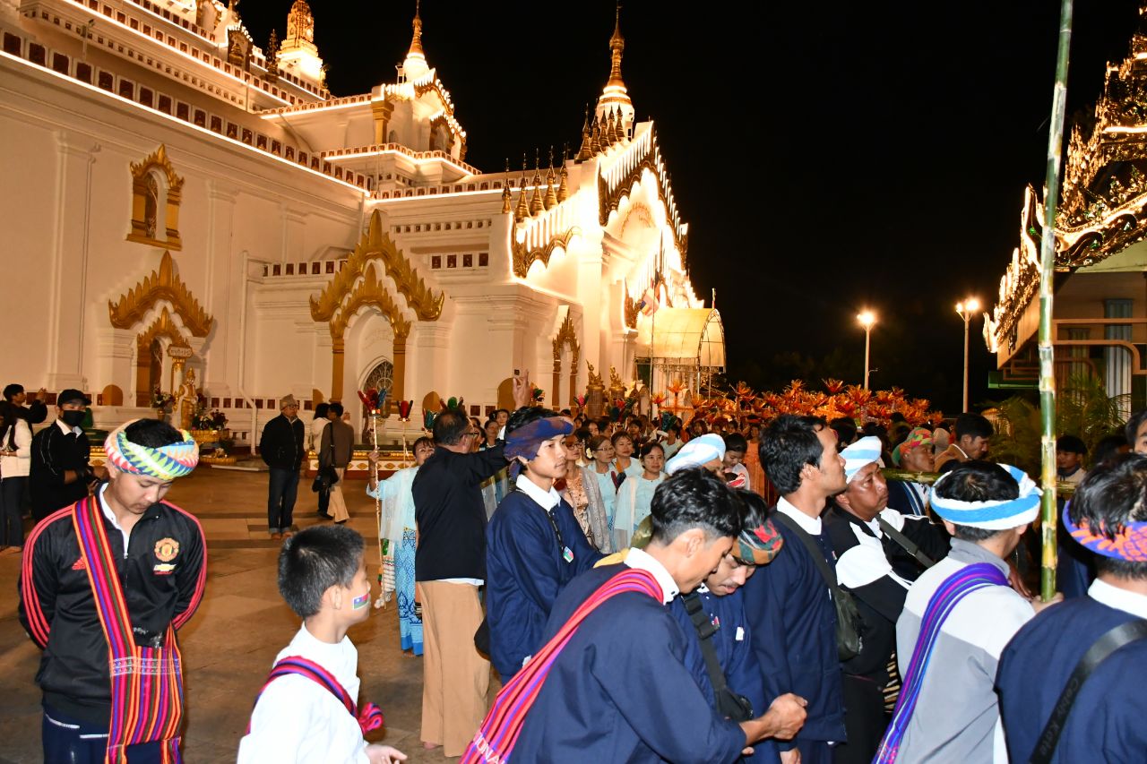 ထိုသို့ လှည့်လည်ပူဇော်ရာတွင် မြန်မာ့ရိုးရာ ဆိုင်းဝိုင်း(ဗျော)အတီး၊ အဆို၊ အကအဖွဲ့၊ ဝင်းအဖွဲ့၊ မြန်မာ၊ရှမ်း၊ပအိုဝ်း အစရှိသည့် လှပျိုဖြူများ အကအဖွဲ့၊ရှမ်း/ပအိုဝ်း အိုးစည်ဗုံမောင်းအဖွဲ့များနှင့် ကိန္နရီကိန္နရာအကအဖွဲ့များနှင့် တောင်ကြီးမြို့နယ်အတွင်းရှိ တိုင်းရင်းသား လူမျိုးများရိုးရာ အကအဖွဲ့တို့ ဦးဆောင်ကာ၊ တောင်ကြီးမြို့ ဗိုလ်ချုပ်ပန်းခြံရှေ့ မီးပွိုင့်လမ်းဆုံ လမ်းမကြီးအတိုင်းမှ စတင်စီတန်းလှည့်လည် ပူဇော်လာခဲ့ကြပြီးနောက် စူဠာမုနိလောကချမ်းသာ စေတီတော်မြတ် ကုန်းတော်ပေါ်အထိ မီးပဒေသာအလှအပမျိုးစုံ၊ တိုင်းရင်းသားရိုးရာအက ပေါင်းစုံတို့ဖြင့် မြိုင်မြိုင်ဆိုင်ဆိုင် စုပေါင်းလှည့်လည် ပူဇော်မှုပြုခဲ့ကြသည်။
