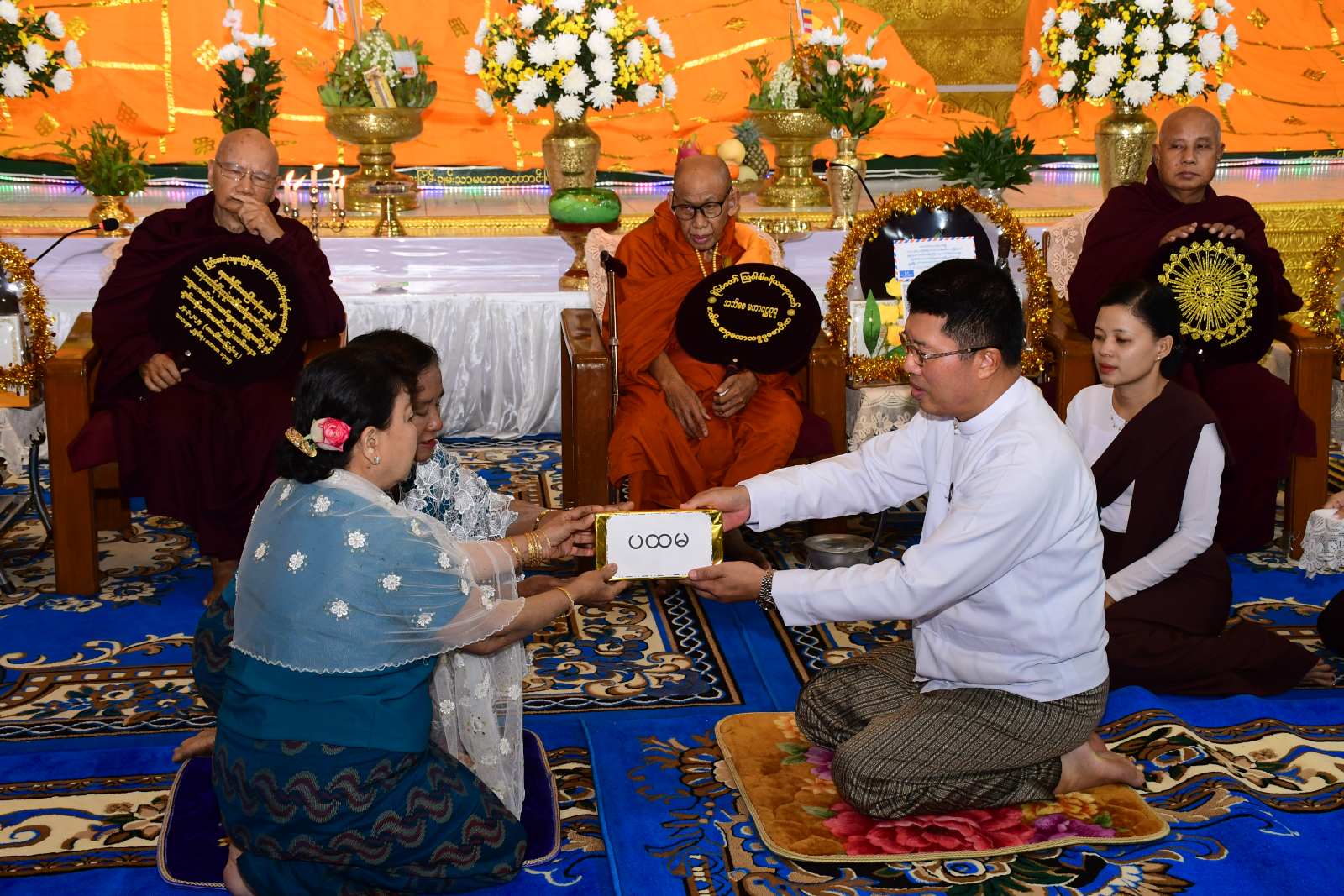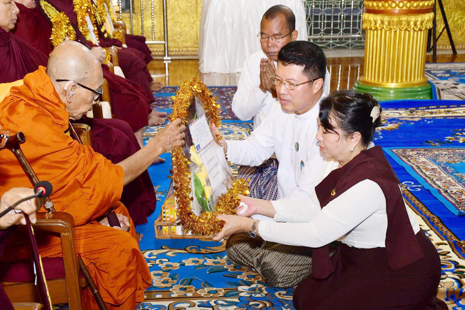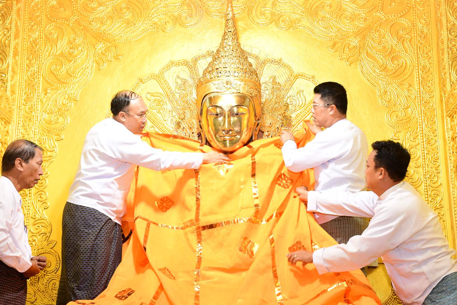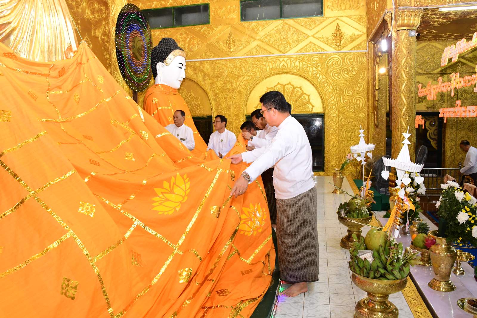 ဦးစွာ တိုင်းဒေသကြီးဝန်ကြီးချုပ်သည် ရွှေမုဋ္ဌောမဟာစေတီတော်မြတ်ကြီး၏ ဦးမောင်ကြီး တန်ဆောင်းတွင် ဆီမီး၊ ပန်း၊ ရေချမ်းကပ်လှူပြီး တာဝန်ရှိသူများနှင့်အတူ ဦးမောင်ကြီးတန်ဆောင်းရှိ အေးငြိမ်းချမ်းသာဗုဒ္ဓရုပ်ပွား ဆင်းတုတော်မြတ်ကြီးနှင့် ဗုဒ္ဓပြတိုက်အတွင်းရှိ မဟာမုနိဗုဒ္ဓရုပ်ပွား ဆင်းတုတော်မြတ်ကြီးအား မသိုးသင်္ကန်းတော်ဆက်ကပ်လှူဒါန်းခဲ့ပြီးနောက် ဆရာတော်ကြီးများ အား အရုဏ်ဆွမ်း ဆက်ကပ်လှူဒါန်းခဲ့သည်။